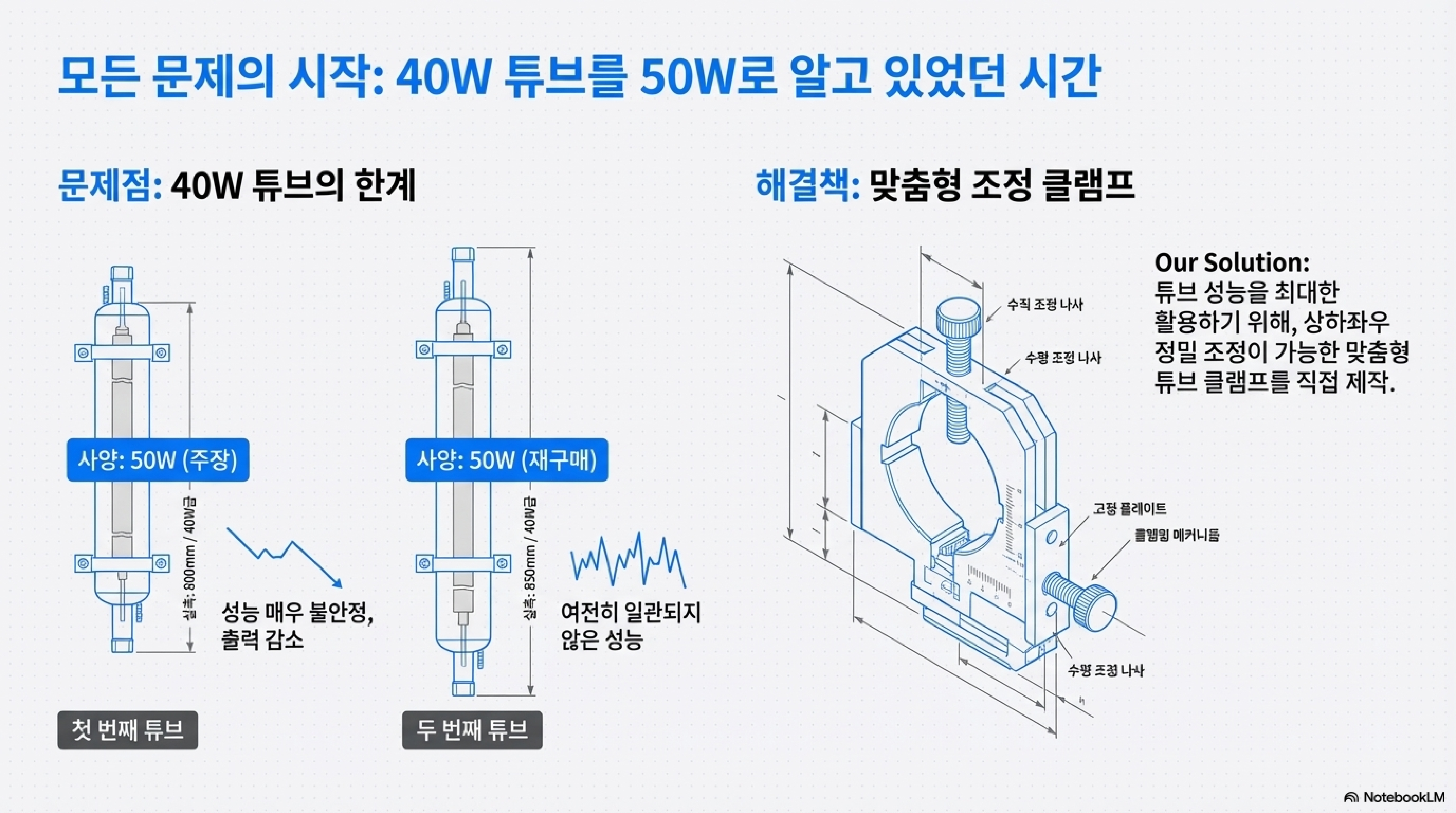 더 놀라운 점은 이것이 일회성 실수가 아니었다는 것입니다. 그는 문제를 해결하기 위해 새로 '50W' 튜브를 주문하여 교체했지만, 이 역시 길이가 850mm인 40W 튜브였습니다. 두 번 연속으로 잘못된 스펙의 부품을 받은 것입니다. 이는 저가형 시장에서 흔하게 발생할 수 있는 문제임을 시사합니다.