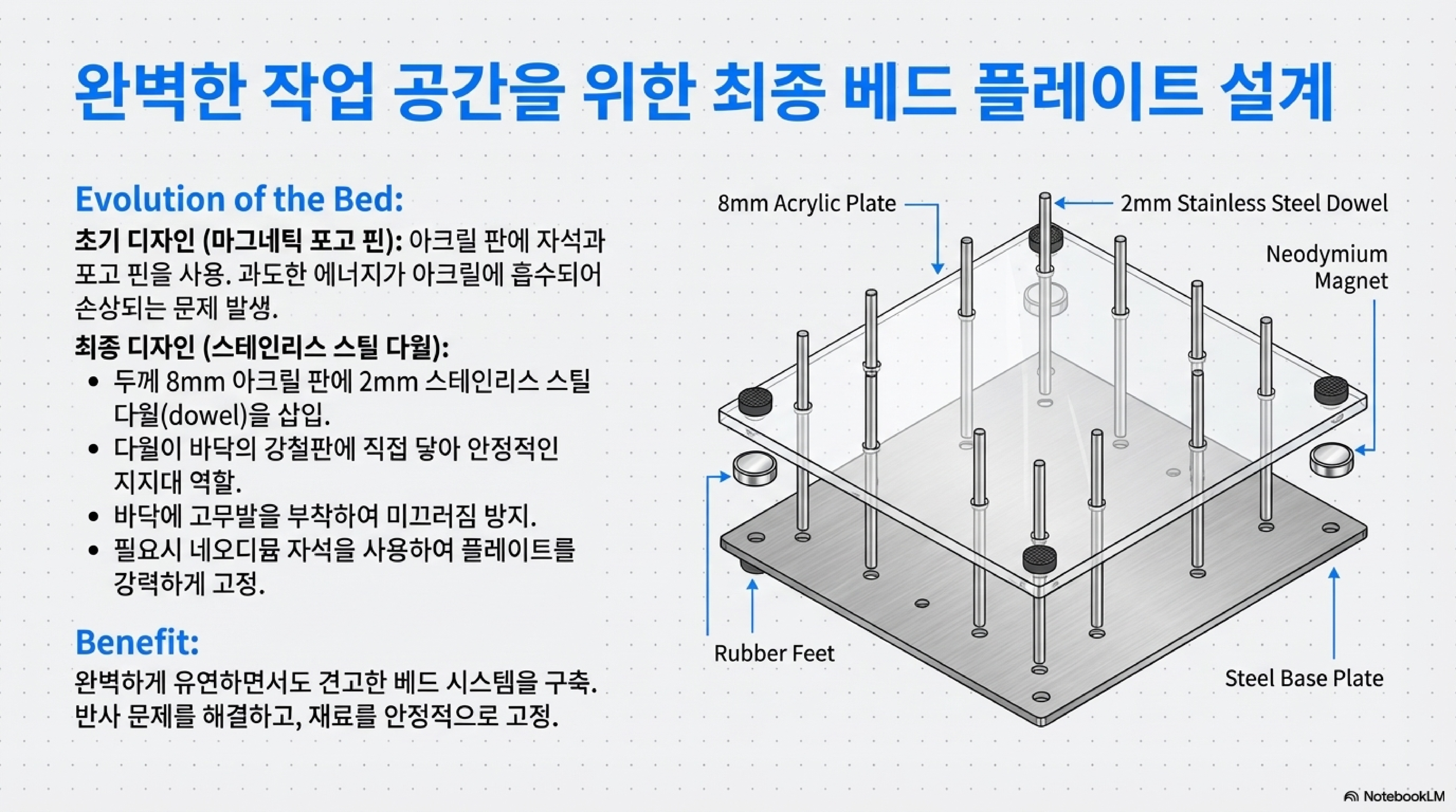 - 작업대(Bed Plate): 처음 사용했던 자석과 포고 핀 방식에서 한 단계 더 나아가, 스테인리스 스틸 다웰과 아크릴 판을 사용하는 방식으로 작업대를 개선했습니다. 이를 통해 반사를 줄이고 어떤 크기의 재료도 안정적으로 고정할 수 있는 유연성을 확보했습니다.