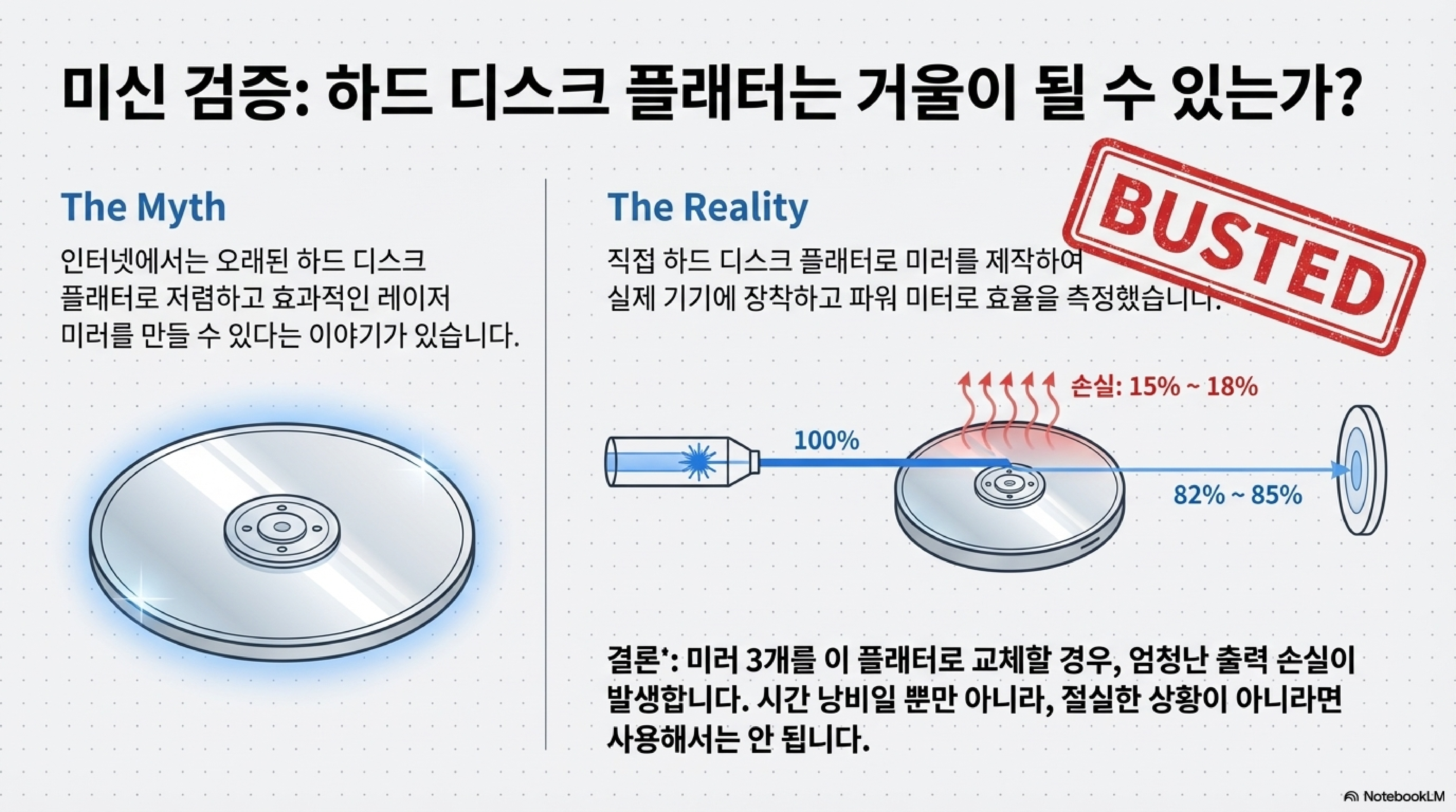 - 미러(Mirrors): 인터넷에 널리 퍼진 '하드디스크 플래터로 미러를 만들면 좋다'는 속설을 직접 검증했습니다. 결과는 82-85%에 불과한 형편없는 효율이었습니다. 그는 이 신화를 깨부수고, 직접 구리판을 가공하고 연마하여 99.5%의 놀라운 효율을 가진 미러를 만들어냈습니다.