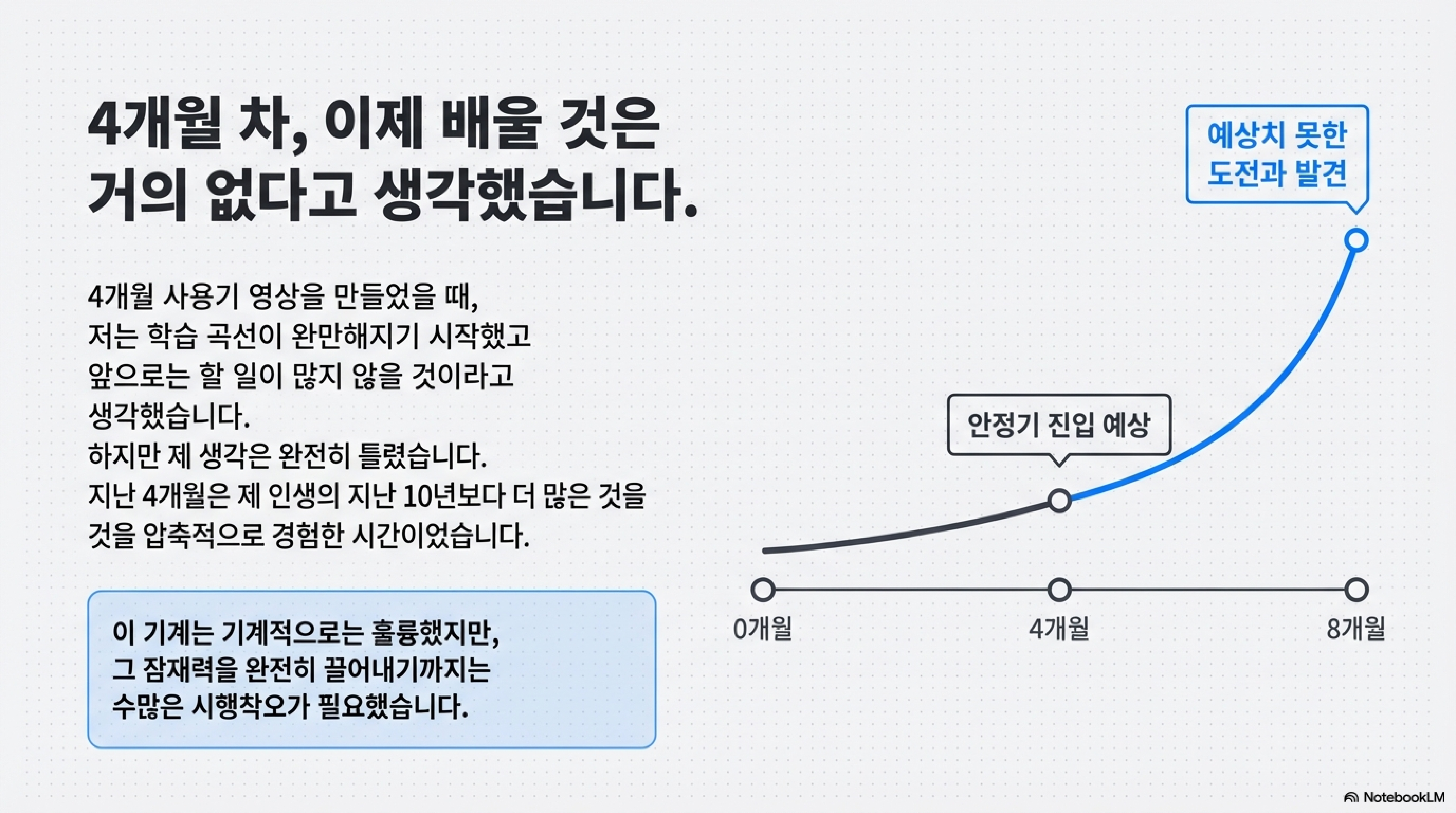 8개월의 여정은 기성 부품의 한계를 깨닫고, 이를 극복하기 위해 직접 부품을 제작하는 과정의 연속이었습니다. 이는 단순한 소비자에서 벗어나 측정된 문제를 해결하기 위해 기계를 재설계하는 진정한 '소유자'로 거듭나는 과정이었습니다. 앞서 발견된 8W의 에너지 손실은 전체 빔 경로에 대한 대대적인 조사의 기폭제가 되었습니다.