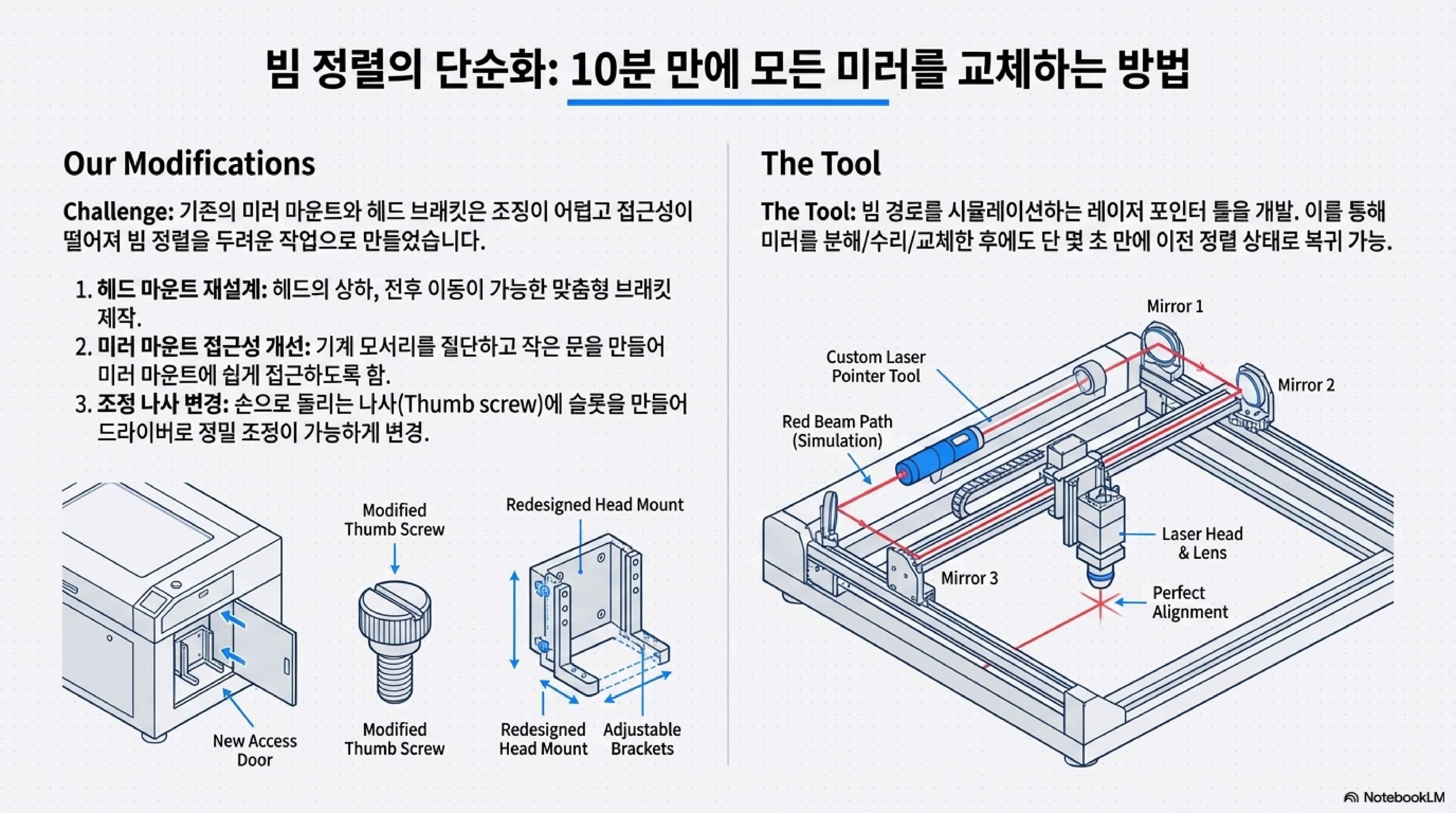 - 빔 정렬(Beam Alignment): 모두가 두려워하는 미러 정렬 작업을 "아주 쉬운" 일로 바꾸었습니다. 기존 마운트의 불편한 구조를 버리고 헤드 마운트와 미러 마운트를 직접 개조했으며, 심지어 케이스 일부를 잘라내 접근성을 극적으로 높였습니다.