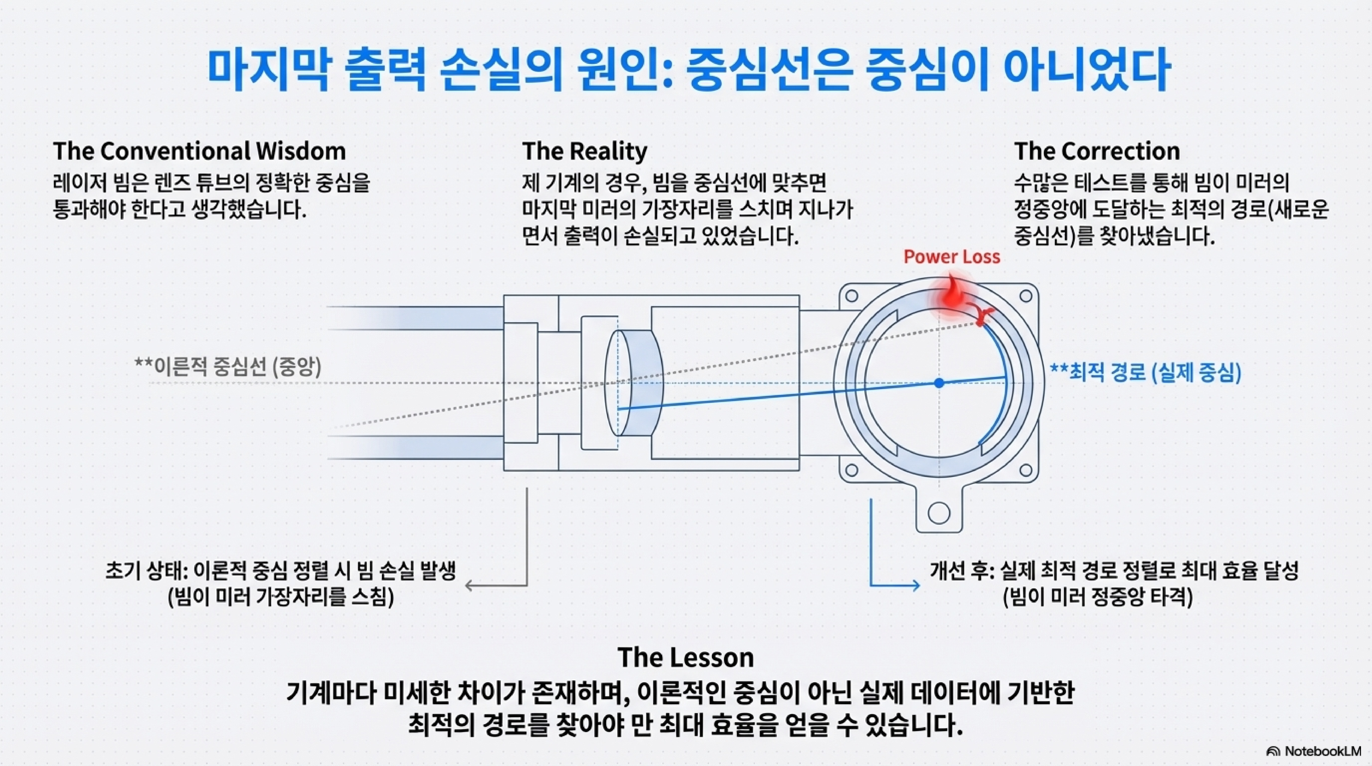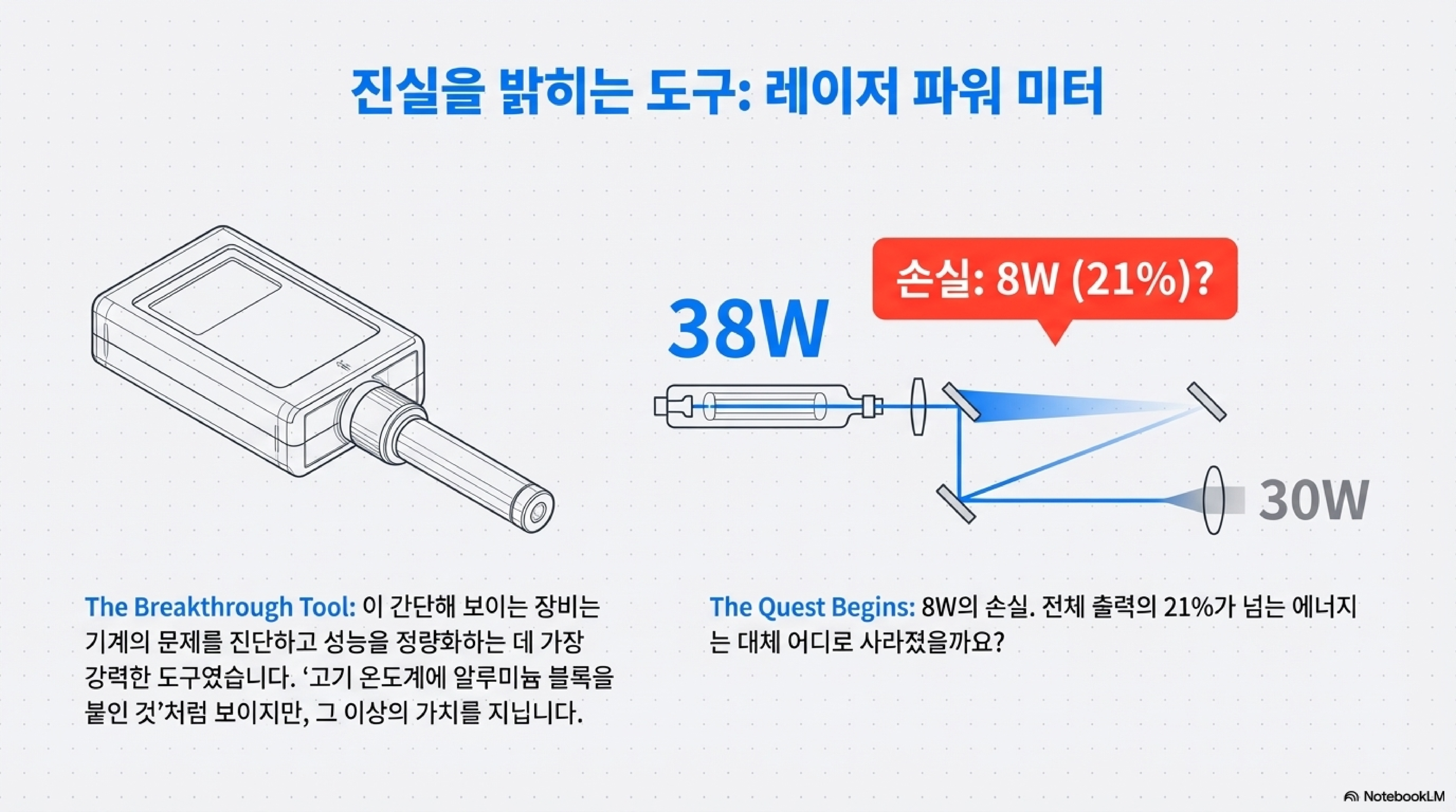 그가 "가장 강력한 도구 중 하나"라고 칭한 것은 바로 '레이저 파워 미터'였습니다. 이 간단해 보이는 측정 도구 하나가 문제의 핵심을 꿰뚫게 해주었습니다. 측정을 통해 그는 튜브에서 방출된 38W의 출력이 3개의 미러와 1개의 렌즈를 거쳐 노즐 끝에 도달했을 때 30W로 줄어든다는 사실을 발견했습니다. 무려 8W의 에너지가 광학 경로 어딘가에서 사라지고 있었던 것입니다.