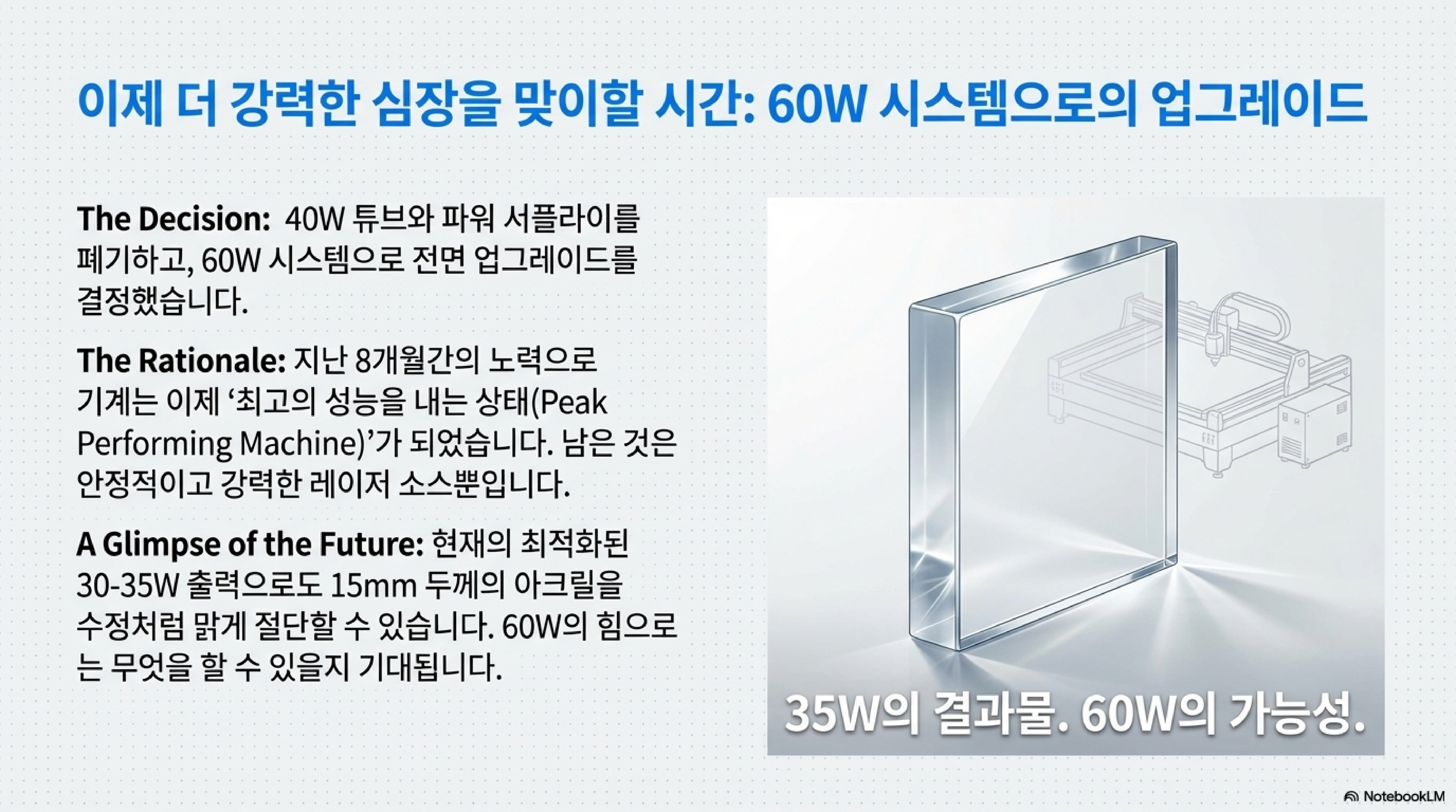 지난 8개월간의 여정은 단순히 고장 난 기계를 수리하는 과정이 아니었습니다. "기계적으로는 매우 훌륭한" 기반을 가진 이 장비의 잠재력을 마지막 한 방울까지 짜내는 치열한 최적화 과정이었습니다. 에너지 손실, 빔 정렬, 작업대 반사 등 모든 변수를 통제하고 기계의 모든 부분을 자신의 손으로 제어할 수 있게 되자, 그는 마침내 하나의 명확한 결론에 도달했습니다.