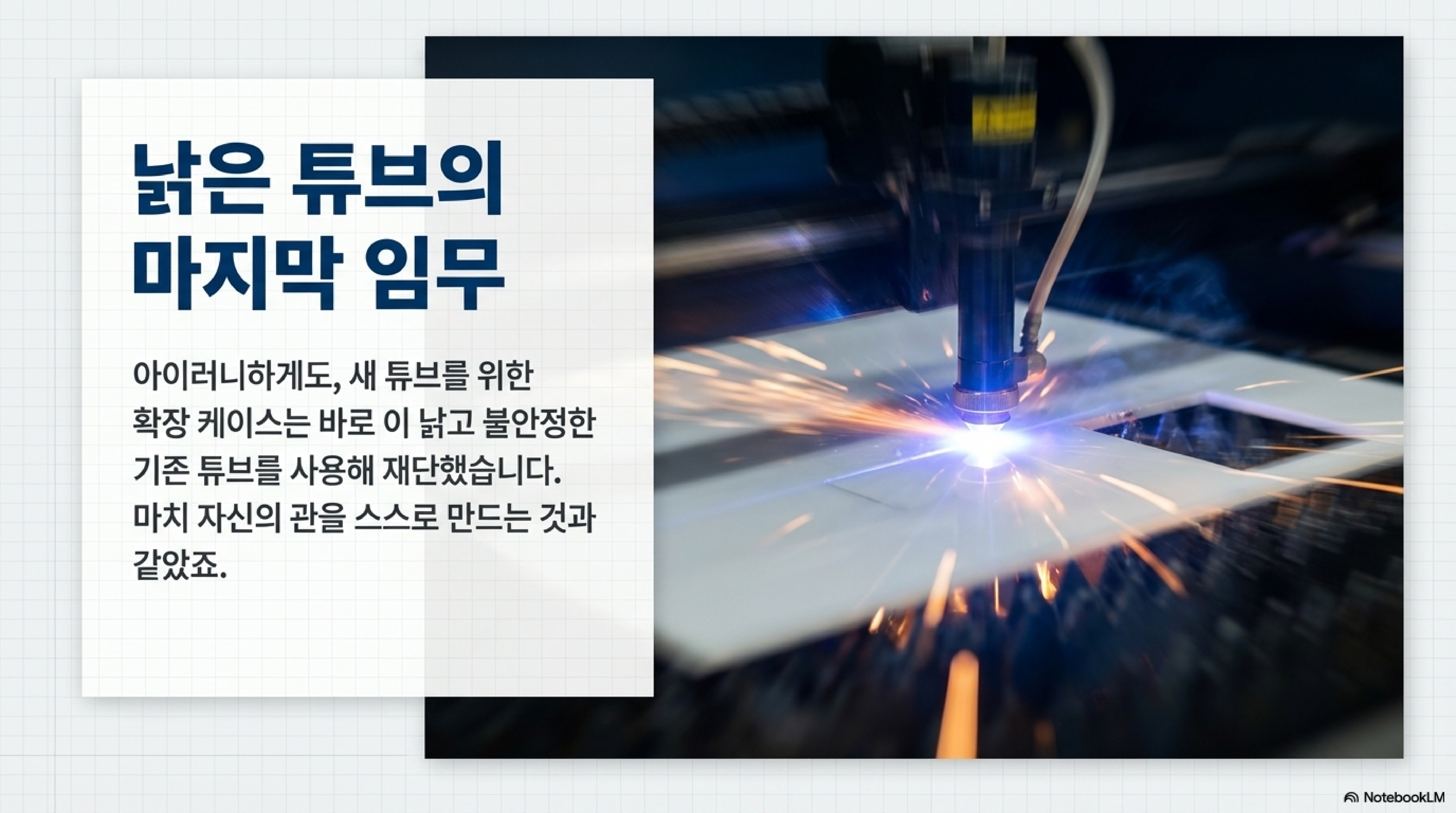 프로젝트를 진행하며 가장 아이러니했던 순간은 바로 낡은 레이저 튜브를 이용해 새 튜브가 들어갈 집을 만드는 과정이었습니다. 성능이 다해 교체를 앞둔 이 튜브가 자신의 자리를 대체할 부품의 보금자리를 정성껏 잘라내는 모습은 묘한 감상을 불러일으켰습니다.