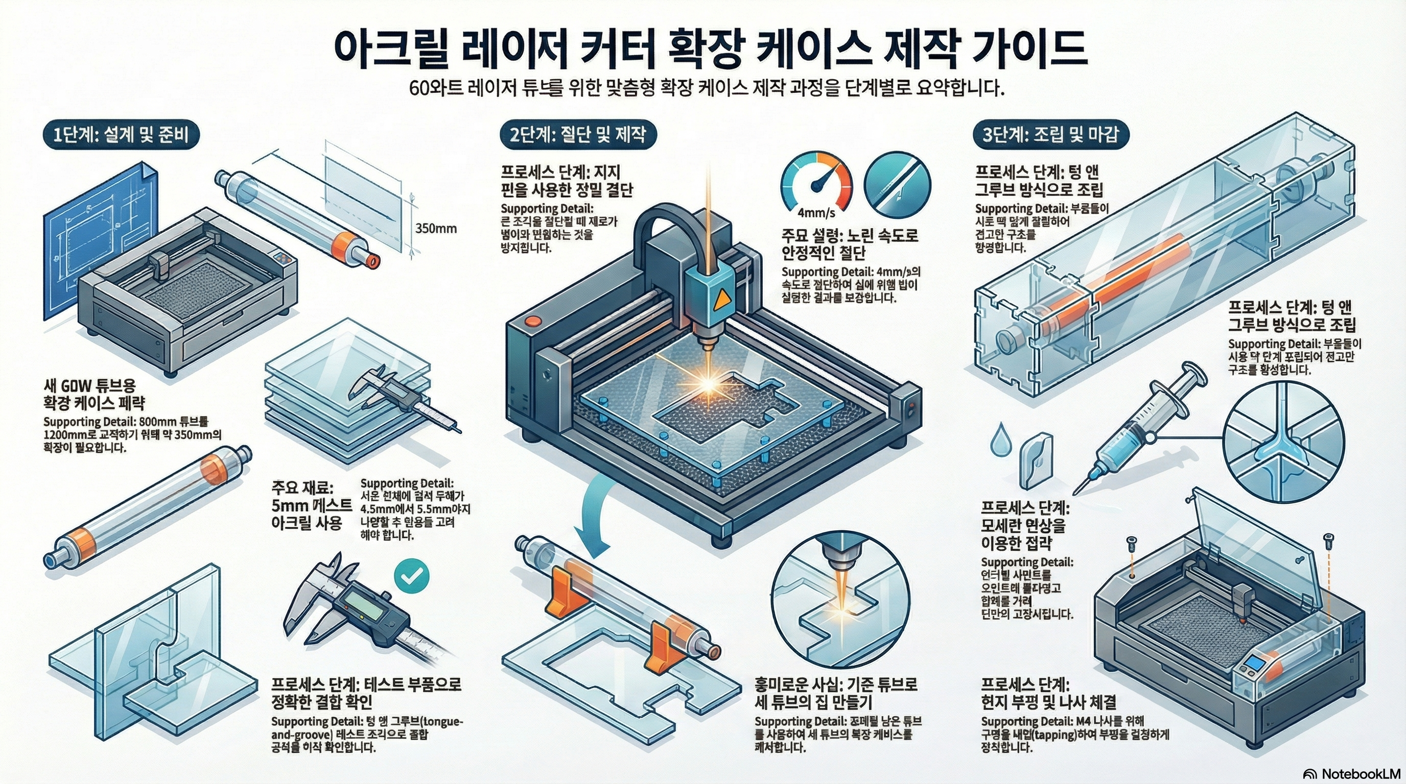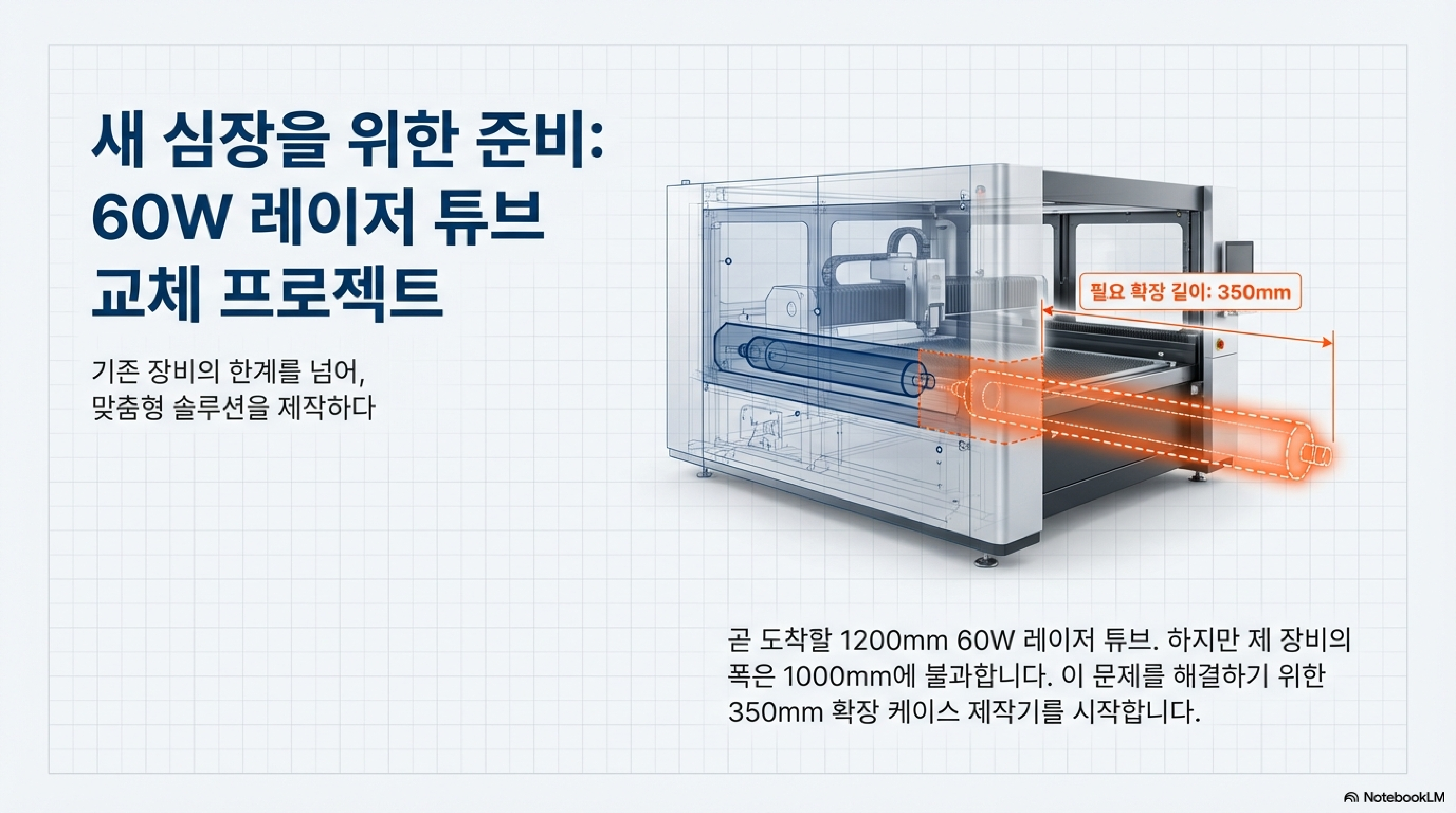 레이저 커터를 사용하는 메이커라면 누구나 한 번쯤 더 강력한 성능에 대한 갈망을 느낍니다. 저 역시 며칠 뒤 도착할 새로운 60W 레이저 튜브를 손꼽아 기다리고 있었습니다. 하지만 여기에는 한 가지 달콤한 문제가 있었습니다. 기존 800mm 튜브와 달리 새 튜브의 길이는 무려 1200mm에 달해, 1000mm 남짓한 제 장비에는 어림도 없이 길었던 것입니다.