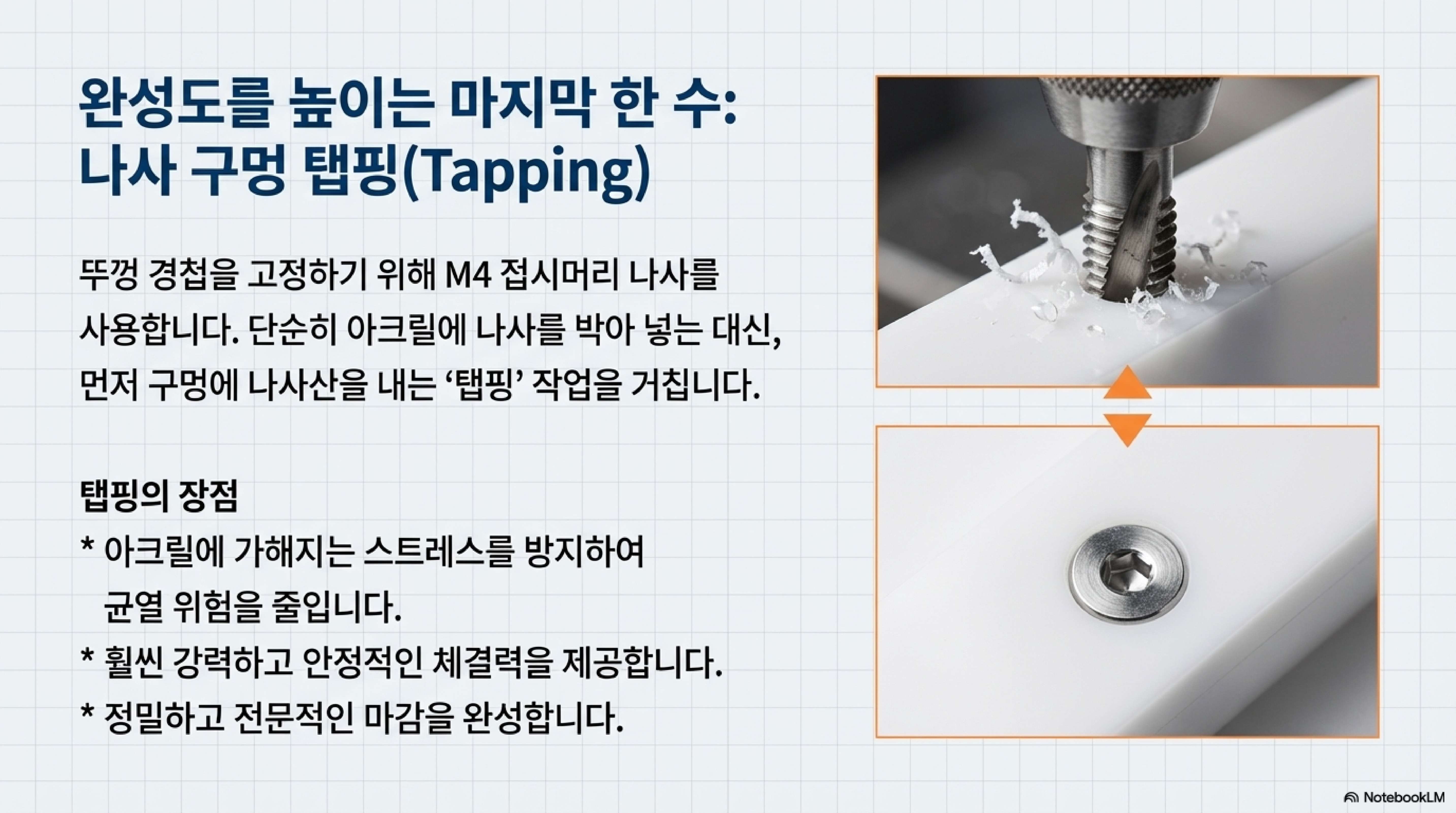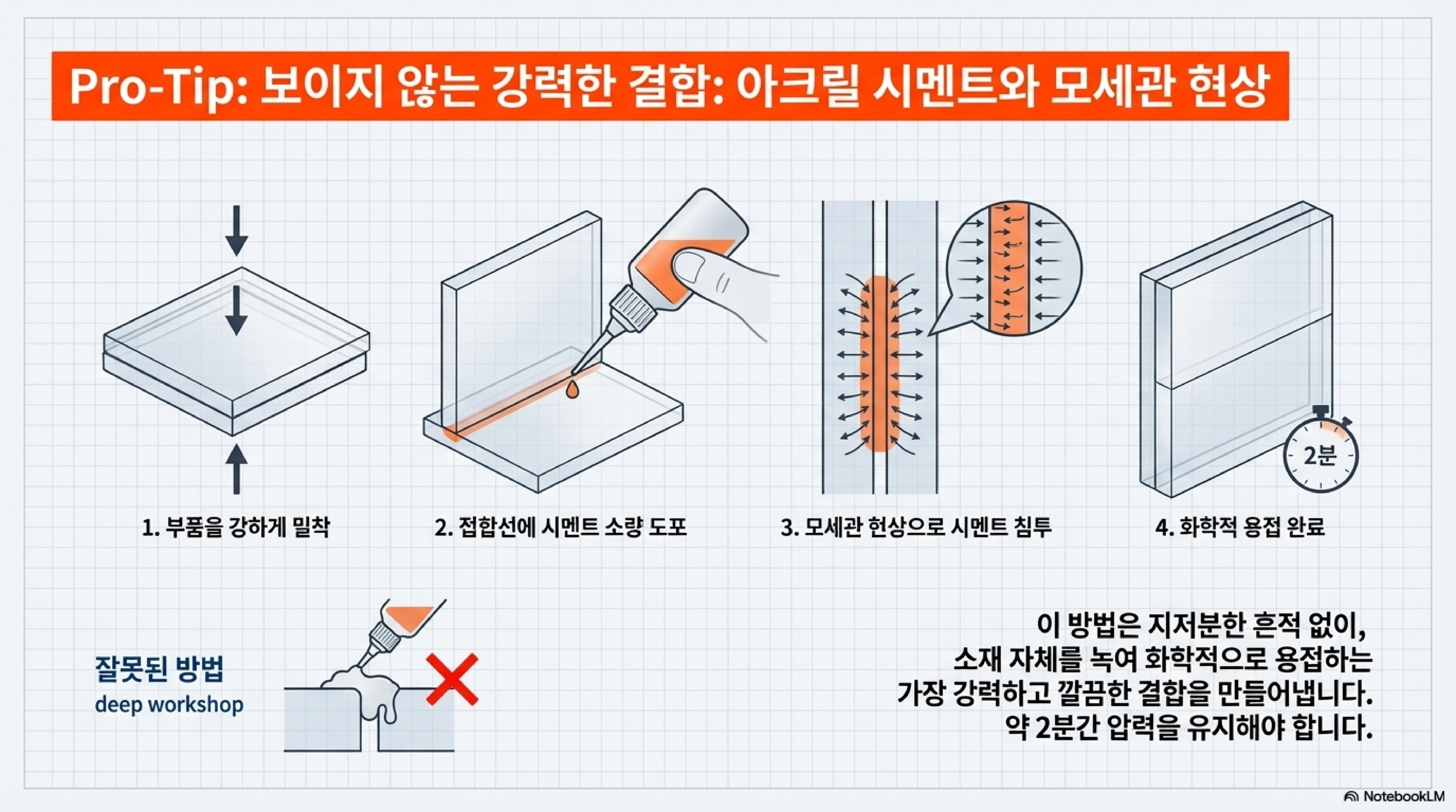 이렇게 하면 모세관 현상에 의해 접착제가 좁은 틈새로 빨려 들어가면서 전체 결합부를 단단하게 고정시킵니다. 이음새를 따라 접착제를 흘려 넣은 뒤, 약 2분간 압력을 가해 단단히 눌러주면 바위처럼 견고한 결합이 완성됩니다. 이는 아크릴 작업을 할 때 알아두면 매우 유용한 실용적인 팁입니다.