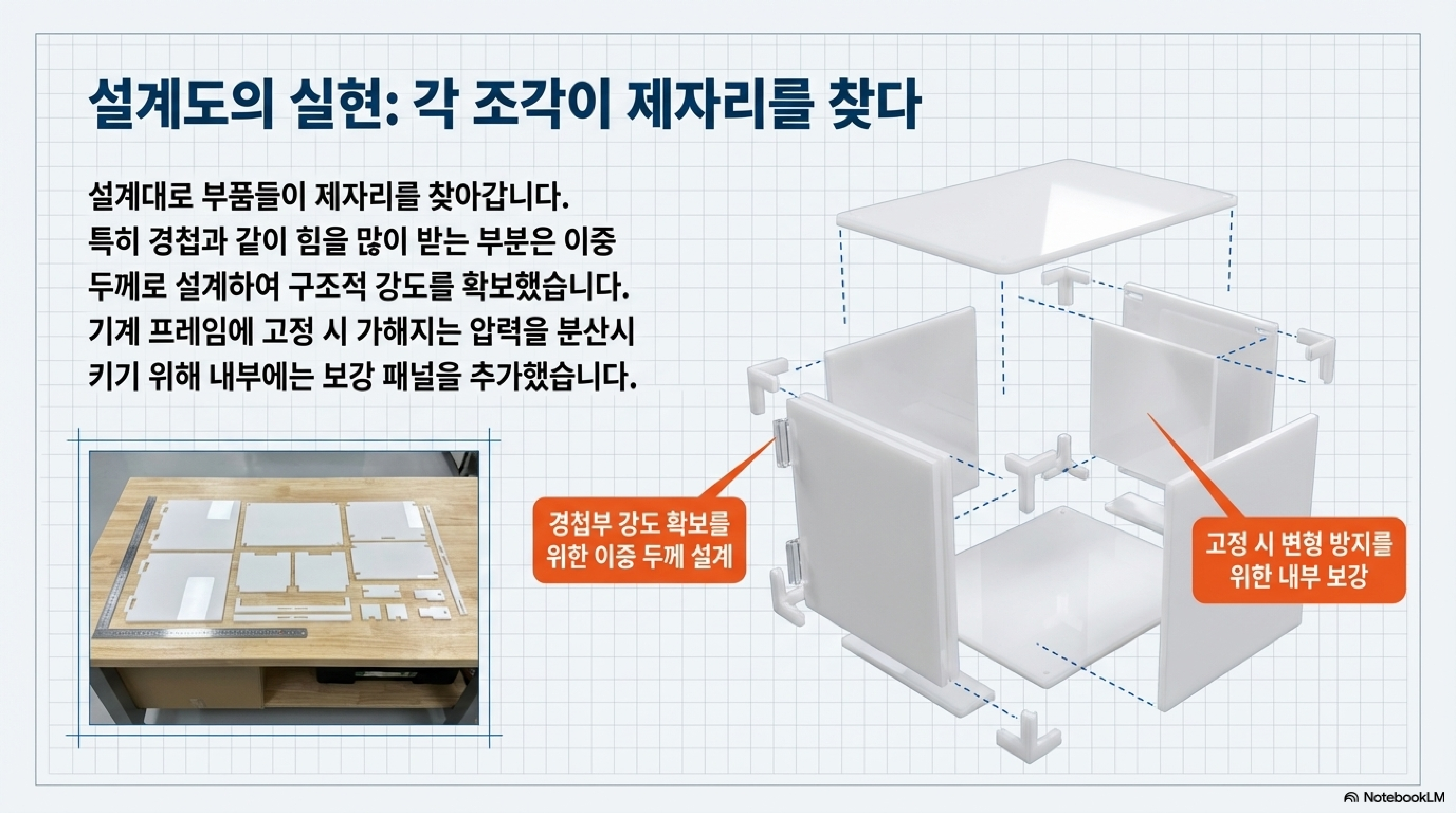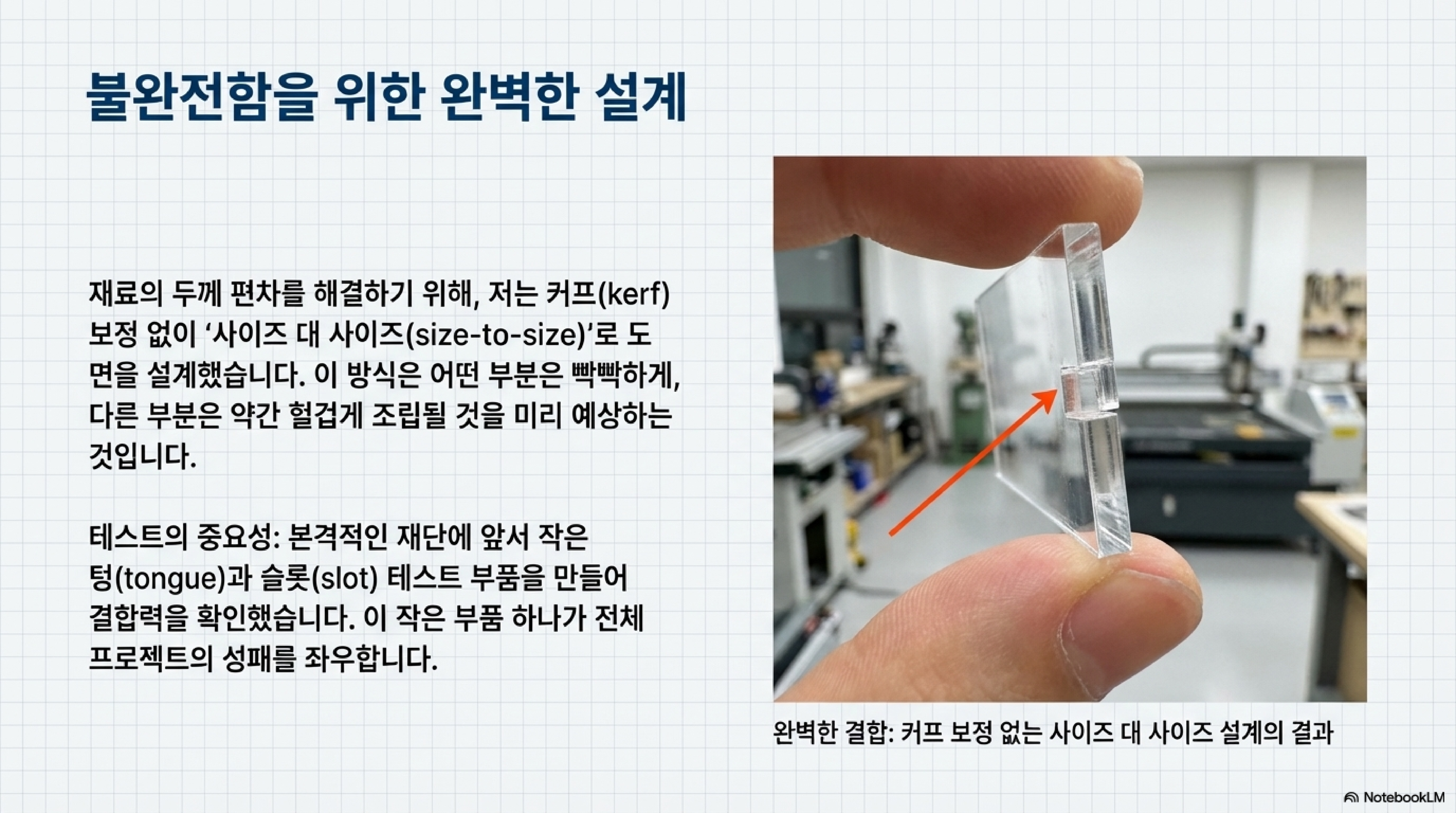 한 장의 아크릴 판 내에서도 두께가 1mm 가까이 차이가 날 수 있다는 사실은, 정밀한 결합 구조를 설계할 때 심각한 문제를 일으킬 수 있습니다. 일정한 두께를 가정하고 설계한 모든 조인트가 틀어질 수 있기 때문입니다. 이는 아크릴로 작업하는 사람이라면 반드시 명심해야 할, 직관에 반하는 중요한 교훈이었습니다.