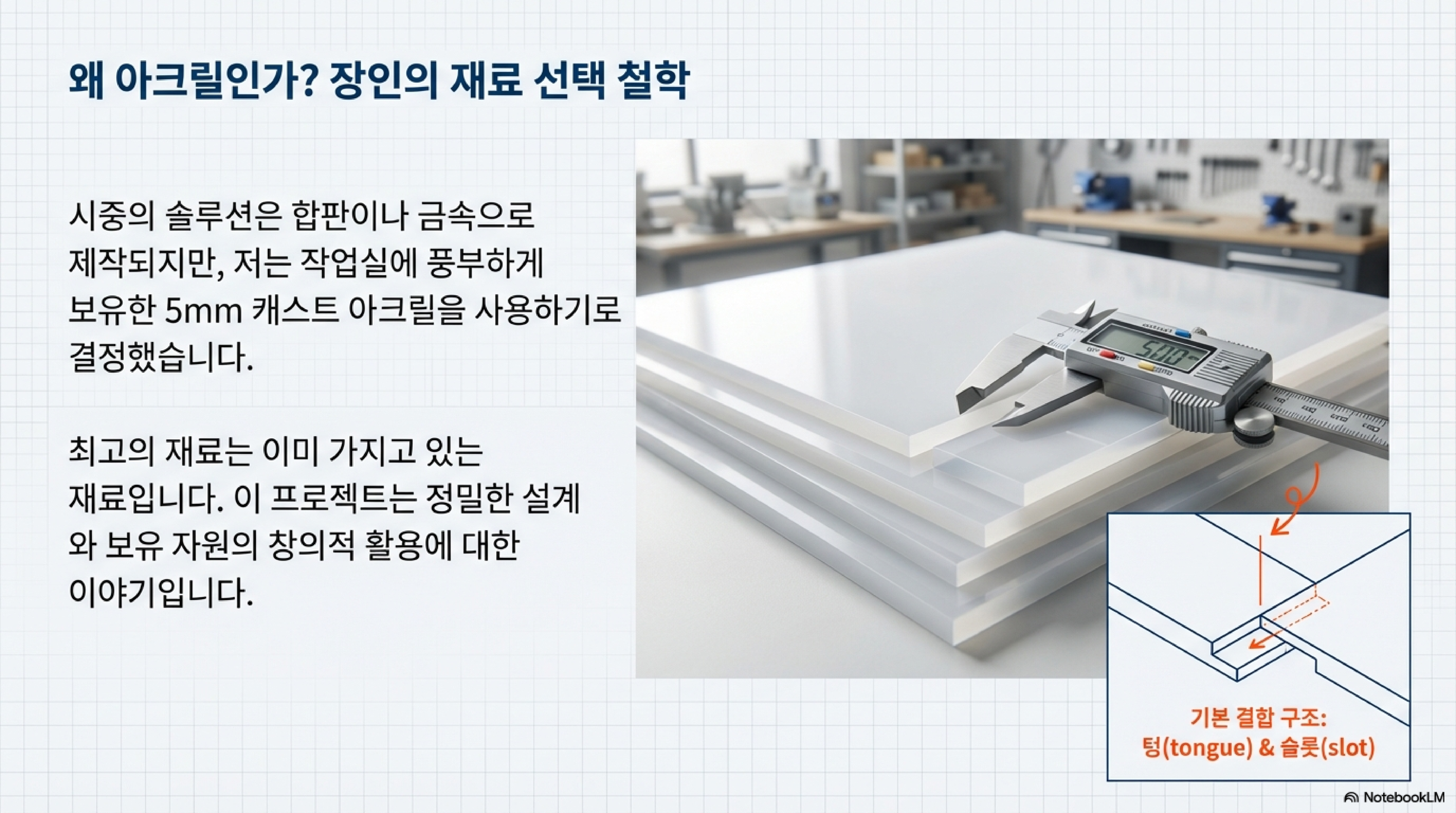 해결책은 명확했습니다. 약 350mm 길이의 확장 케이스를 직접 만드는 것이죠. 보통 이런 부품은 합판이나 금속으로 만들지만, 저는 아크릴을 사용하기로 했습니다. 왜 하필 아크릴이었냐고 물으실 수도 있겠네요. 이유는 간단합니다. 제 작업실에 동료에게 받은 흰색 아크릴이 많이 있었기 때문이죠. 메이커란 본래 가지고 있는 재료를 최대한 활용하는 법이니까요. 이 간단해 보이는 프로젝트는 제게 몇 가지 놀랍고도 중요한 교훈을 안겨주었습니다. 오늘은 그 과정에서 얻은 5가지 의외의 통찰을 공유하고자 합니다.