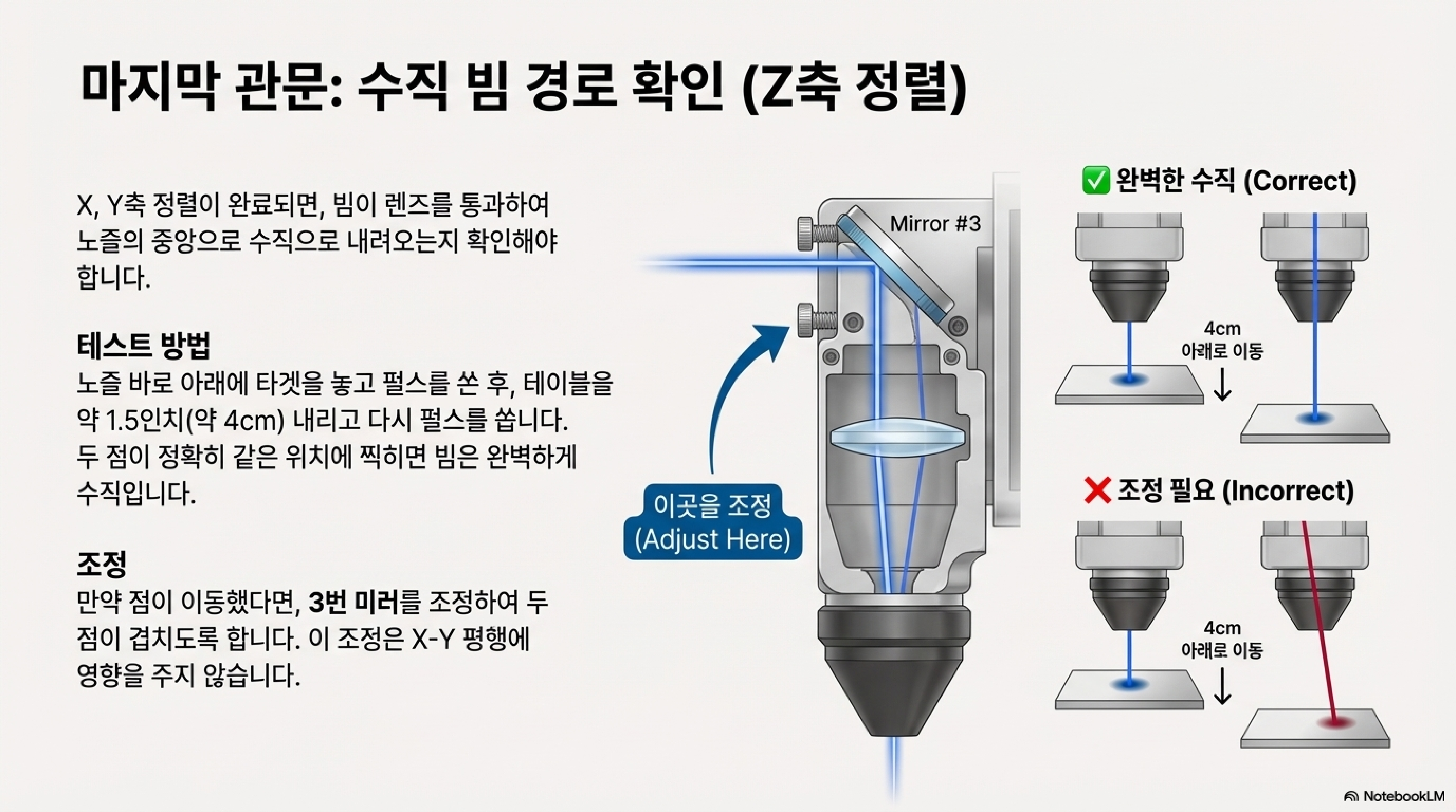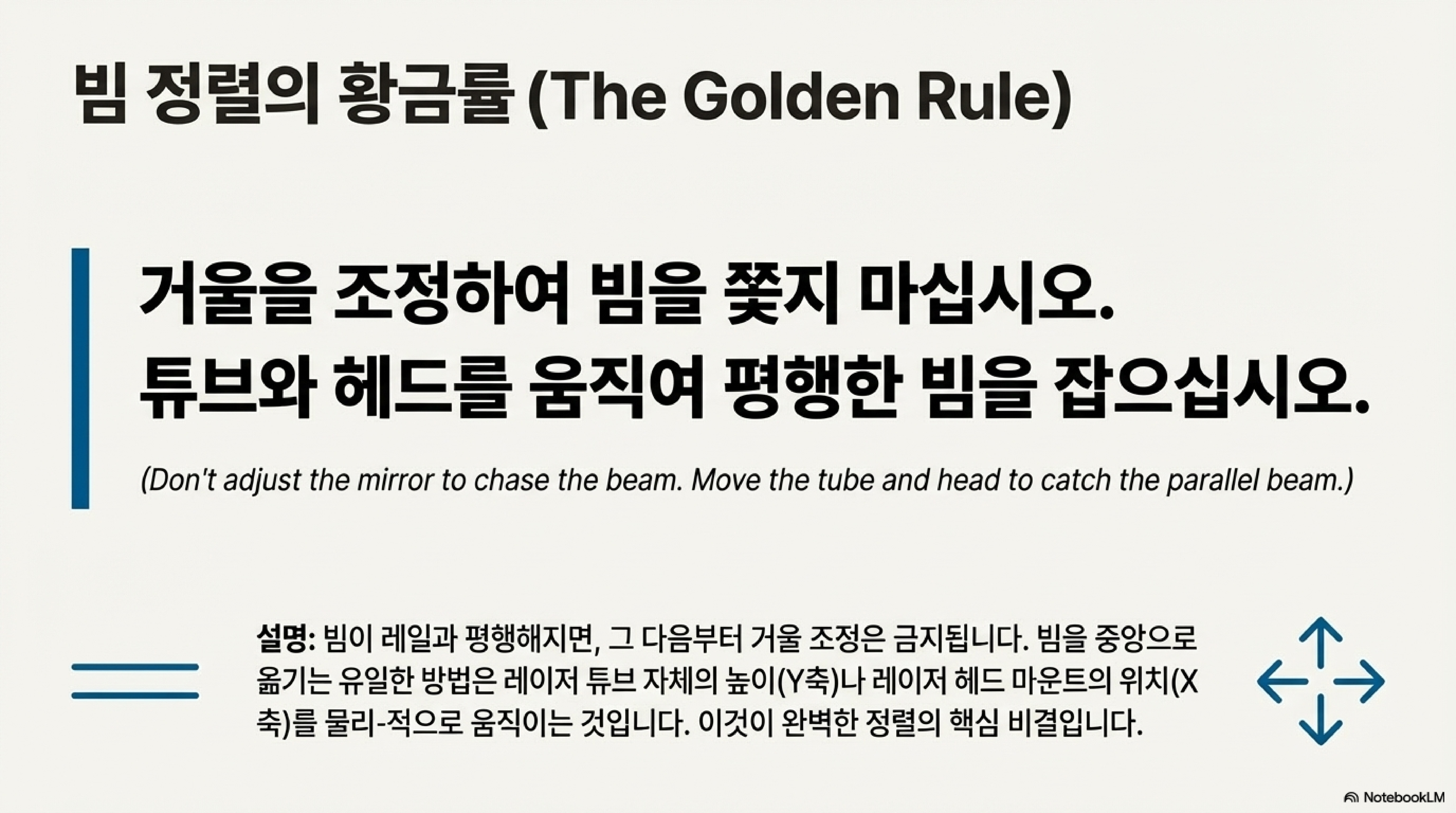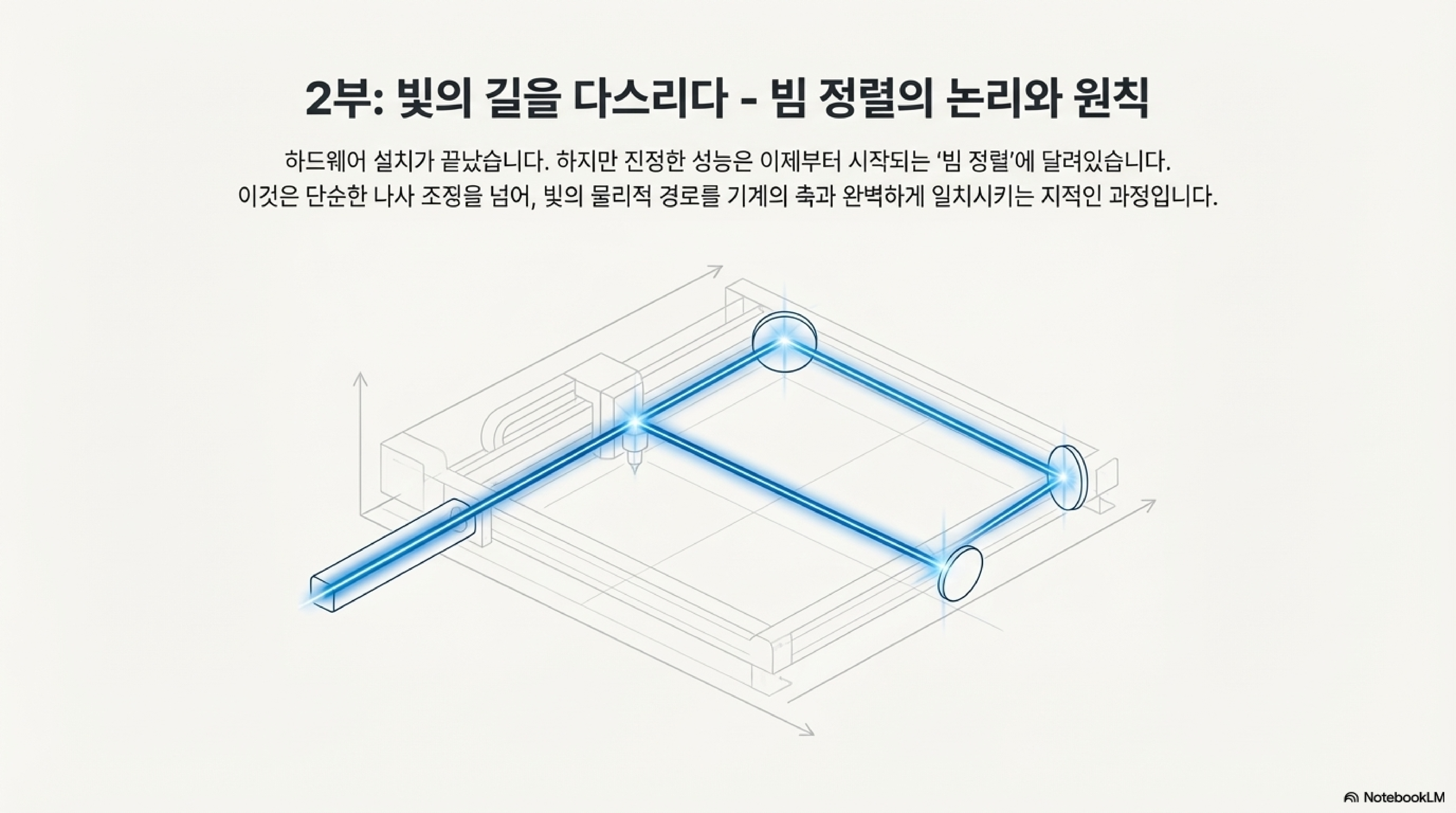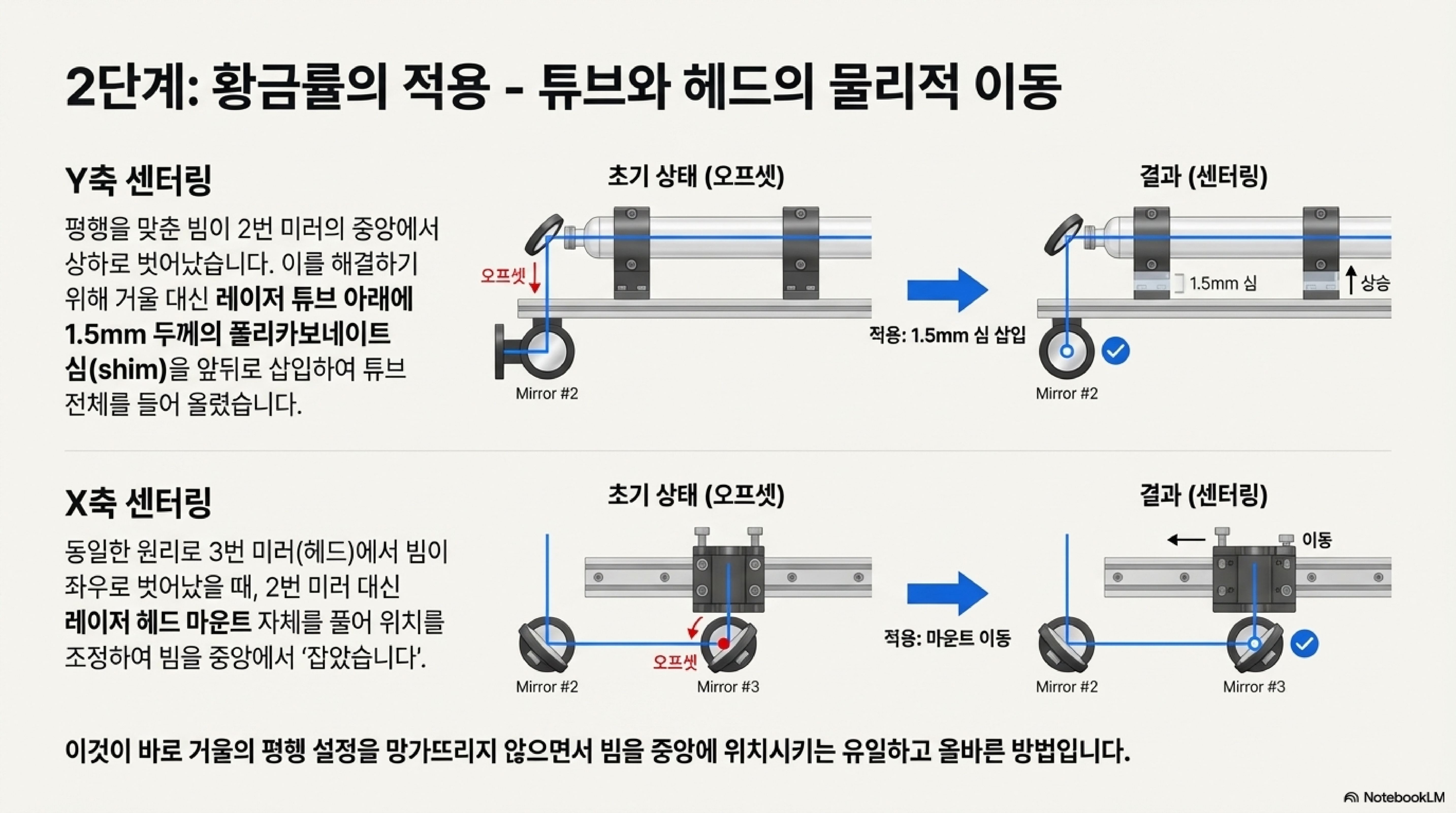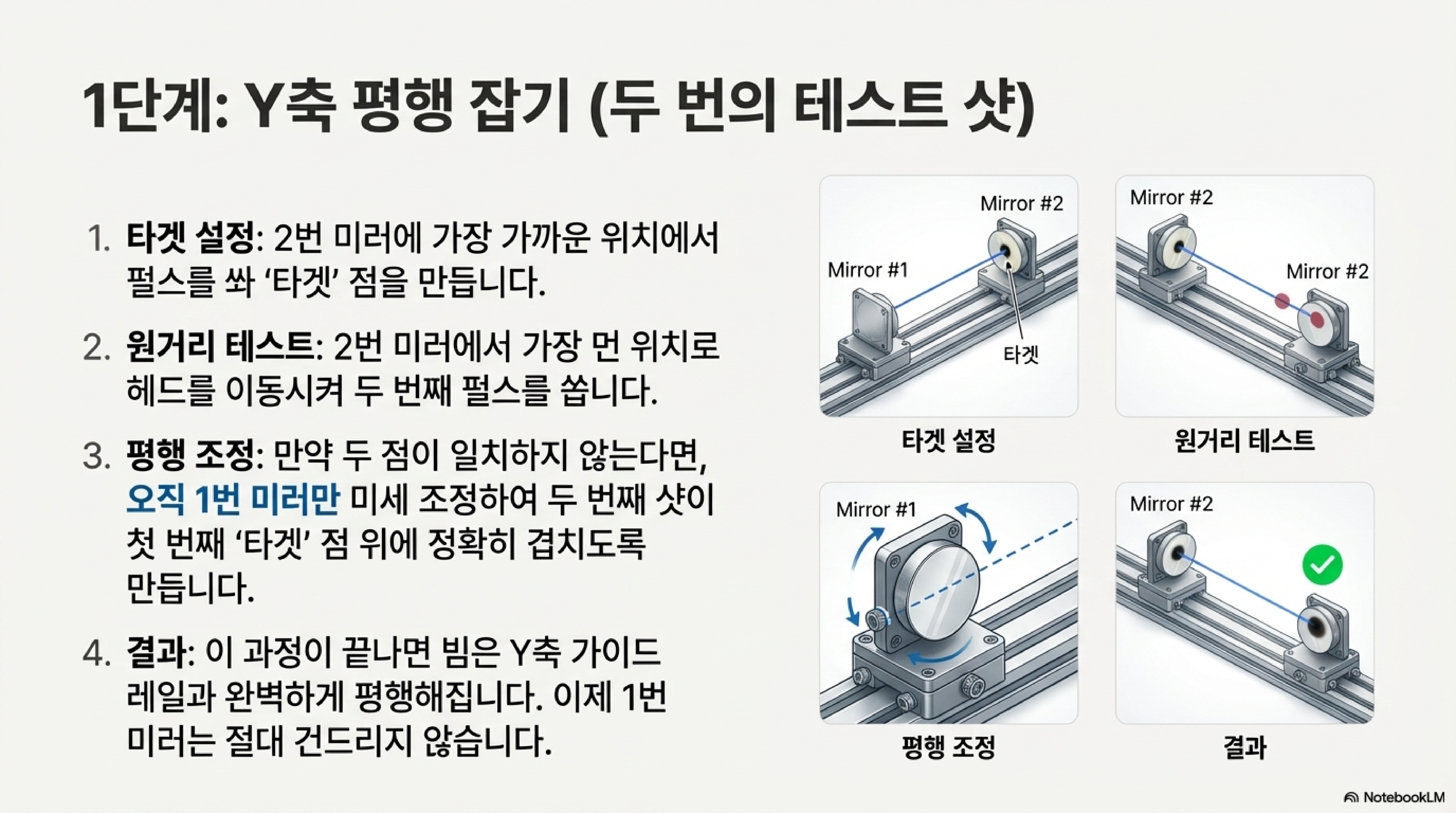 이것이 왜 중요할까요? 이 방법을 써야만 빔이 이동 경로 전체에 걸쳐 가이드 레일과 완벽한 평행을 유지하기 때문입니다. 이것이 바로 빔 정렬의 진정한 목표입니다.