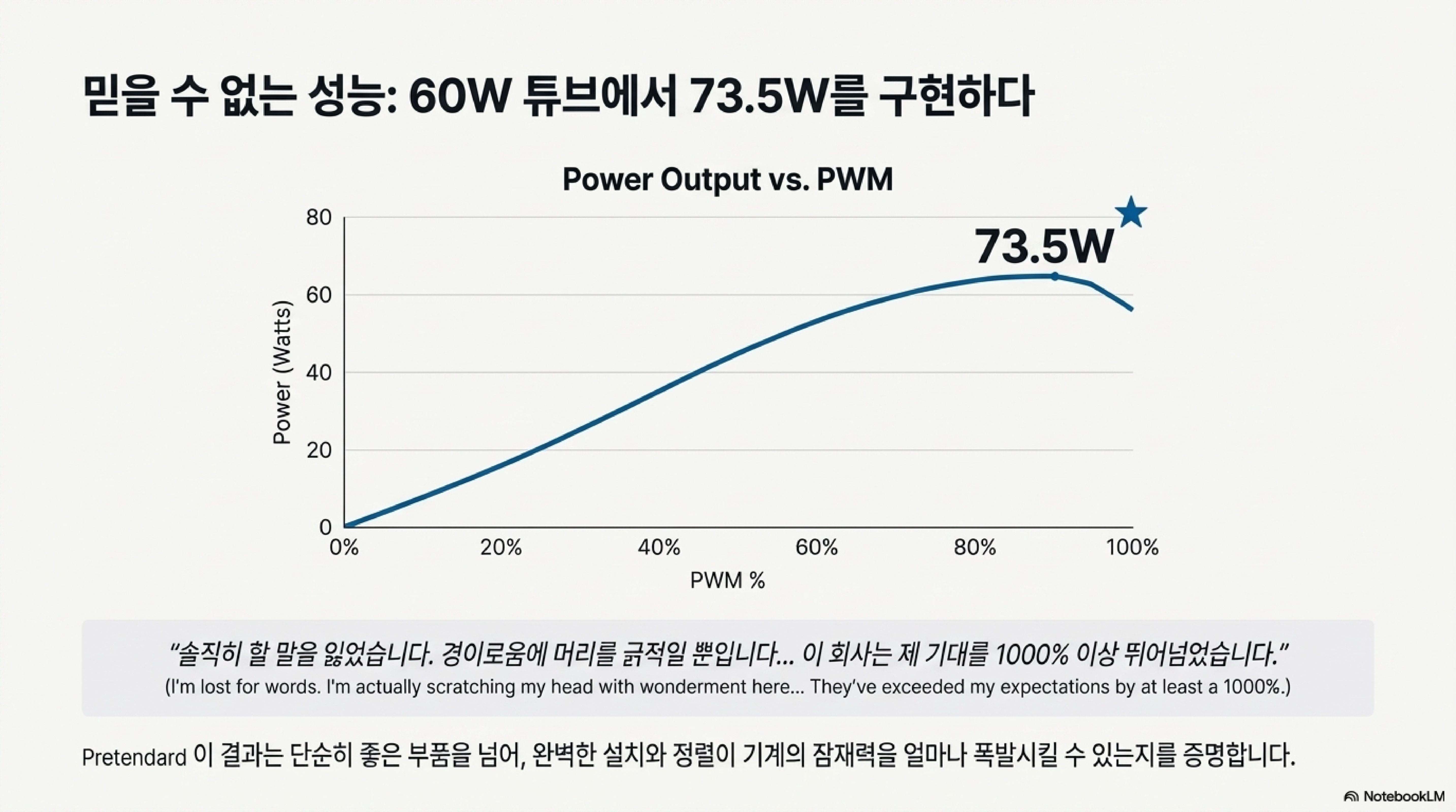 60W로 표기된 새 튜브는 테스트에서 꾸준히 70W 이상의 출력을 보여주었고, 최고 73.5W까지 기록했습니다. 이는 단순히 사양을 충족하는 것을 넘어, 기대를 훨씬 뛰어넘는 성능이었습니다.