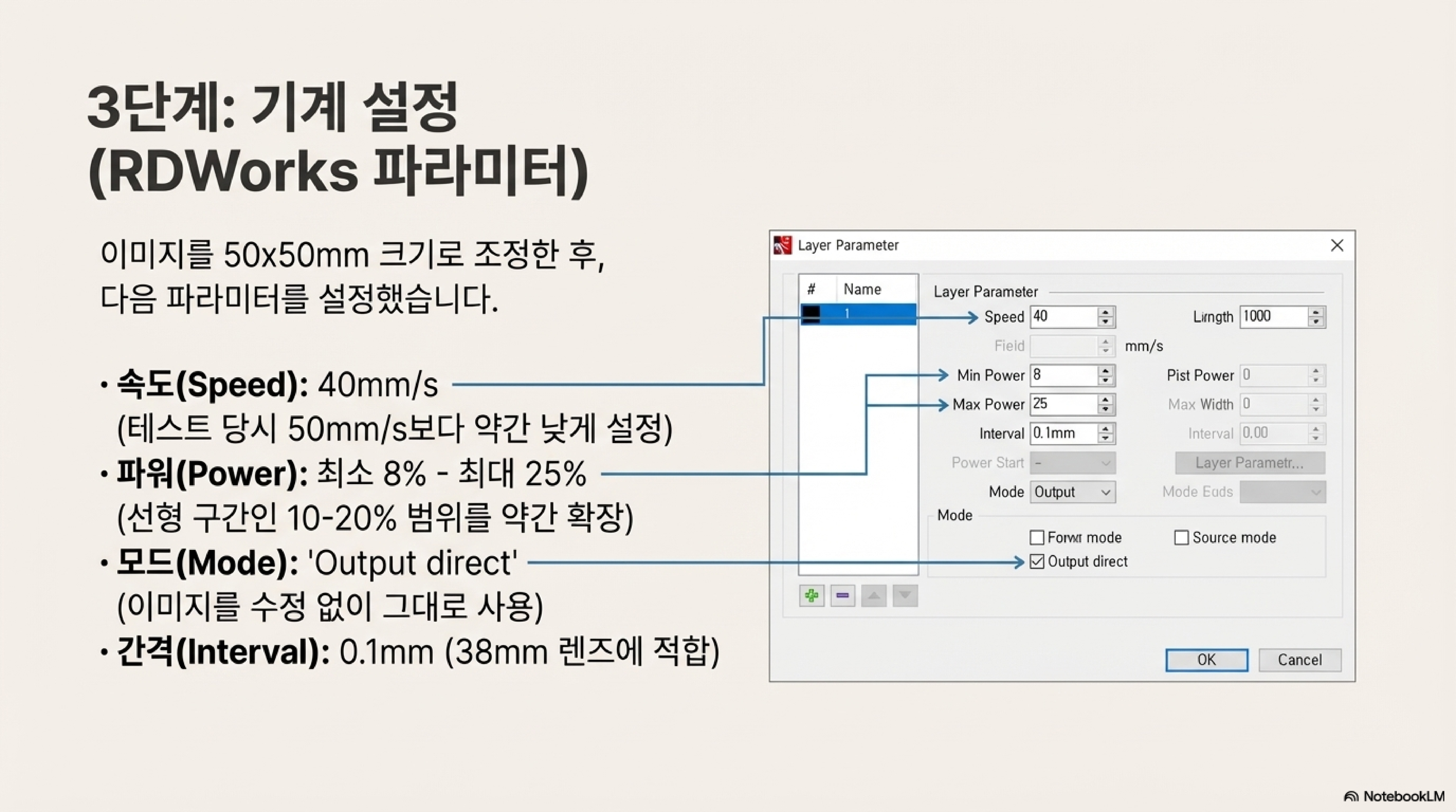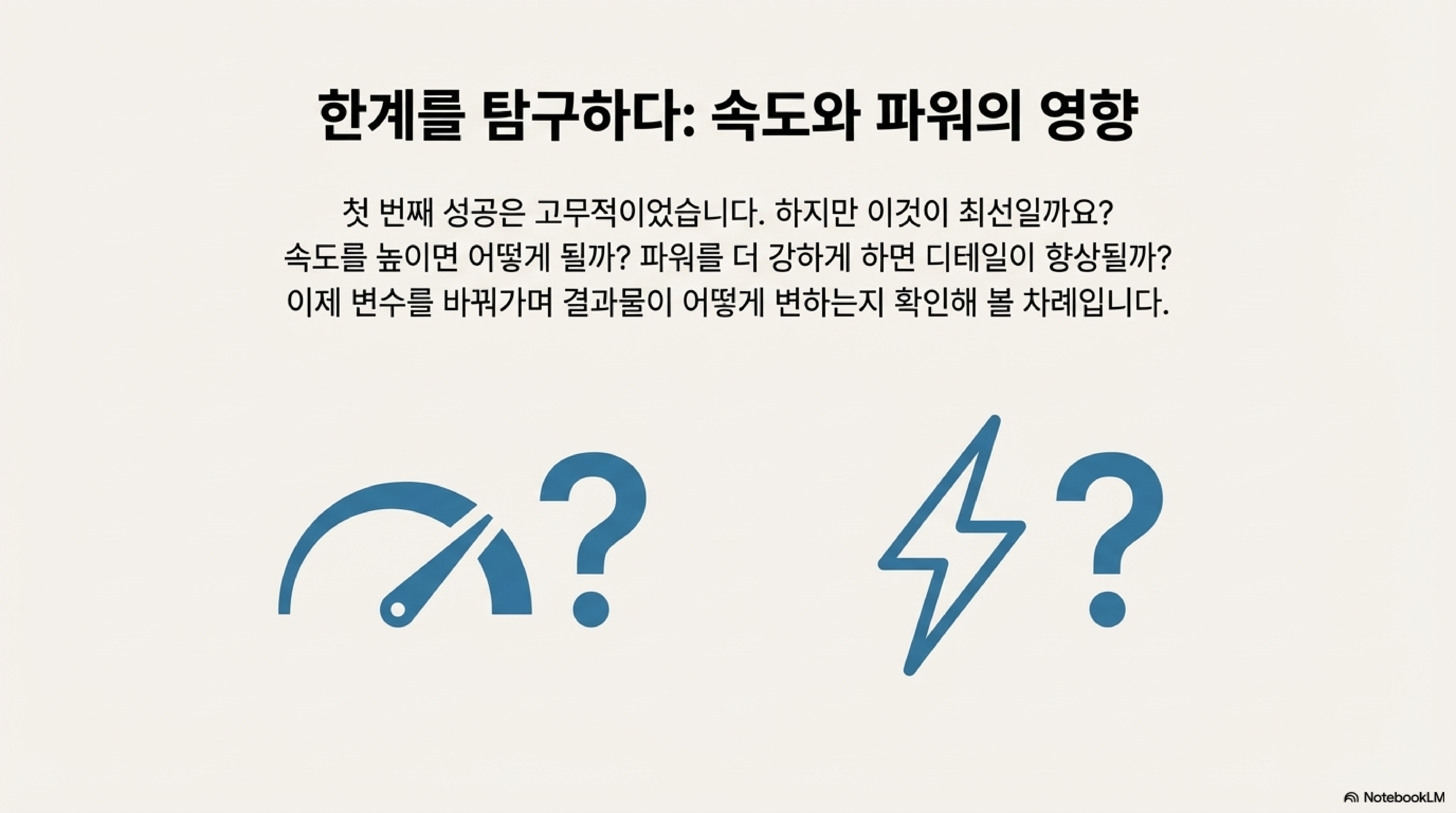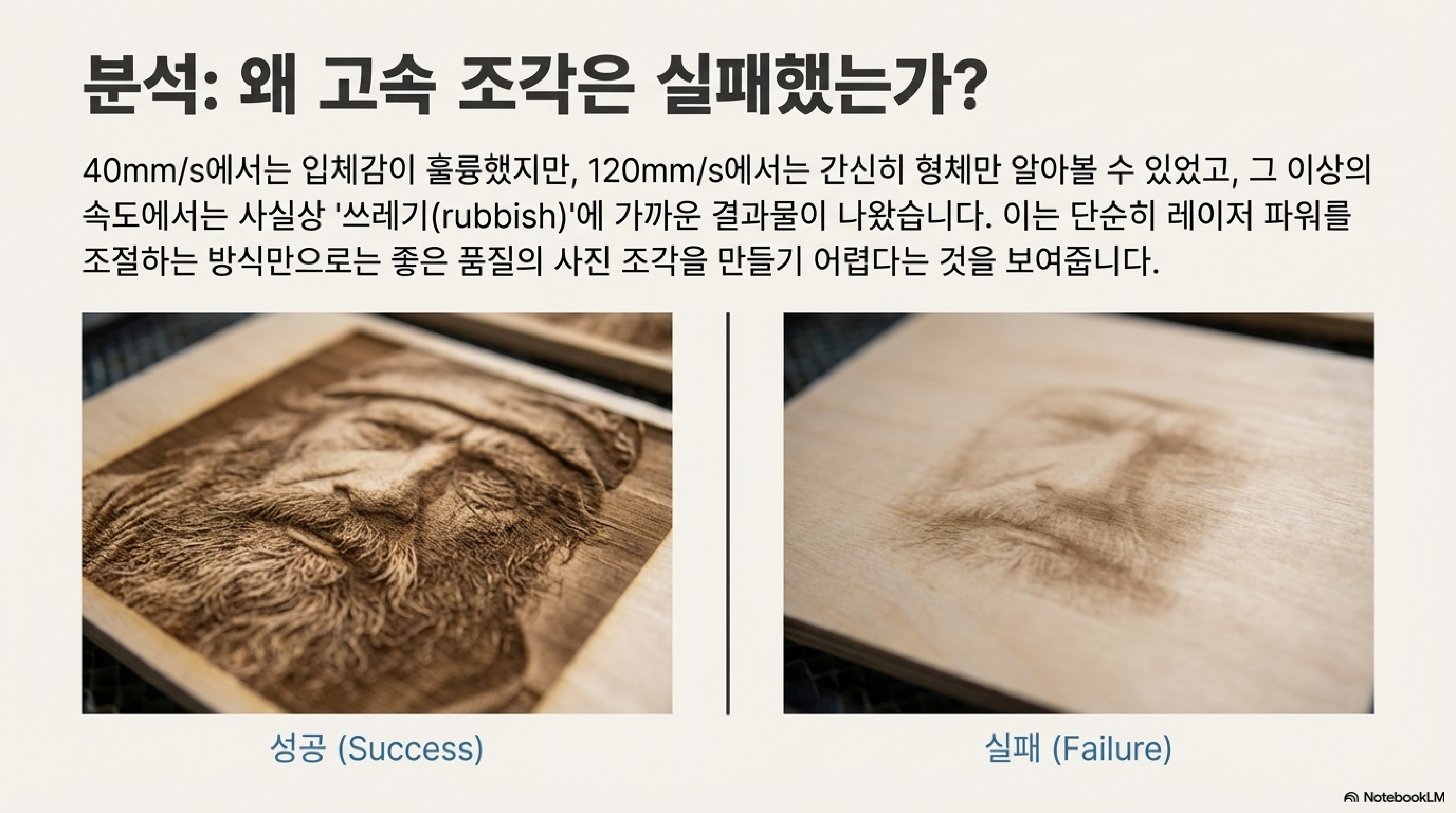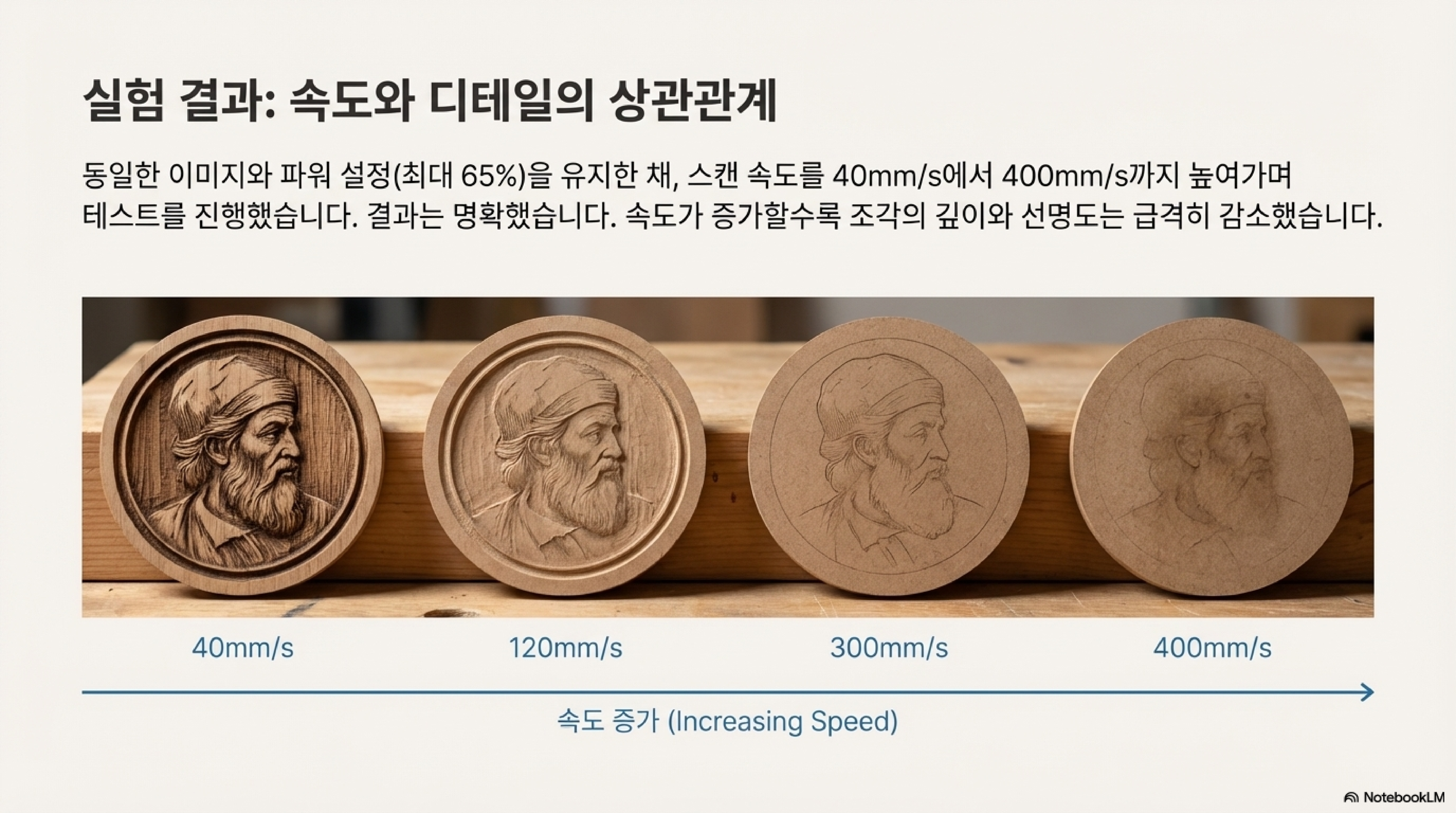 결론은 명확했습니다. 속도가 빨라질수록 "확실히 선명도가 떨어졌고" 결과 이미지는 점점 희미해졌습니다. 눈에 띄는 3D 효과를 만들기 위해서는 고속으로 스캔하는 것보다, 느리고 제어된 속도로 태우는 방식이 훨씬 우수하다는 것이 증명되었습니다.