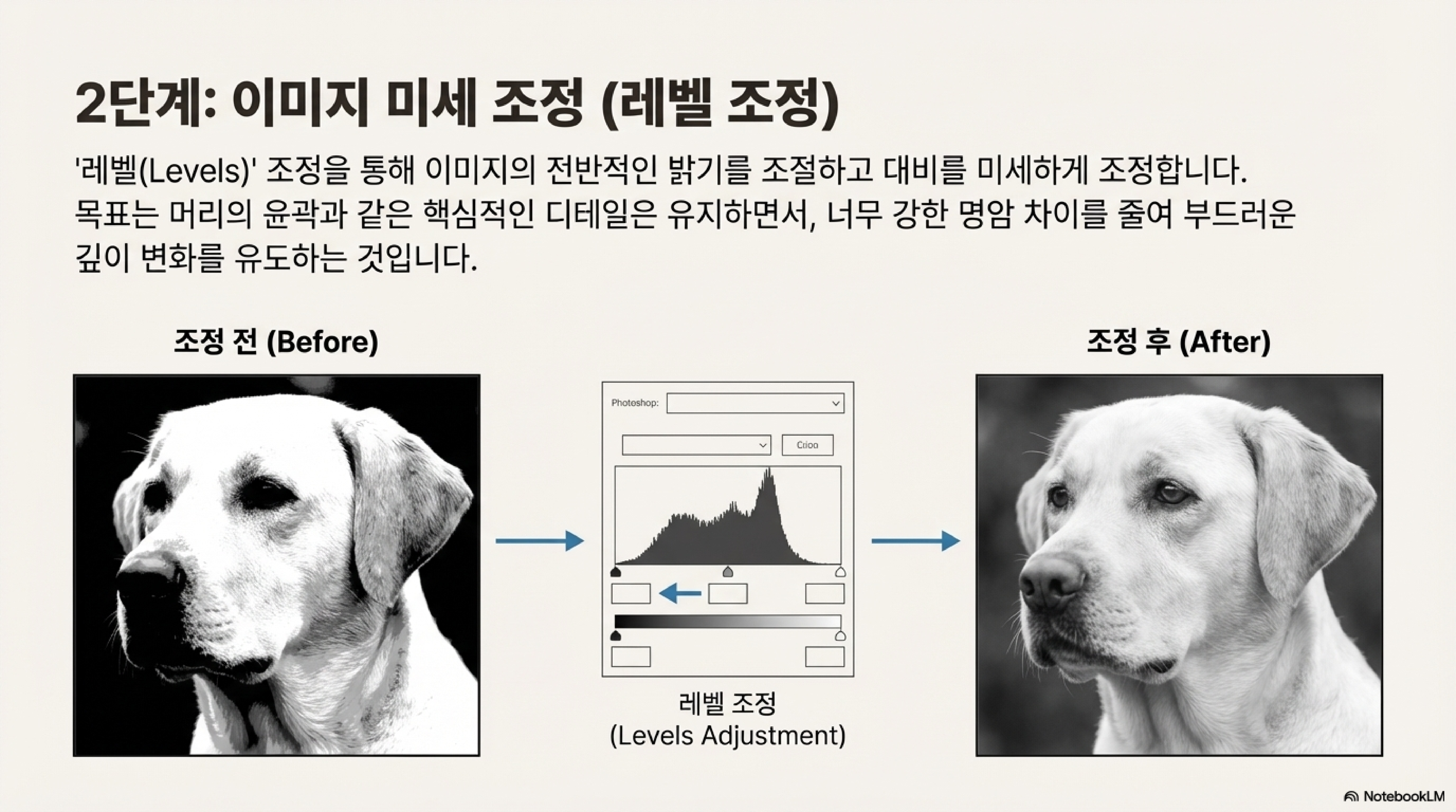 - 레벨(Levels) 조정: 이미지의 명암과 밝기를 미세하게 조절하여, 이 사진의 핵심인 피사체의 머리 윤곽이 뚜렷하게 드러나도록 강조합니다.