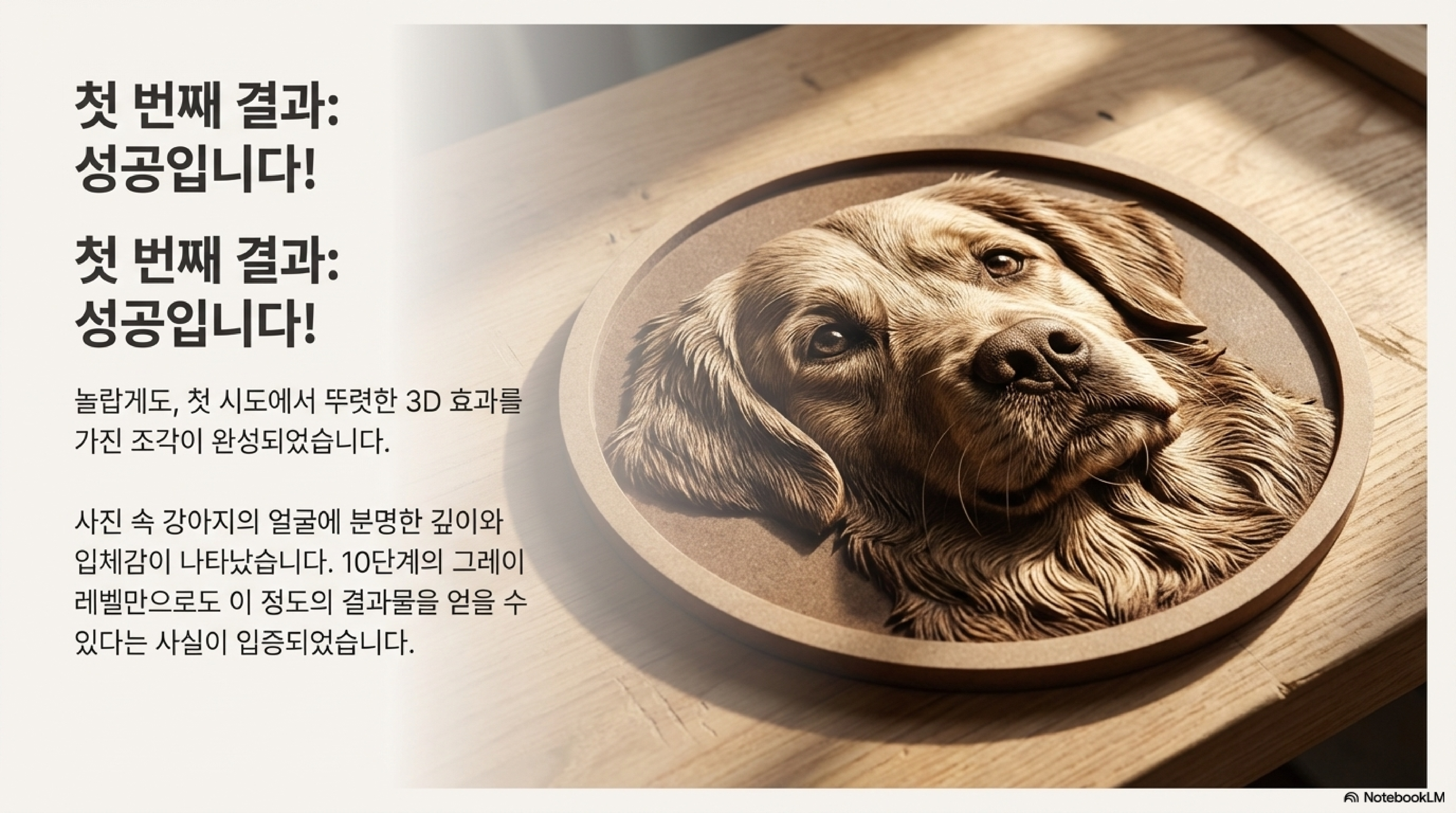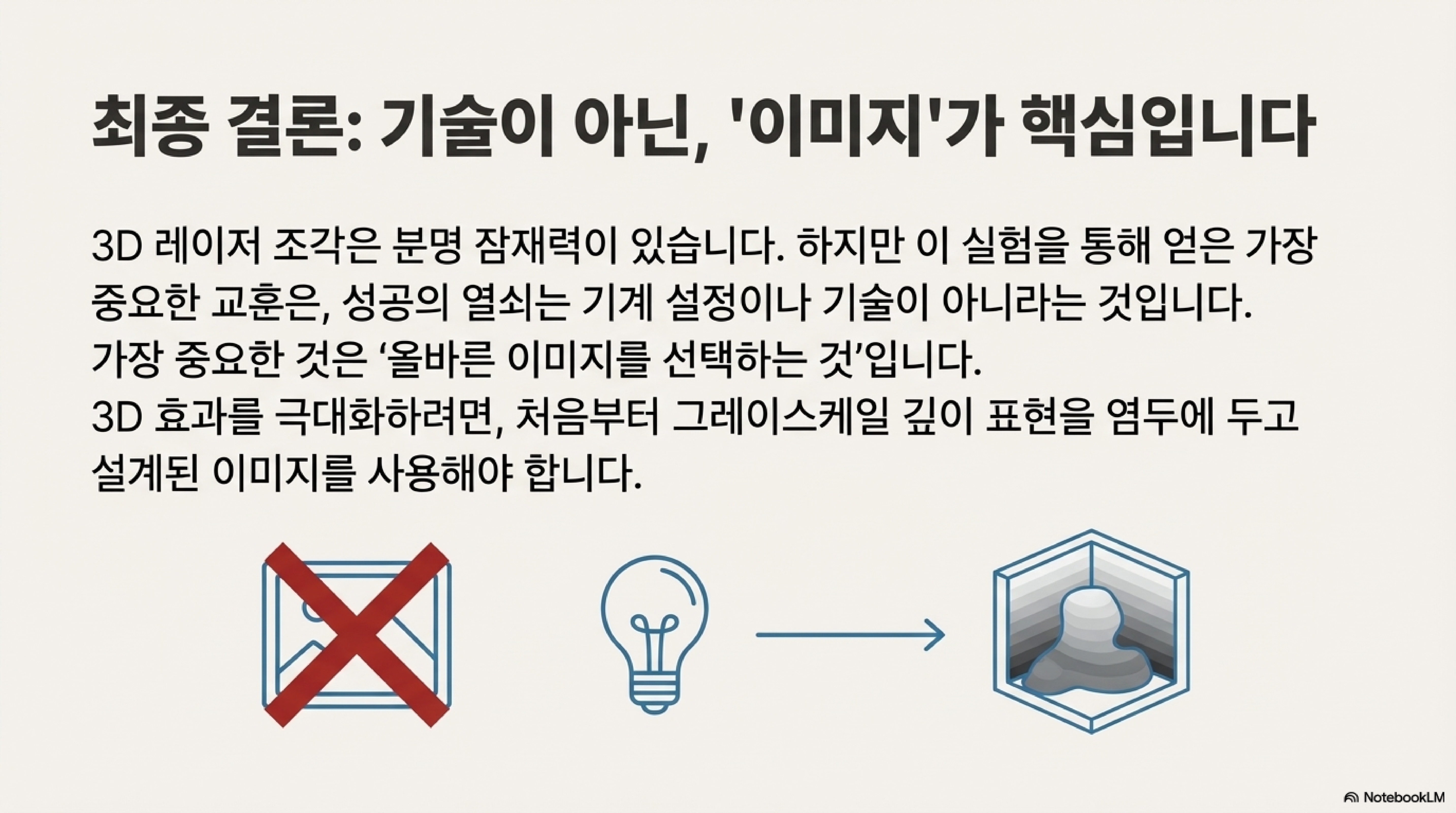최종 결론은 이렇습니다. 진정으로 성공적인 3D 조각을 위해서는 원본 사진을 신중하게 선택하거나, 이 목적을 위해 특별히 디자인해야 한다는 것입니다. 이미지 자체가 "회색 음영을 효과적으로 활용"하도록 만들어져야 이 기술의 강점을 제대로 발휘할 수 있습니다.