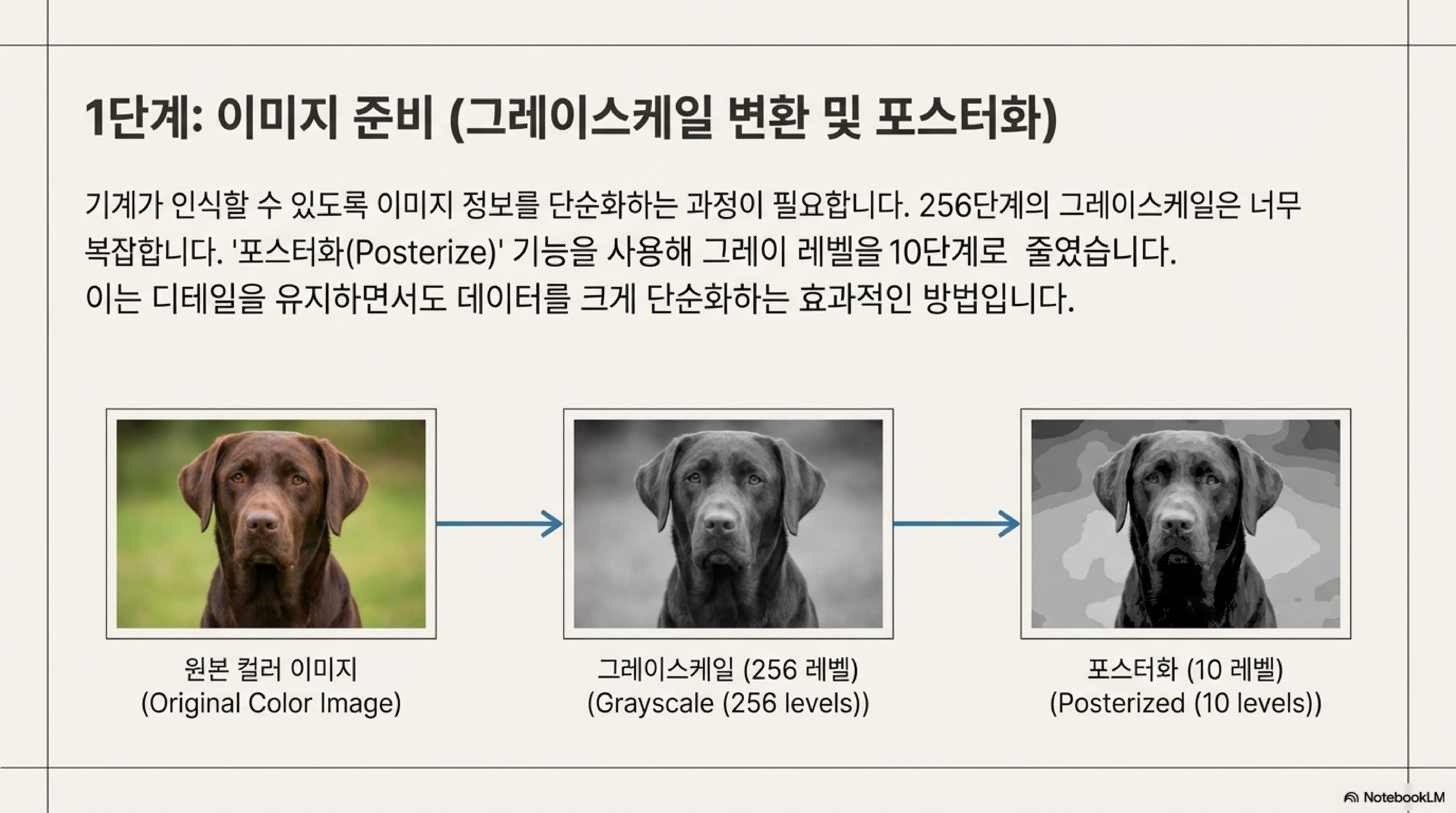 - 포스터화(Posterize): 디테일을 줄이기 위해 회색 단계를 10단계 정도로 단순화합니다.