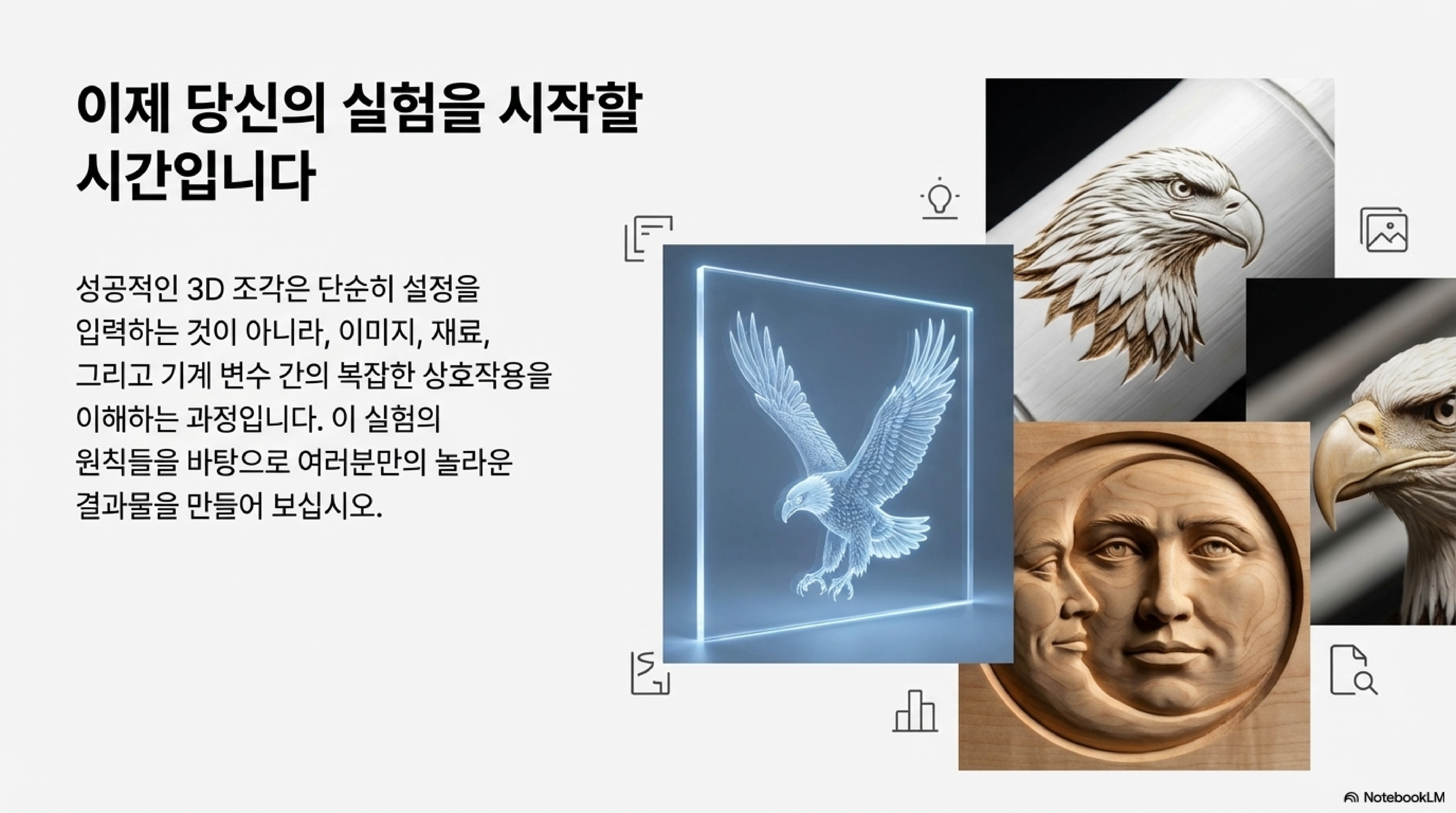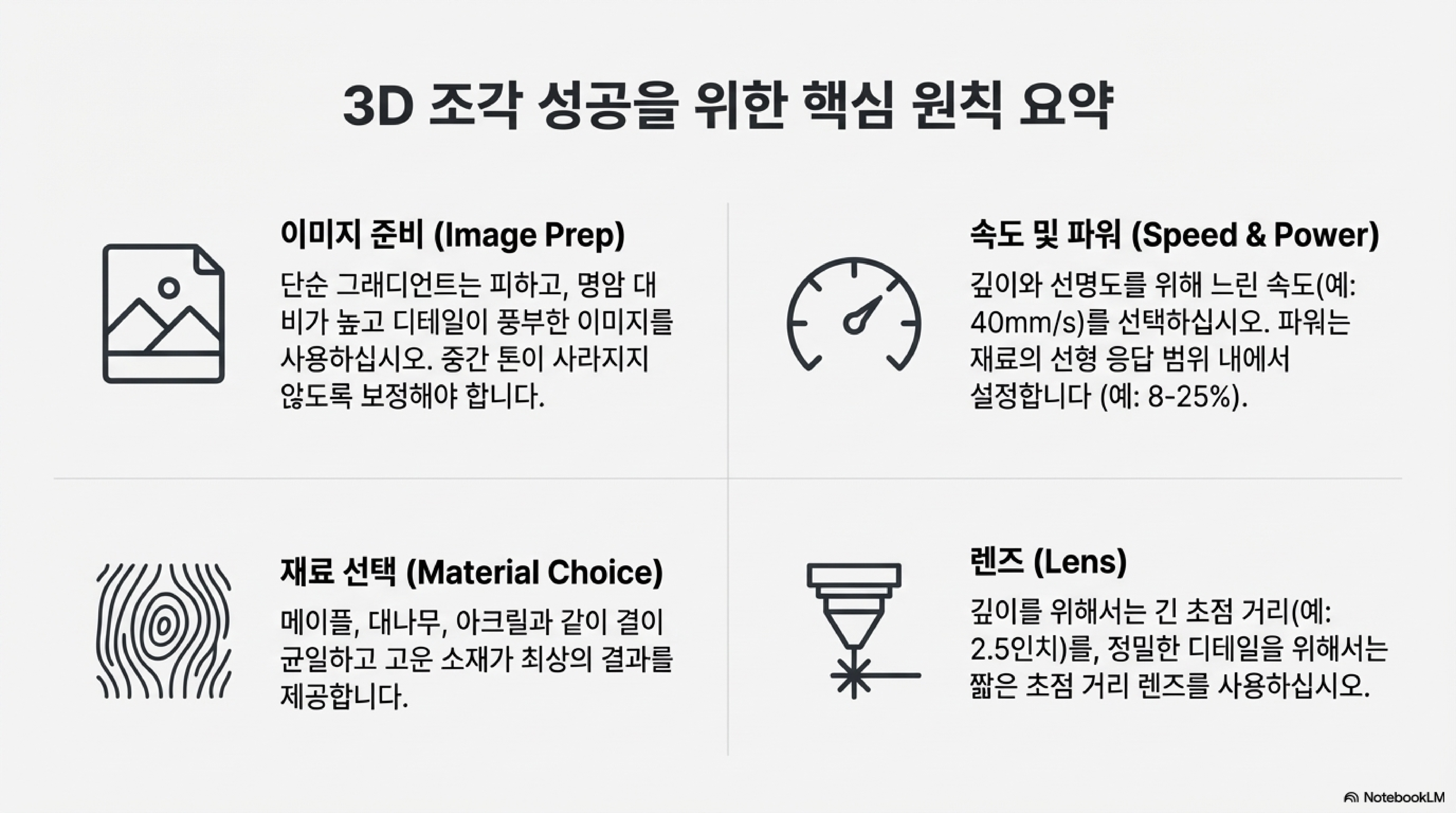 저의 학습 실험실(Learning Lab)에서 레이저 커터가 255단계의 회색 음영을 정확히 구분하여 표현할 수 있다는 사실을 확인했을 때, 제 머릿속은 온통 3D 조각에 대한 가능성으로 가득 찼습니다. 평평한 2D 각인을 넘어, 이 섬세한 음영 차이를 물리적인 깊이와 질감으로 바꿔내는 꿈을 꾸었죠. 이론상으로는 완벽했습니다. 하지만 이론과 현실의 간극은 예상보다 훨씬 컸습니다. 이 글은 깔끔하게 정리된 이론 설명서가 아닙니다. 수많은 가정과 실패, 그리고 예상치 못한 발견으로 가득했던 저의 실험 노트를 공유하는 여정입니다.