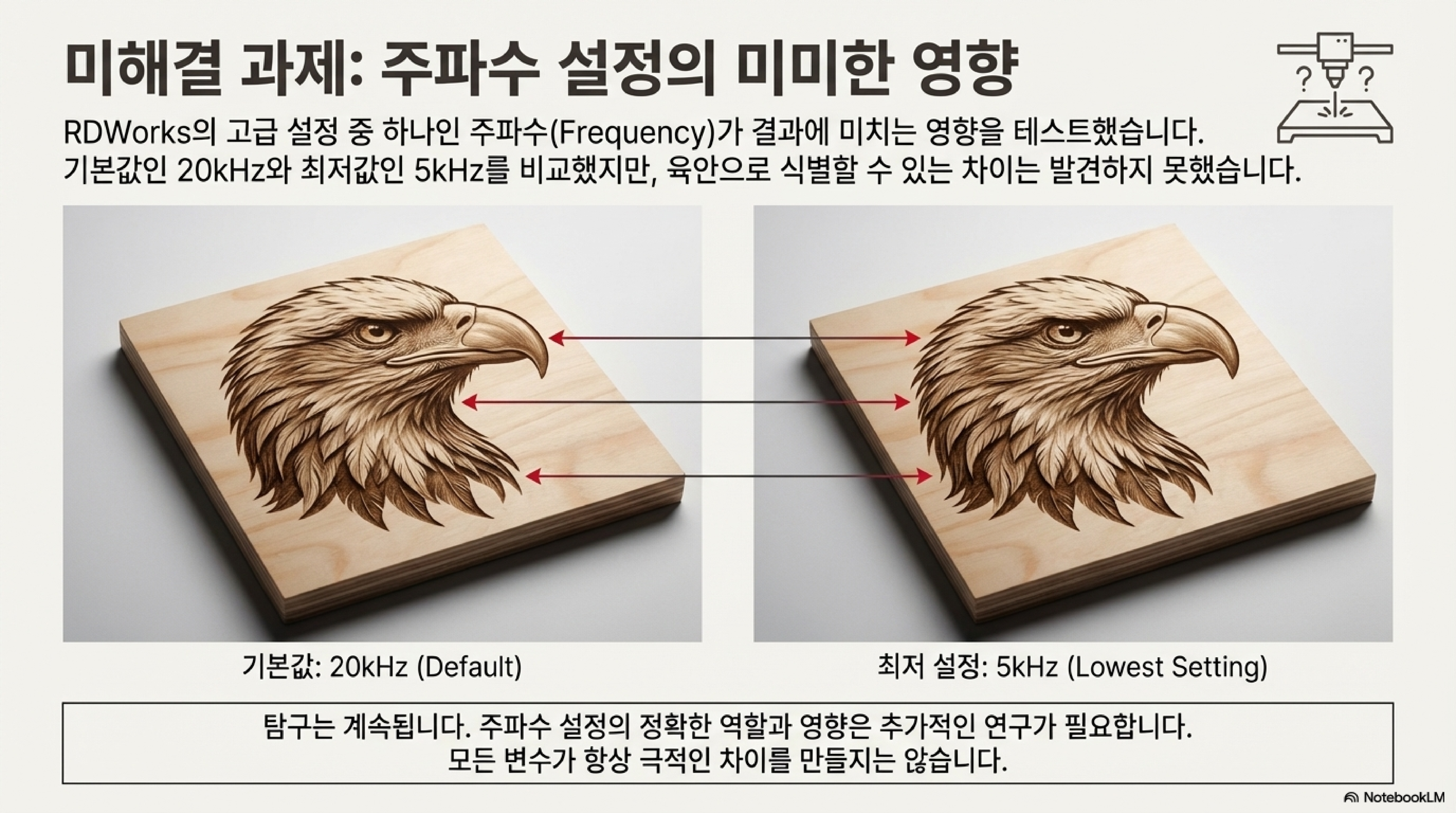 저는 주파수(Frequency) 설정을 두고 실험을 진행했습니다. 기본값인 20kHz와 설정 가능한 최저값인 5kHz로 각각 동일한 작업을 테스트했지만, 결과는 놀라웠습니다. 두 결과물 사이에는 "사실상 아무런 차이"가 없었습니다. 이것이 제 기계의 문제인지 확인하기 위해 소프트웨어 설계사인 Ruida와 레이저 튜브 제조사에 직접 문의했지만, 이 설정의 명확한 효과에 대한 답을 얻기는 어려웠습니다. 이 경험은 모든 변수를 통제하려는 노력에서 벗어나, 가장 중요한 핵심 변수(이미지, 속도, 재료)에 집중하는 것이 훨씬 효과적이라는 실용적인 교훈을 주었습니다.