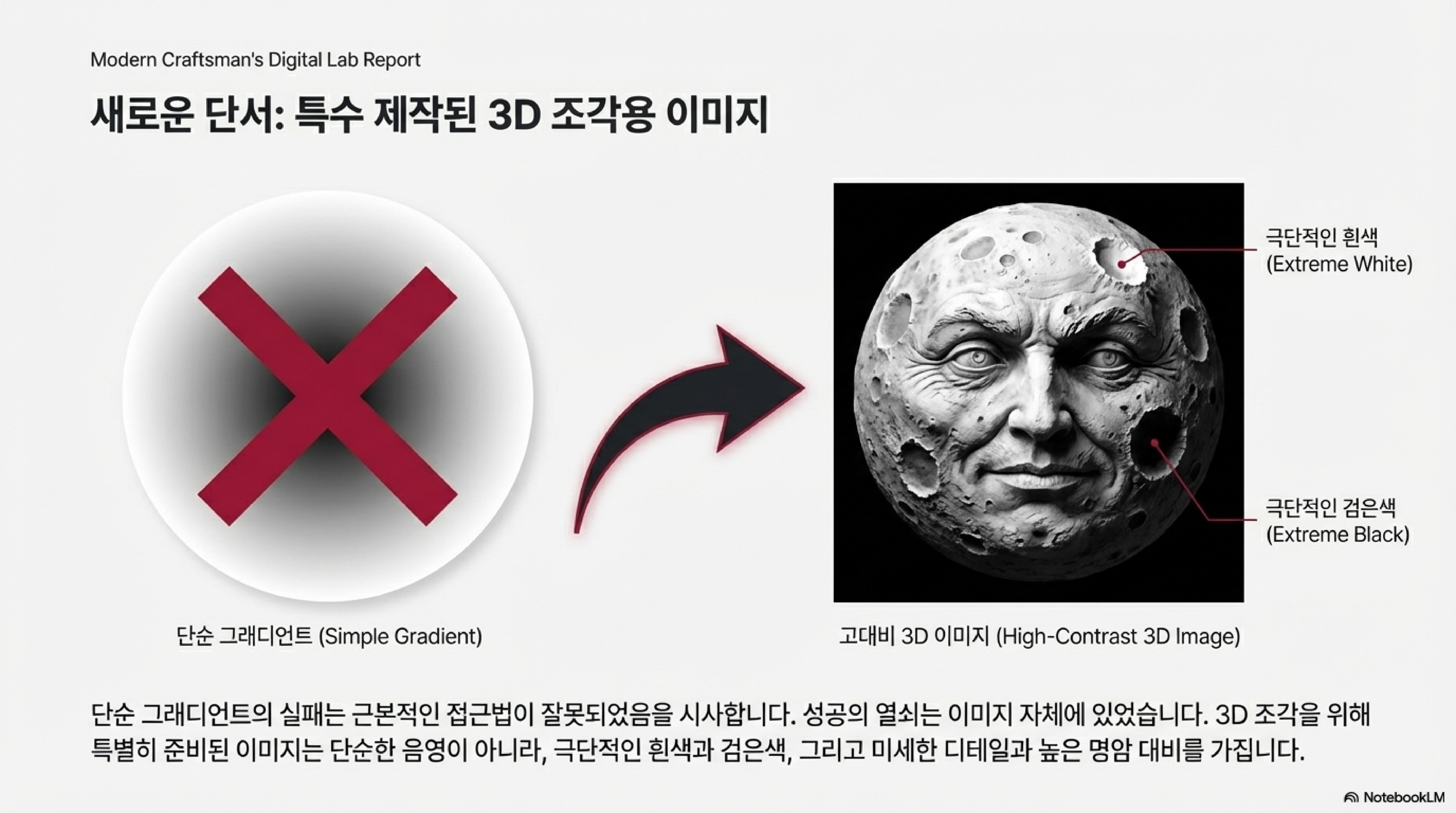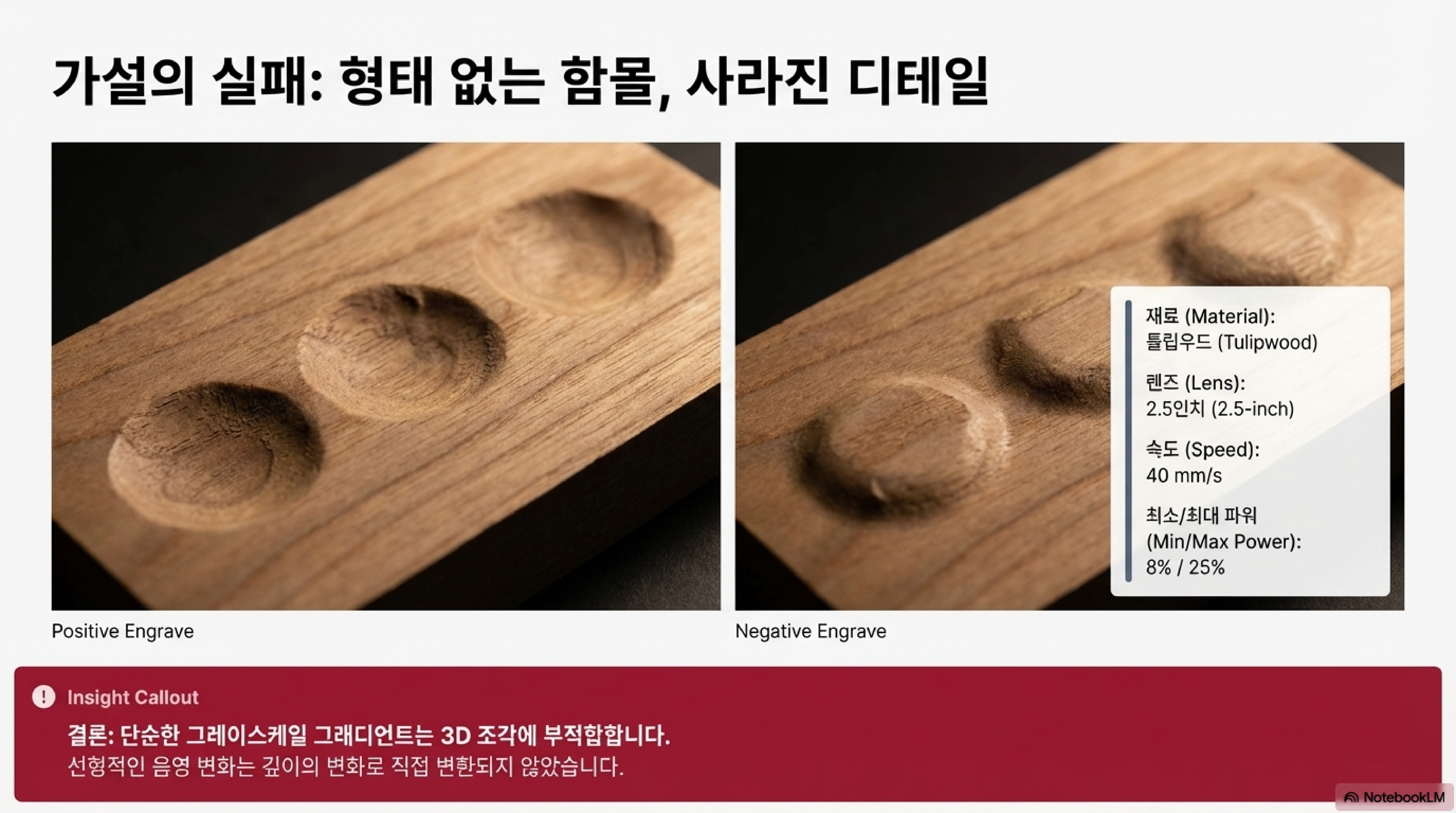 성공적인 파일들은 제가 만들었던 부드러운 명암 변화를 가진 이미지가 아니었습니다. 오히려 "흰색과 검은색의 극단적인 대비"가 뚜렷했고, "많은 흰색 및 밝은 회색 영역"을 포함하고 있었습니다. 여기서 얻은 깨달음은 이것입니다. 부드럽고 미묘한 그라데이션은 레이저 소프트웨어에게는 모호한 명령으로 해석되어 '움푹 파인 구멍'을 만들 뿐이지만, 뚜렷한 대비와 명확한 경계는 레이저에게 깊이를 조절할 수 있는 명확한 '지형도'를 제공한다는 것입니다.