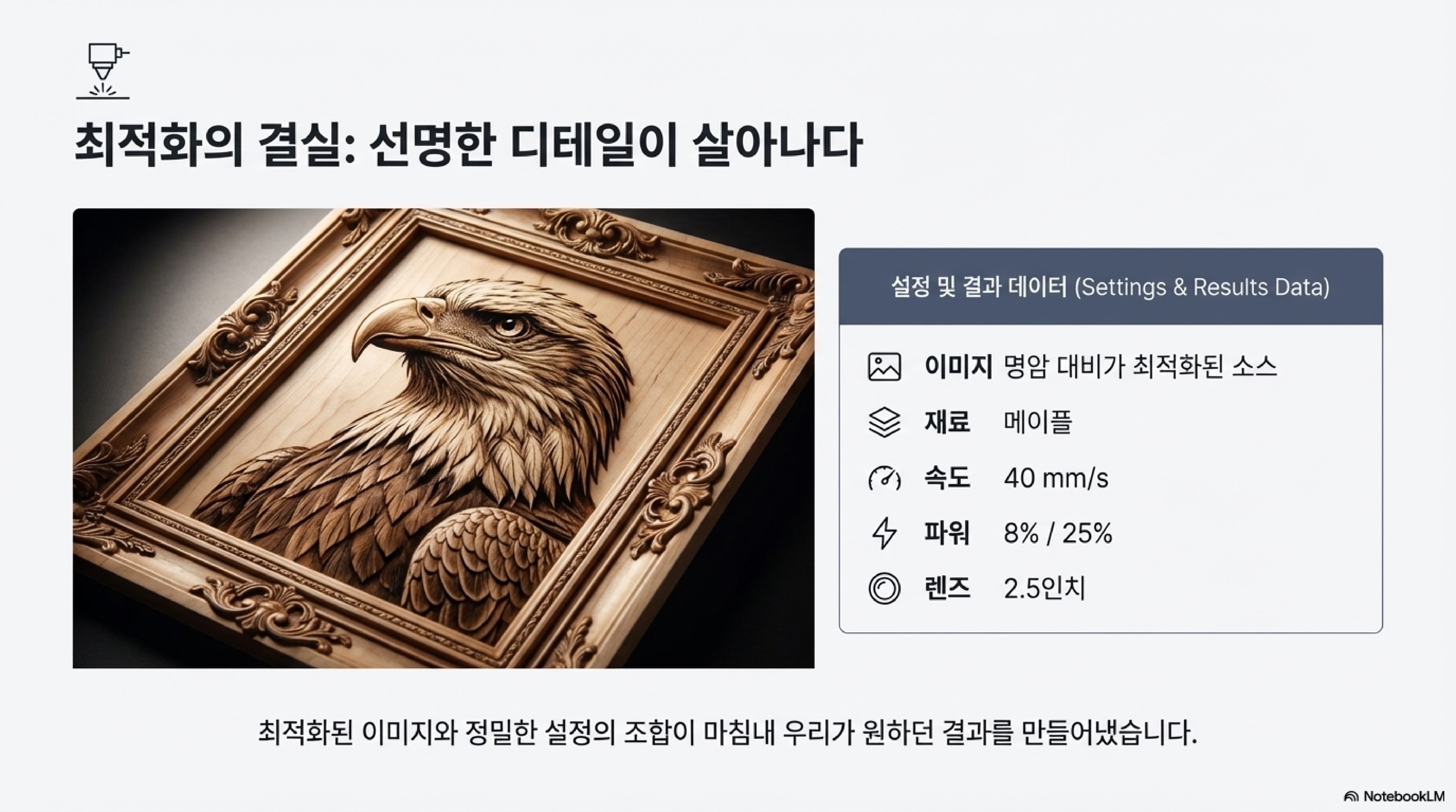 결과는 명확했습니다. 가장 느린 속도인 40mm/s에서 가장 깊고 선명한 결과물이 나왔습니다. 빠른 속도로 작업하자 디테일이 뭉개졌고, 심지어 출력을 높여도 느린 속도에서 얻은 깊이와 해상도를 결코 따라잡을 수 없었습니다.