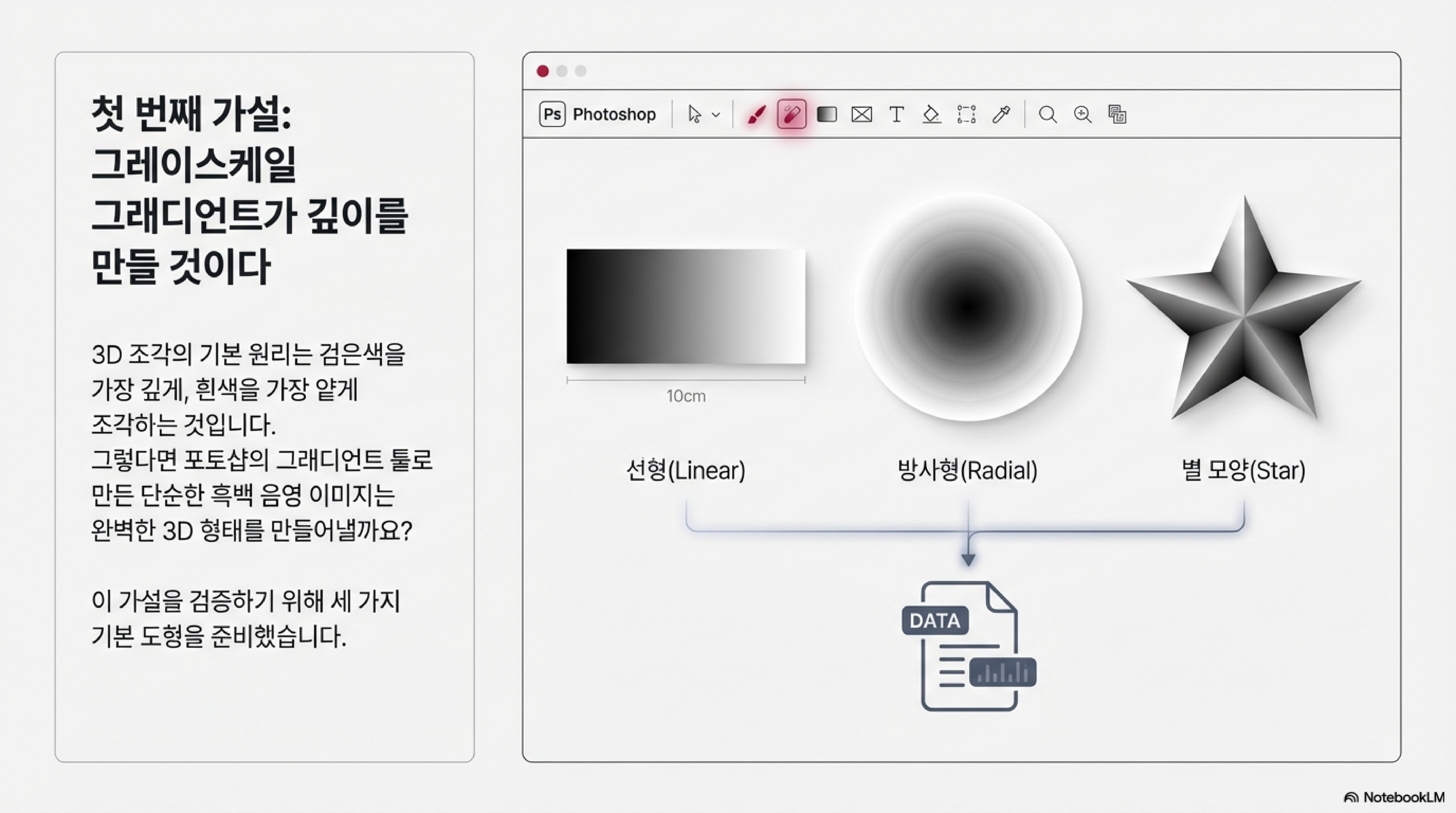 이전 실험에서 기계가 255가지 회색 음영을 표현할 수 있음을 확인했기에, 다음 단계는 명확해 보였습니다. 포토샵의 그라데이션 툴을 사용해 검은색에서 투명으로 부드럽게 이어지는 완벽하고 논리적인 그레이스케일 이미지를 만들었습니다. 제 예상대로라면, 어두운 부분은 깊게, 밝은 부분은 얕게 파여 아름다운 입체 돔 형태가 만들어져야 했습니다.