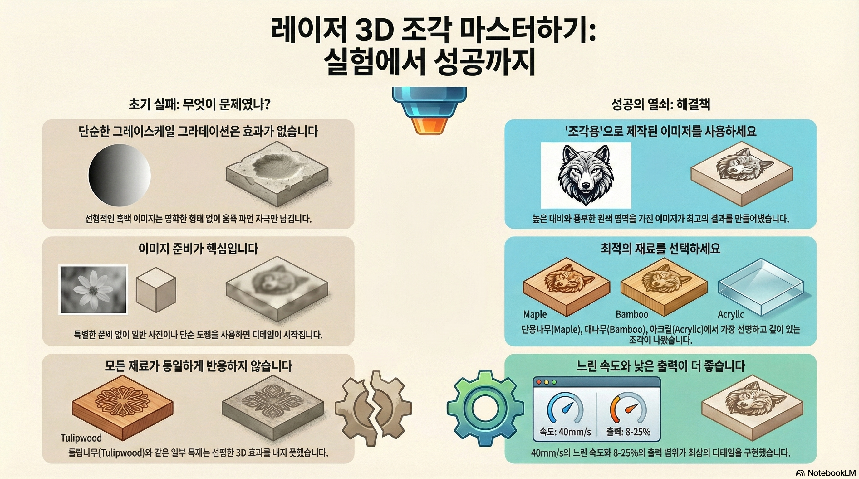 3D 레이저 조각을 통해 얻은 가장 큰 교훈은, 이 과정이 직관적인 가정이 아닌, 끊임없는 실험과 예상 밖의 발견으로 가득 차 있다는 것입니다. 저의 완벽하게 논리적인 그라데이션은 쓸모없는 구멍을 만들었고, 모두가 추천하던 단풍나무는 평범한 대나무에 자리를 내주었으며, 복잡한 고급 설정은 때로 아무 의미가 없었습니다.