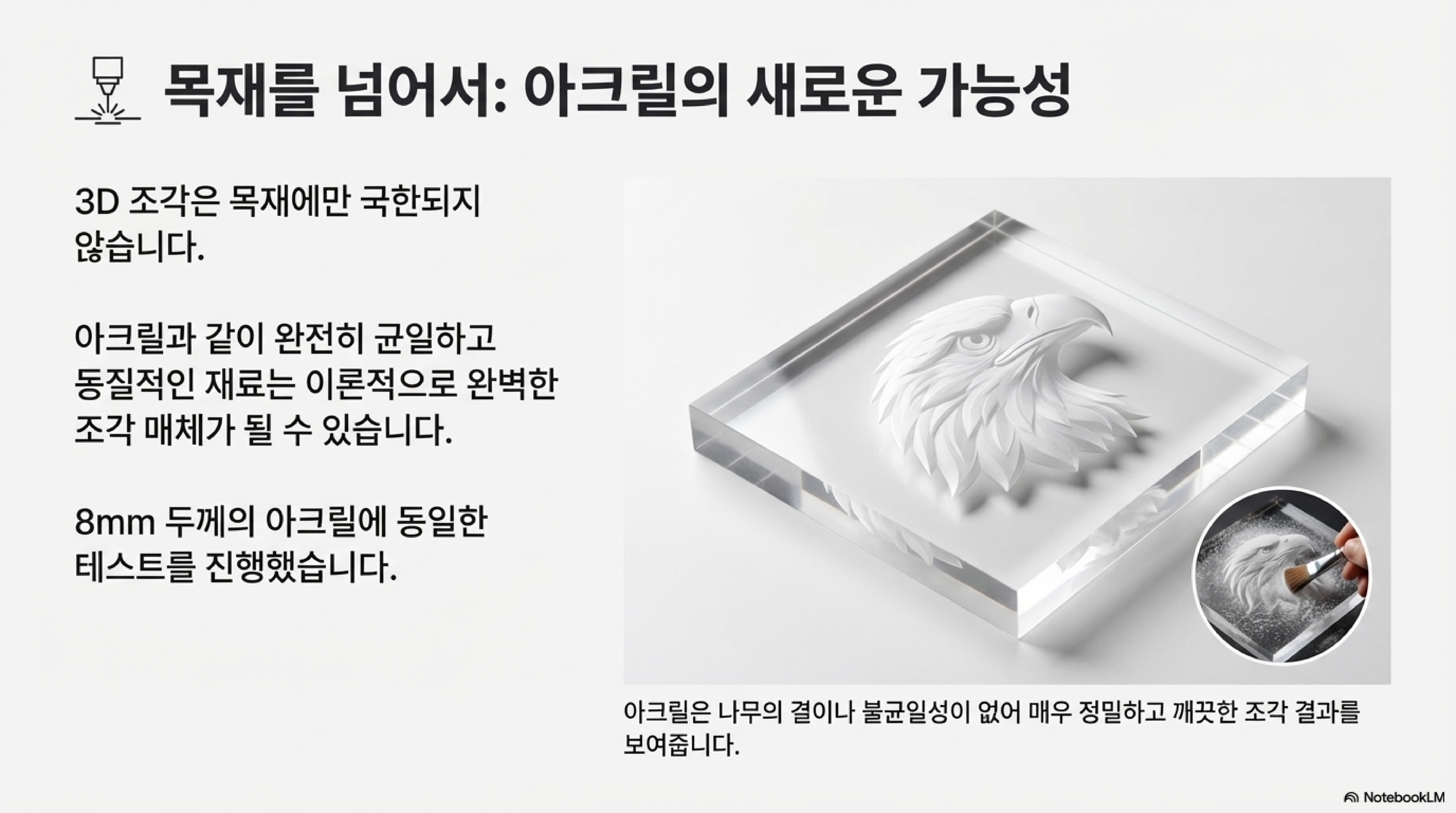더 나아가, 완벽하게 균일하고 균질한 재료인 8mm 두께의 '아크릴(Acrylic)'에 조각했을 때는 매우 깨끗하고 정교한 결과물이 탄생했습니다. 특히 이 조각의 뒷면에서 조명을 비추자, 깊이에 따라 빛이 굴절하며 극적인 효과를 만들어내는 '엣지릿 사인(edgelit sign)'으로서의 엄청난 잠재력을 보여주었습니다. (이것은 중요한 교훈이었습니다. 전문가의 조언은 훌륭한 출발점이지만, 최종 목적지는 아닙니다. 진정한 발견은 내가 가진 재료를 직접 테스트하는 과정에서 나옵니다.)