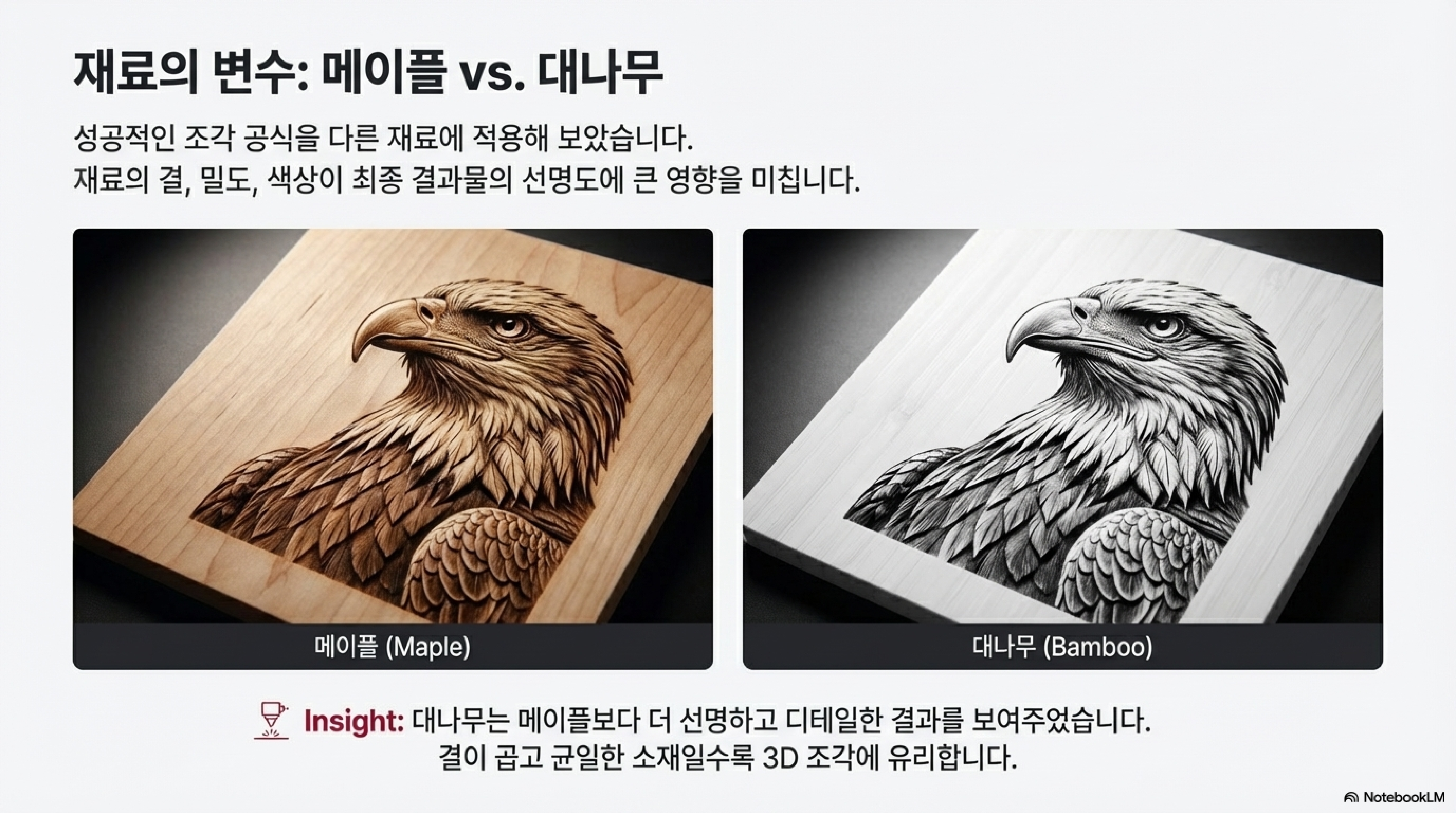 하지만 진짜 놀라움은 예상치 못한 곳에서 찾아왔습니다. 평범한 '대나무(Bamboo)' 조각판에 같은 이미지를 새겼을 때, 결과는 훨씬 더 인상적이었습니다. 끈적한 그을음 잔여물을 뜨거운 물과 솔로 꼼꼼히 닦아내자, 대나무 위 디테일이 단풍나무보다 훨씬 더 선명하게 살아났습니다.
