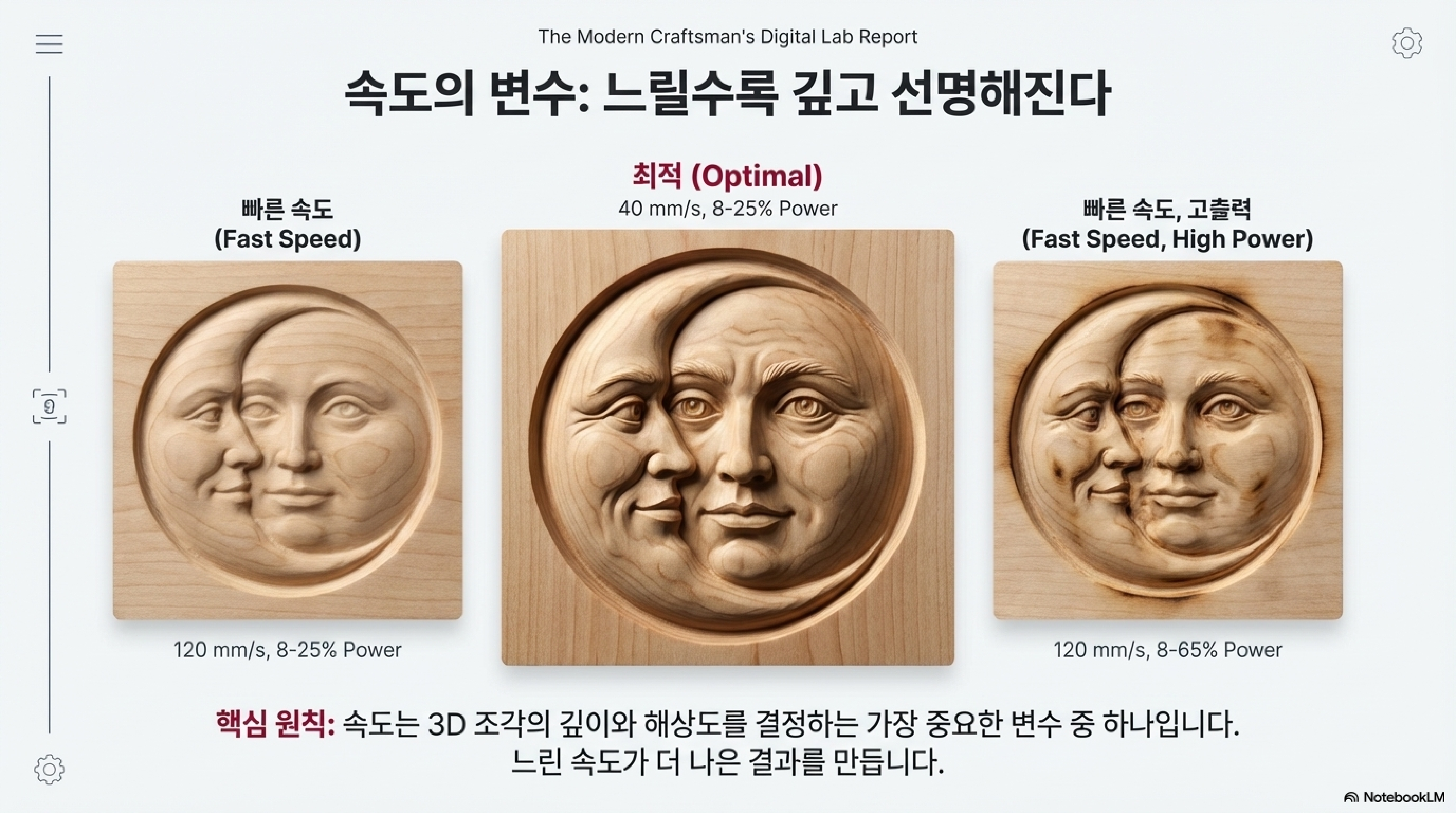 효율성을 위해 속도를 높이고 싶은 유혹은 강렬하지만, 3D 조각의 세계에서는 인내심이 곧 품질로 직결된다는 것을 배웠습니다. 저는 '달 속의 남자(Man in the Moon)' 이미지를 단풍나무에 조각하며 세 가지 속도 테스트를 진행했습니다.
