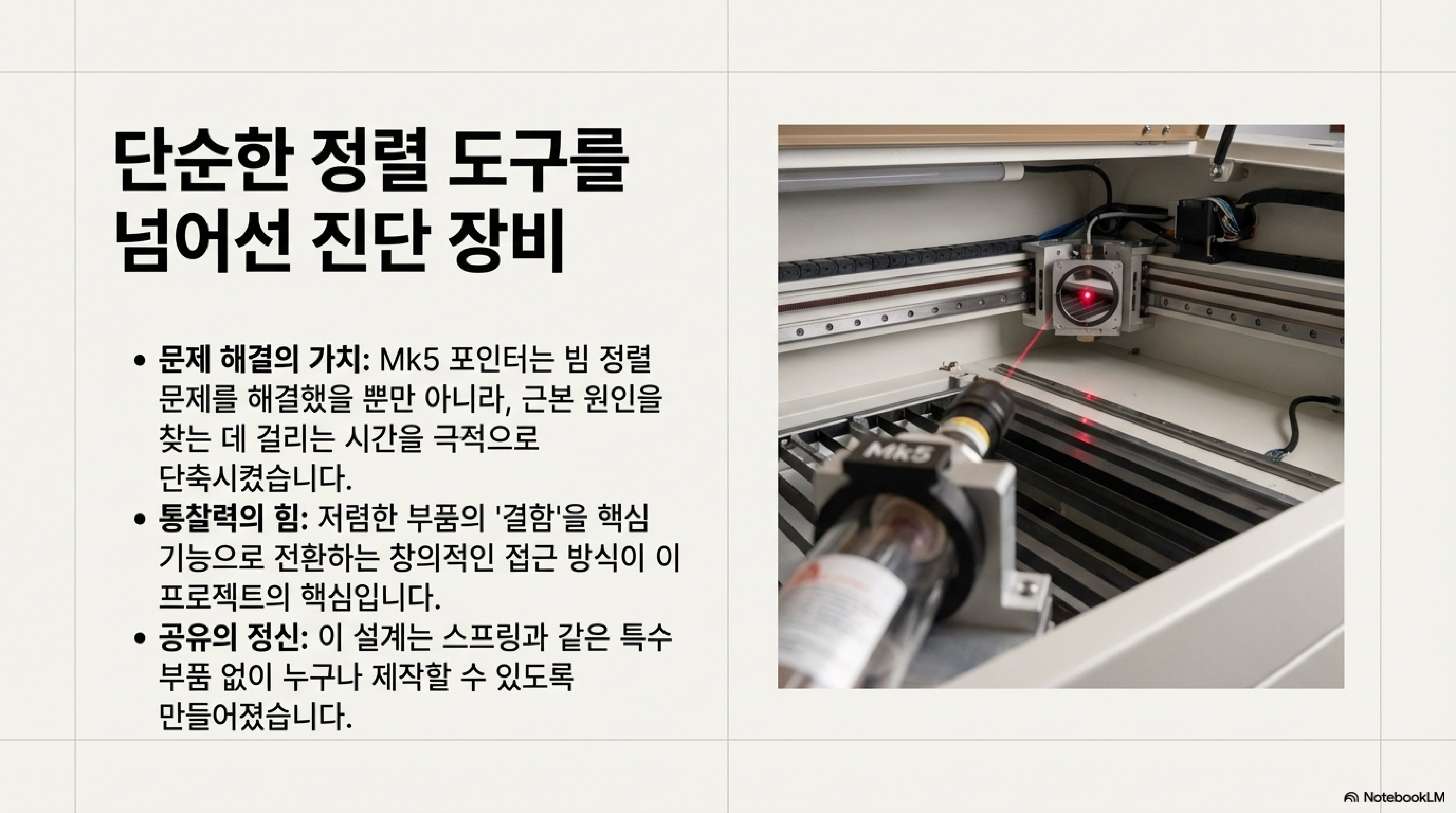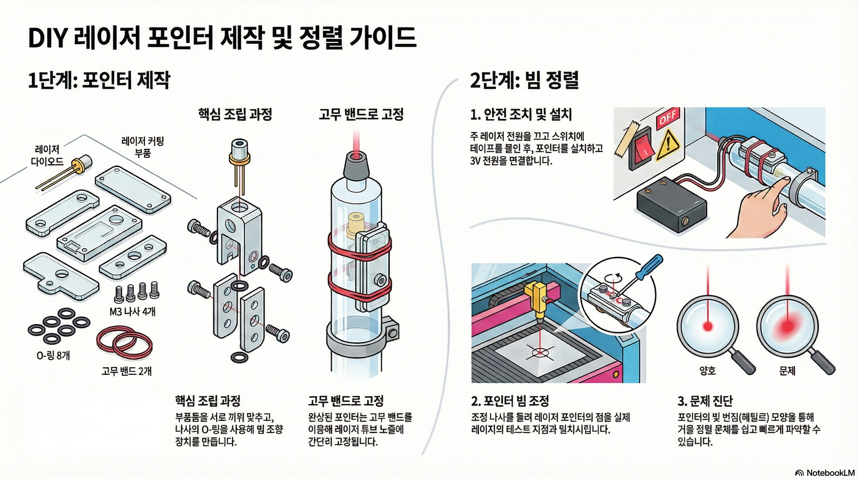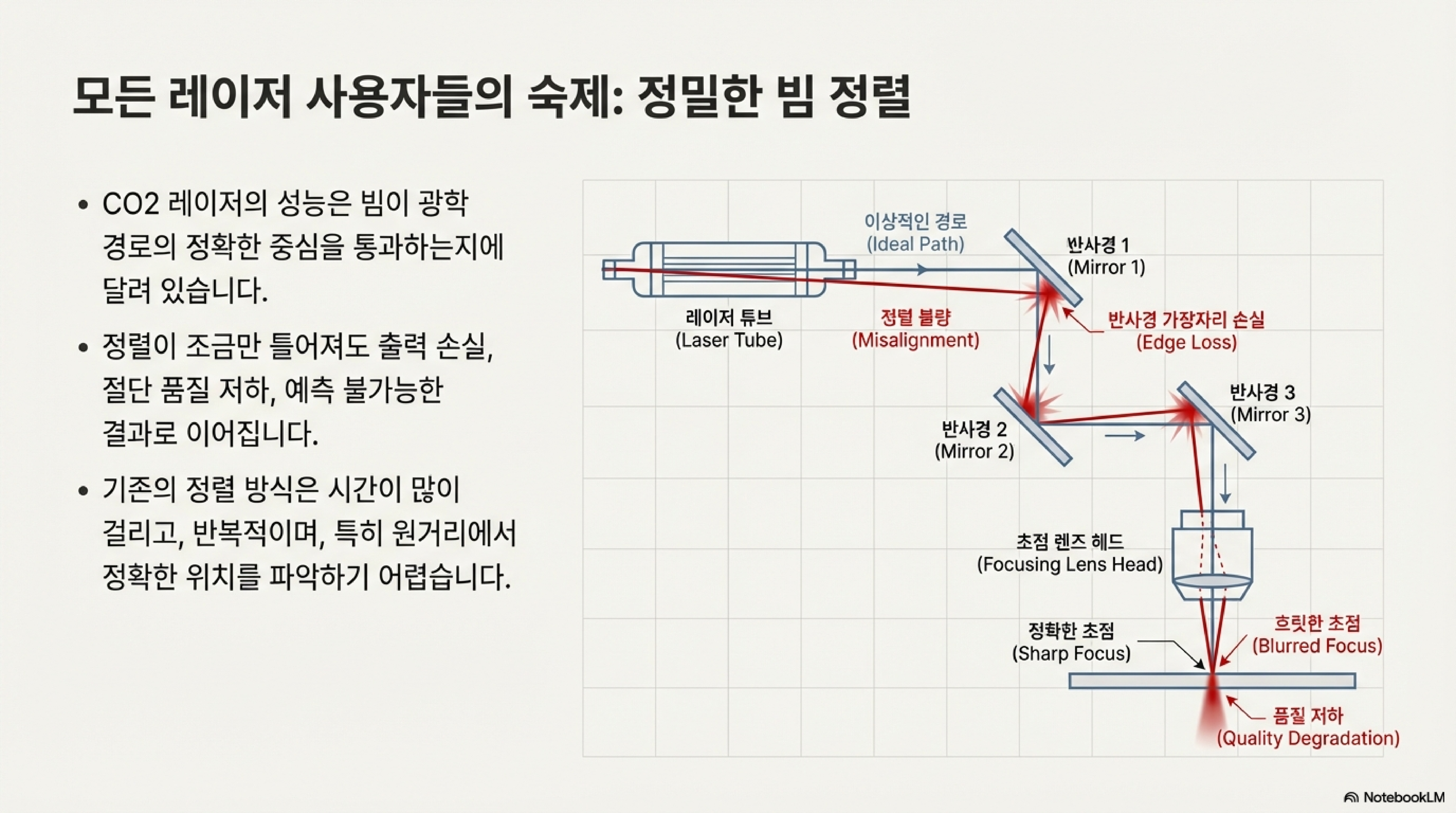 레이저 커터 사용자라면 누구나 그 지독한 의식을 알 것입니다. 바로 '빔 정렬'입니다. 눈을 가늘게 뜨고, 레이저를 짧게 발사하고, 그을린 자국을 확인하고, 거울 나사를 머리카락 두께만큼 돌리는 지루한 반복 작업. 끝없는 인내심을 요구하는 이 과정은 창의적인 프로젝트를 시작하기도 전에 우리의 에너지를 소진시키곤 합니다. 저 역시 새로운 60W 레이저 튜브에 맞는 포인터를 구상하며 이 문제에 직면했고, 아주 간단하고 저렴한 DIY 프로젝트를 시작하게 되었습니다. 하지만 이 작은 장치를 만드는 과정에서 저는 예상치 못했던 깊고 놀라운 통찰을 얻게 되었습니다. 단순한 도구가 어떻게 복잡한 문제 해결의 실마리를 제공했는지, 그 놀라운 교훈 세 가지를 공유하고자 합니다.