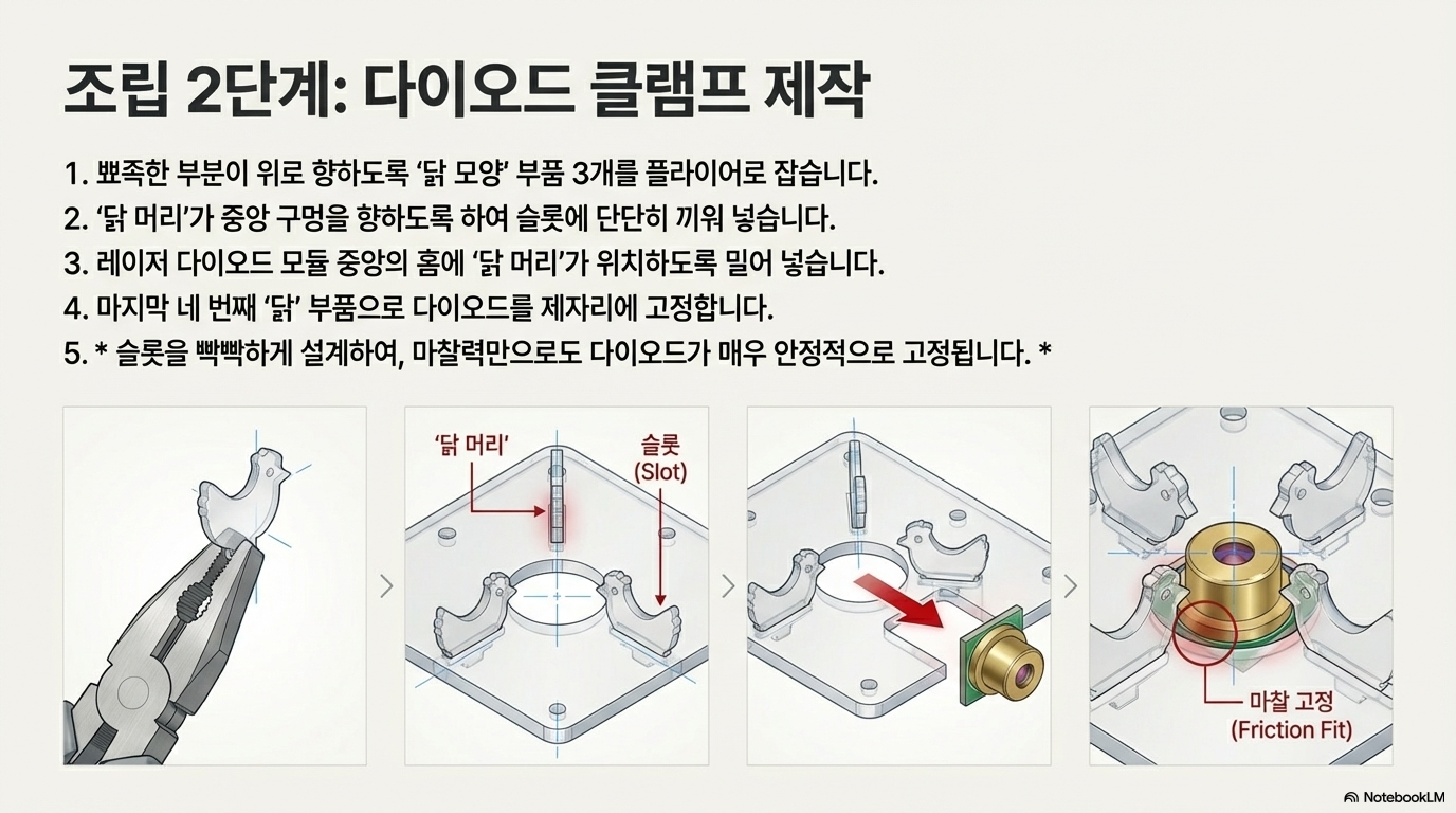 조립 과정은 놀라움의 연속이었습니다. 각 부품은 접착제 한 방울 없이도 '푸시핏(push fit)' 방식으로 결합되었습니다. 부품들은 그냥 미끄러지듯 들어가는 것이 아니라, 정확히 정렬하여 힘을 주어 누르면 만족스러운 '딸깍' 소리와 함께 끼워져 믿을 수 없을 만큼 견고한 구조를 만들어냈습니다. 하지만 이 설계의 진짜 천재성은 '조정용 나사'에 숨겨져 있었습니다. 이 나사들은 단순히 빔의 방향을 조절하는 역할만 하는 것이 아니었습니다. 네 개의 나사가 만들어내는 분산된 장력 시스템이 전체 조립품을 단단히 고정하는 안정적이고 조절 가능한 '새장'을 형성했습니다. 힘이 완벽하게 균형을 이루는 것입니다.