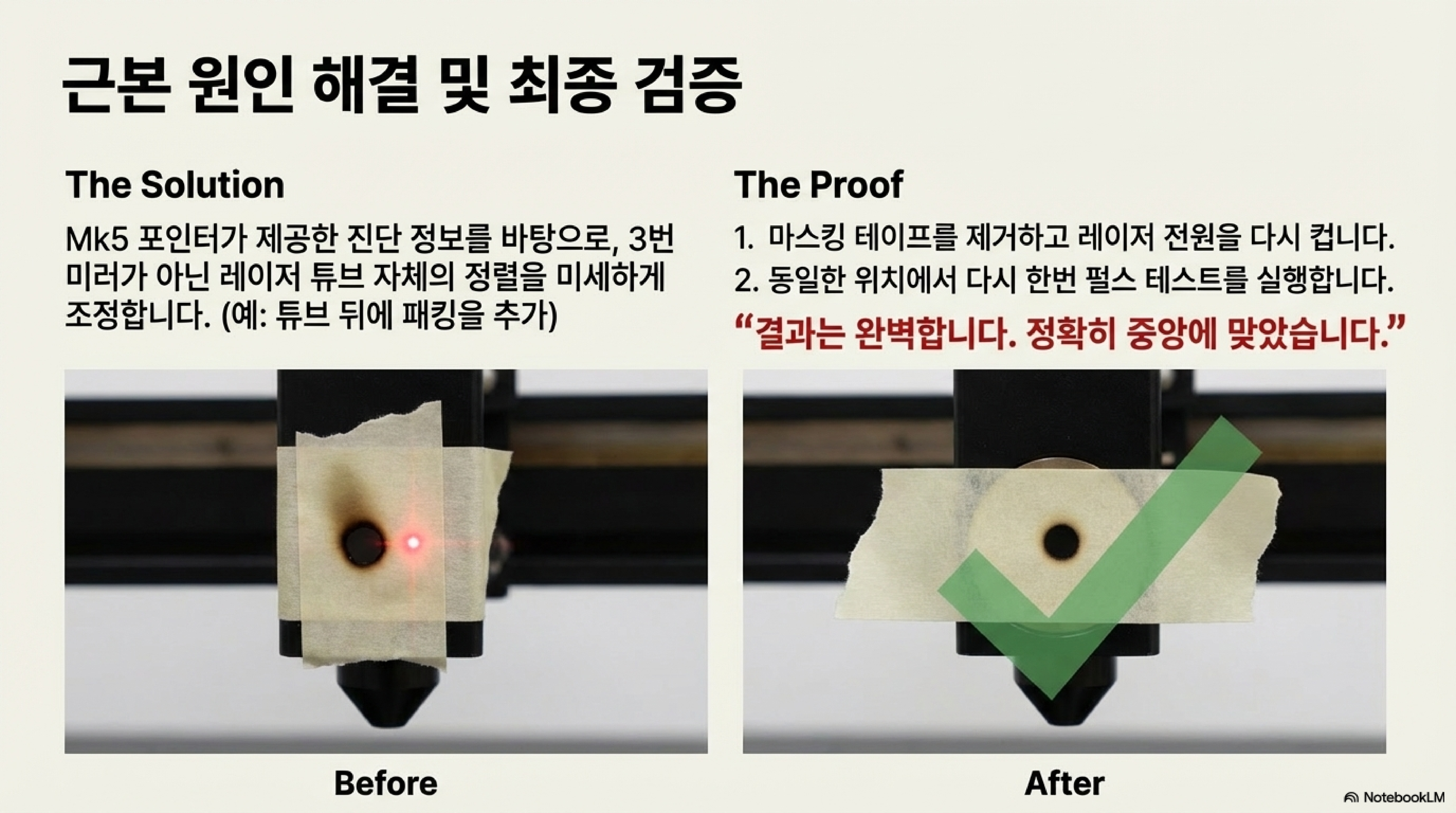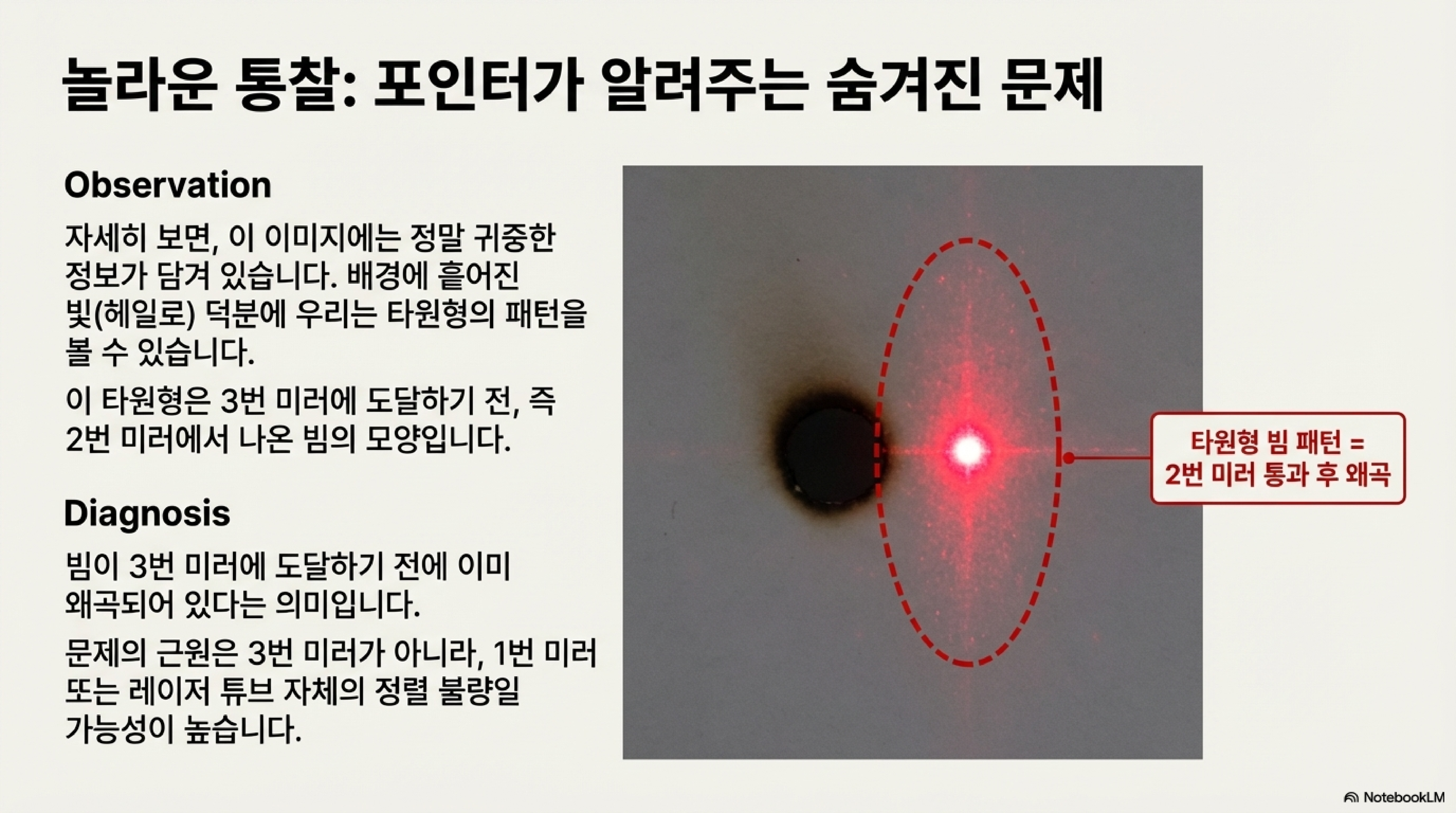 하지만 실제 테스트에 들어가자 이 생각은 완전히 뒤집혔습니다. 만약 포인터가 완벽하게 깨끗한 점만 보여주었다면, 최종 지점의 위치 오류만 알려주었을 것입니다. 하지만 이 '결함' 있는 헤일로는 그 이상의 것을 보여주었습니다. 그것은 바로 이전 거울(mirror 2)을 통과한 레이저 빔의 실제 형태, 즉 타원형 모양을 그대로 보여주는 진단 도구였습니다. 이 흐릿한 빛 번짐 덕분에 저는 문제가 최종 거울에 도달하기 전, 즉 빔이 이미 두 번째 거울을 나올 때부터 모양과 위치가 틀어져 있었다는 근본적인 원인과 형태를 즉시 파악할 수 있었습니다.