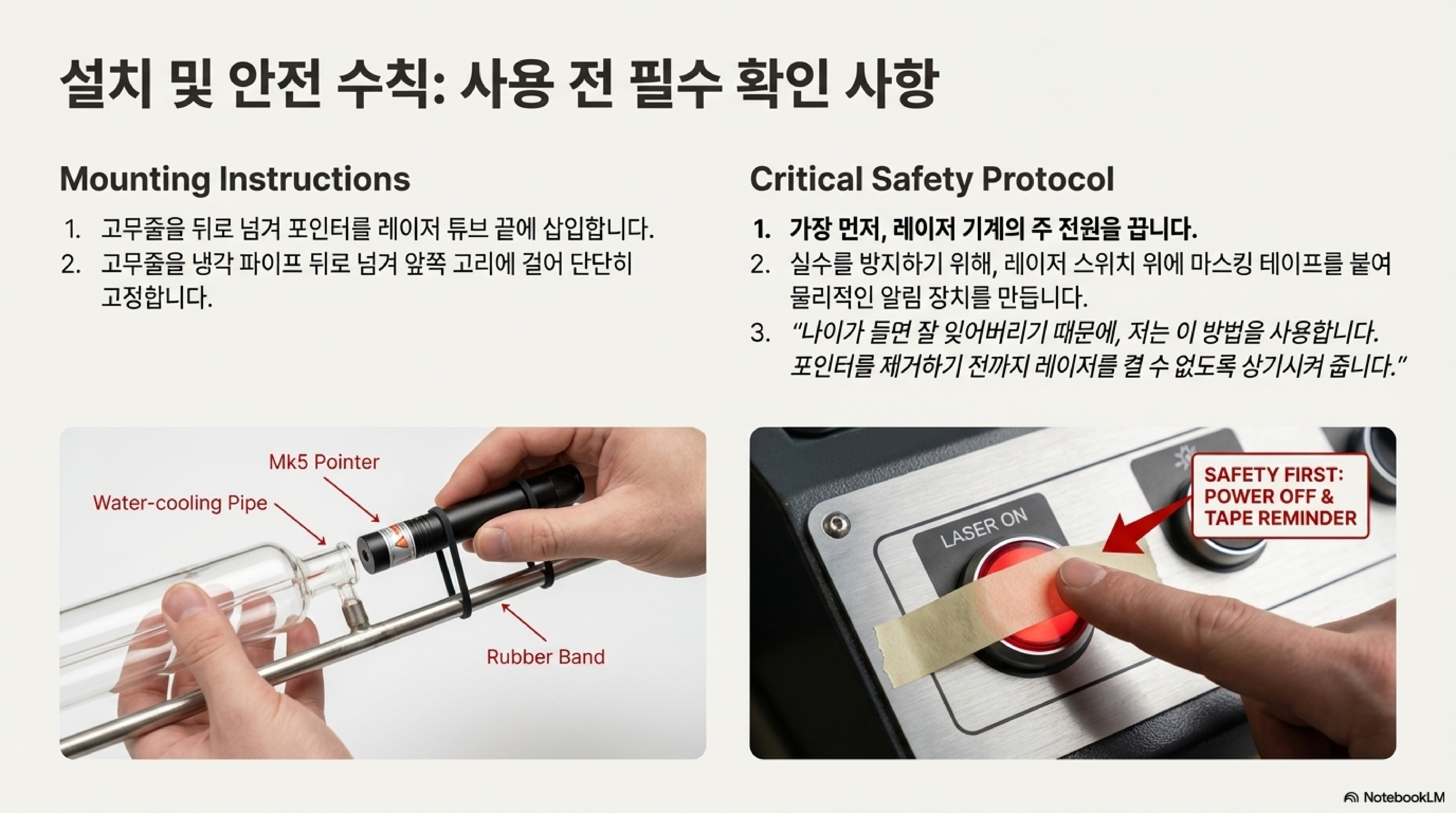 마지막 교훈은 복잡성을 넘어선 실용주의에 관한 것입니다. 이 정교한 포인터를 수천 볼트의 전압이 흐르는 레이저 튜브에 고정하기 위해 CNC로 가공된 알루미늄 브래킷은 필요 없었습니다. 해답은 훨씬 단순했습니다. 바로 평범한 '고무줄(elastic bands)' 두 개였습니다.