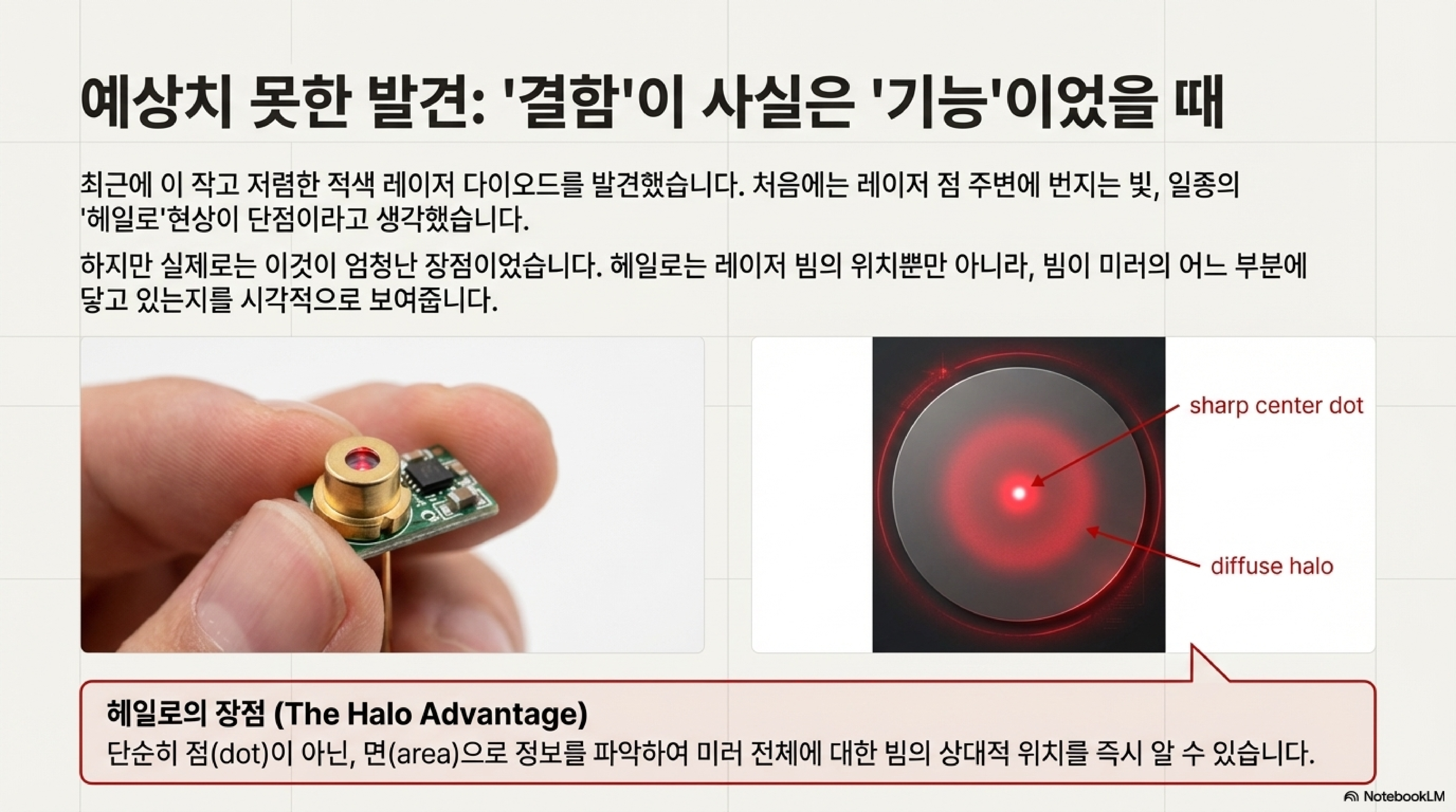 첫 번째 교훈은 저렴한 부품의 '결함'이 어떻게 강력한 장점으로 변모했는지에 대한 이야기입니다. 이 프로젝트에 사용된 레이저 다이오드는 매우 저렴했지만, 완벽하게 선명한 점을 만들지 못했습니다. 대신, 중심점 주변으로 붉은빛이 번지는 '헤일로(Halo)' 현상이 있었습니다. 처음에는 이것이 당연히 단점이라고 생각했습니다. 정밀한 포인팅이 생명인데, 빛이 번진다는 것은 명백한 결함처럼 보였기 때문입니다.