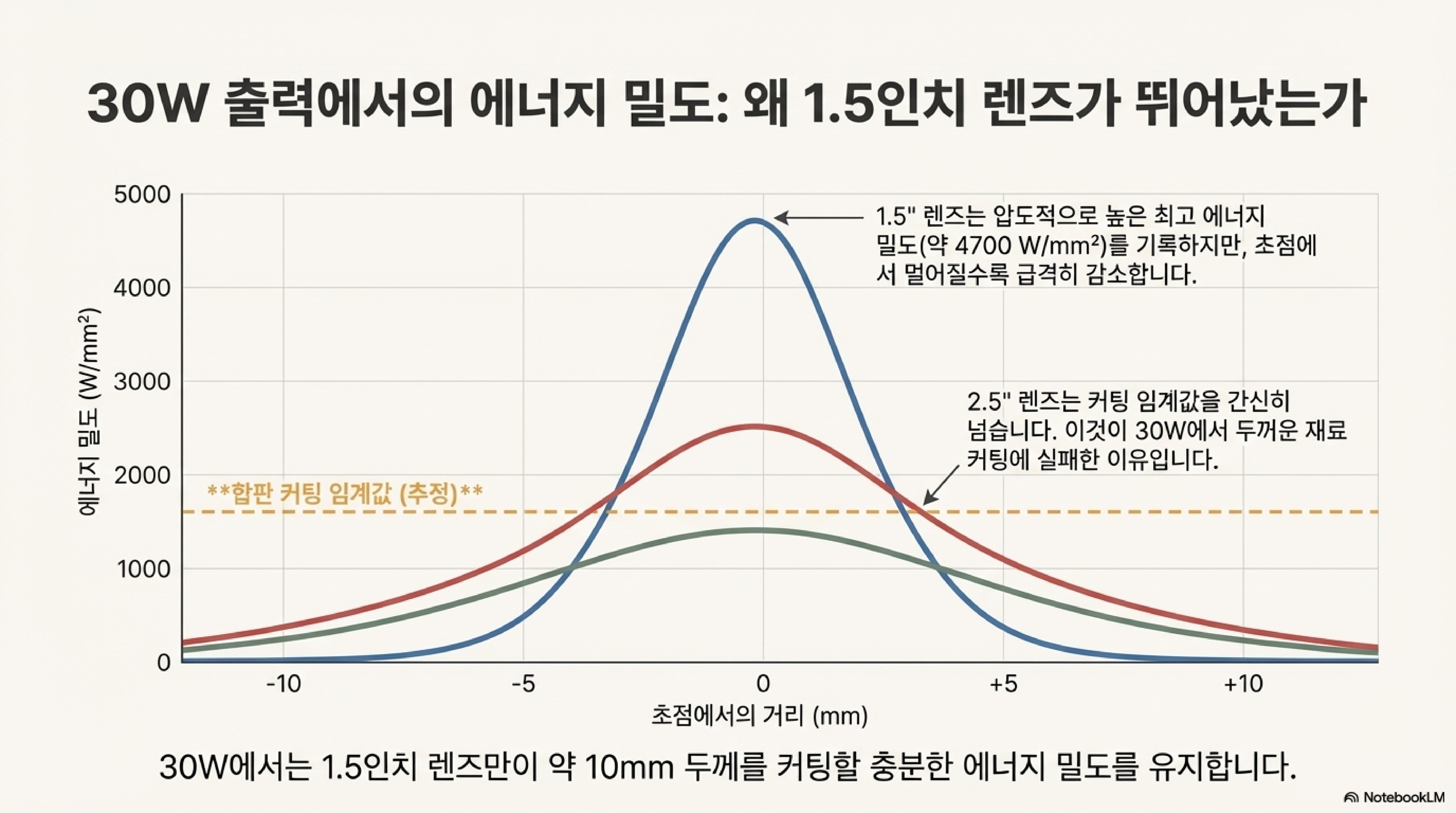 긴 초점 렌즈는 더 평행에 가까운 빔 형태 덕분에 깊은 곳까지 에너지 밀도를 유지할 수 있어 두꺼운 재료 절단에 유리한 것이 사실입니다. 하지만 이는 기계가 애초에 충분한 출력을 가지고 있을 때만 유효한 이야기입니다. 긴 렌즈는 빔 스폿이 크기 때문에 최대 에너지 밀도 자체가 낮습니다. 만약 초기 출력이 너무 낮으면, 이 에너지 밀도는 재료를 절단하는 데 필요한 임계값에 도달조차 못 할 수 있습니다.