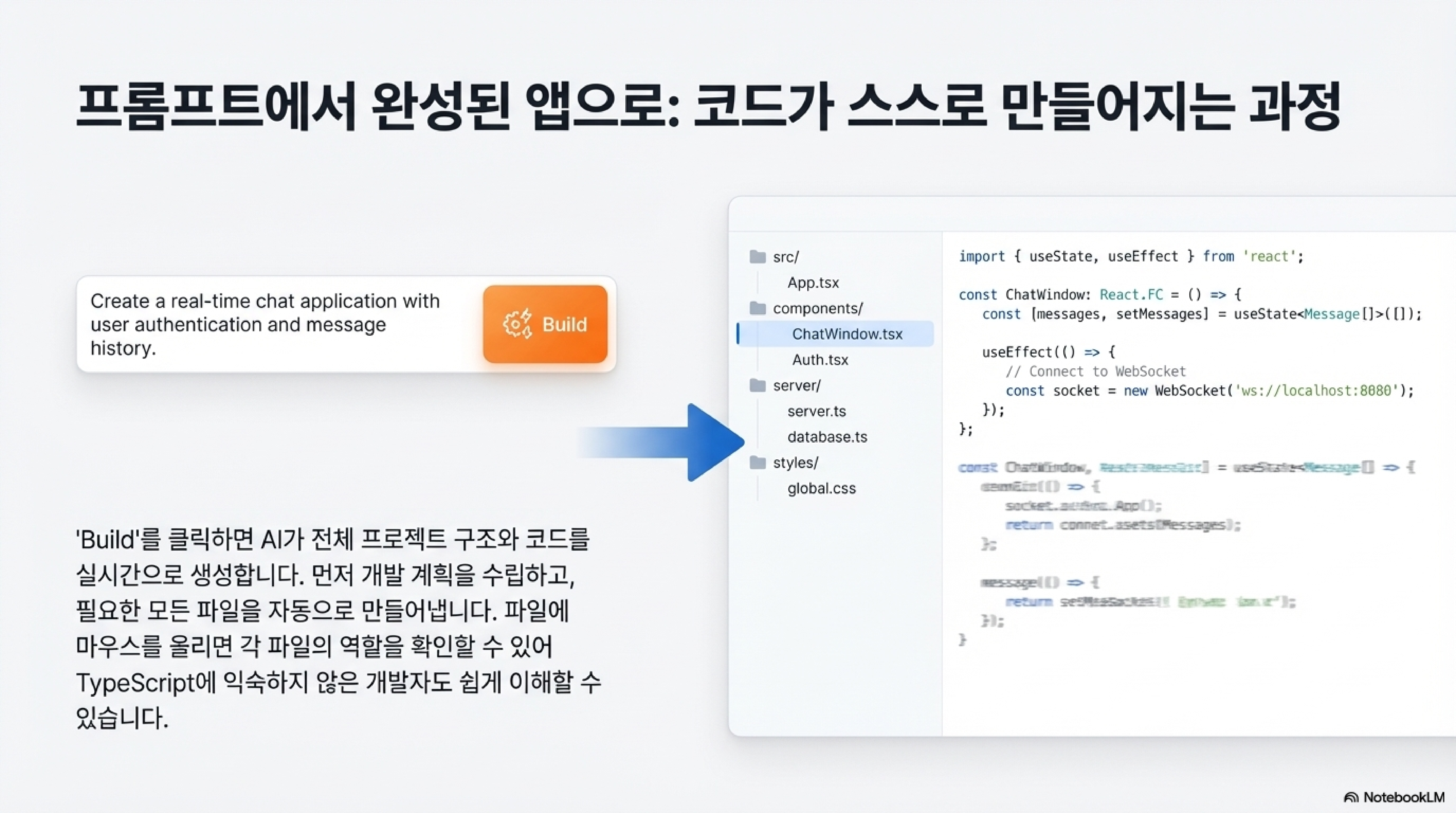 AI Studio는 앱을 생성하는 동안, 어떤 파일이 만들어지고 각 파일이 어떤 역할을 하는지 실시간으로 설명해 줍니다. 예를 들어, 특정 파일 위로 마우스를 가져가면 '이 파일은 React 앱의 진입점을 만들고 앱 컴포넌트를 렌더링합니다'와 같은 명확한 설명을 볼 수 있습니다. 덕분에 타입스크립트에 익숙하지 않은 개발자도 전체 코드 구조를 직관적으로 이해할 수 있습니다. AI Studio가 단순한 개발 도구를 넘어, 복잡한 기술의 학습 곡선을 완만하게 만들어주는 훌륭한 교육 도구가 될 수 있음을 보여주는 대목입니다.