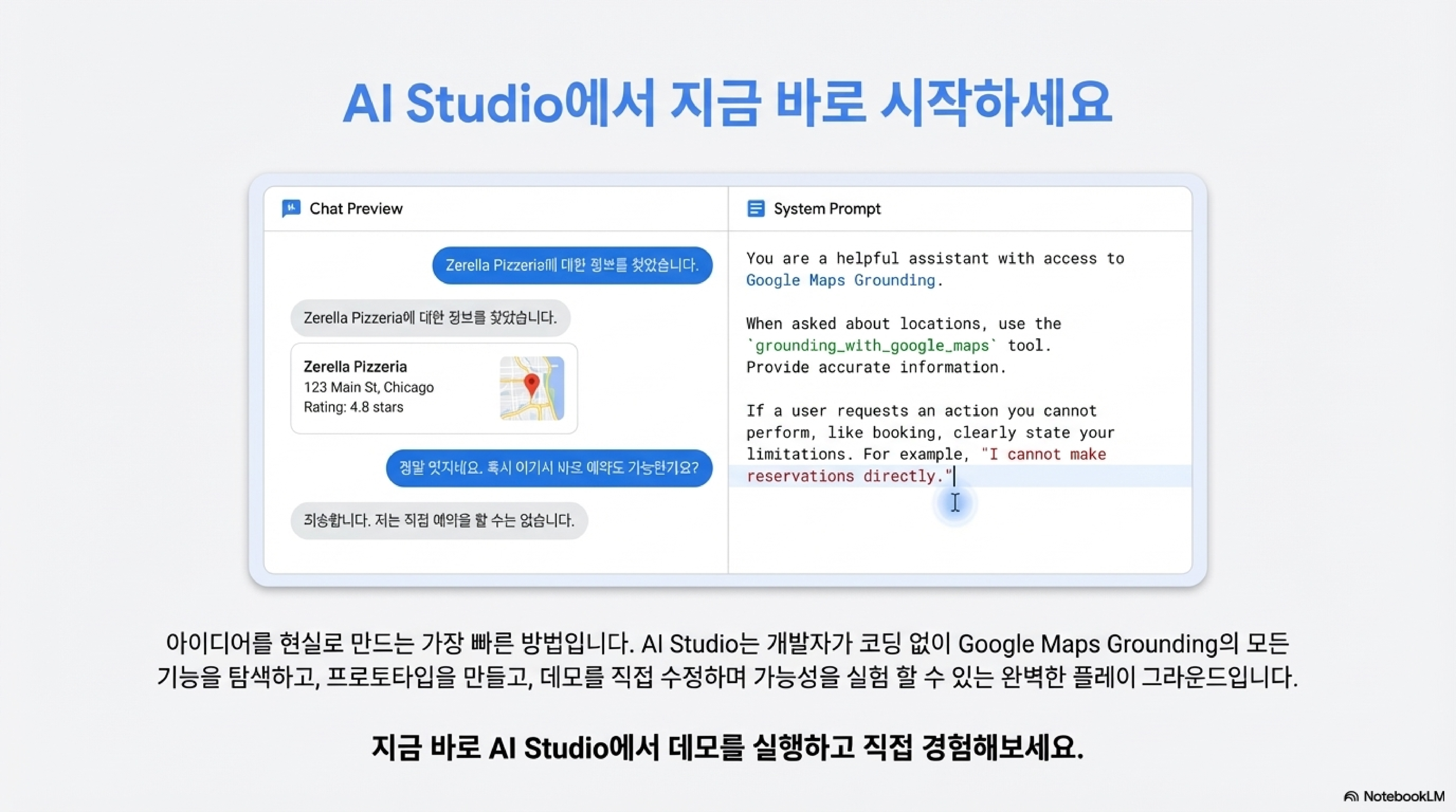 특히 주목할 부분은 '시스템 프롬프트'를 직접 수정하여 AI의 행동 방식을 세밀하게 설계할 수 있다는 점입니다. 이는 단순히 기능을 켜고 끄는 수준을 넘어, 우리 브랜드의 목소리(Voice)와 원칙(Principle)을 AI에 심는 과정과 같습니다. 예를 들어, 데모에서는 도구를 호출할 때 "잠시만요, Google Maps 연동 기능을 사용해 볼게요(Give me a second while I use grounding with Google Maps)"와 같은 특정 문구를 말하도록 AI에게 지시할 수 있습니다. 이처럼 여러분은 AI의 응답 톤앤매너부터 특정 상황에서의 행동 지침까지 직접 정의하며, 브랜드 아이덴티티가 녹아든 사용자 경험을 정교하게 구현할 수 있습니다.