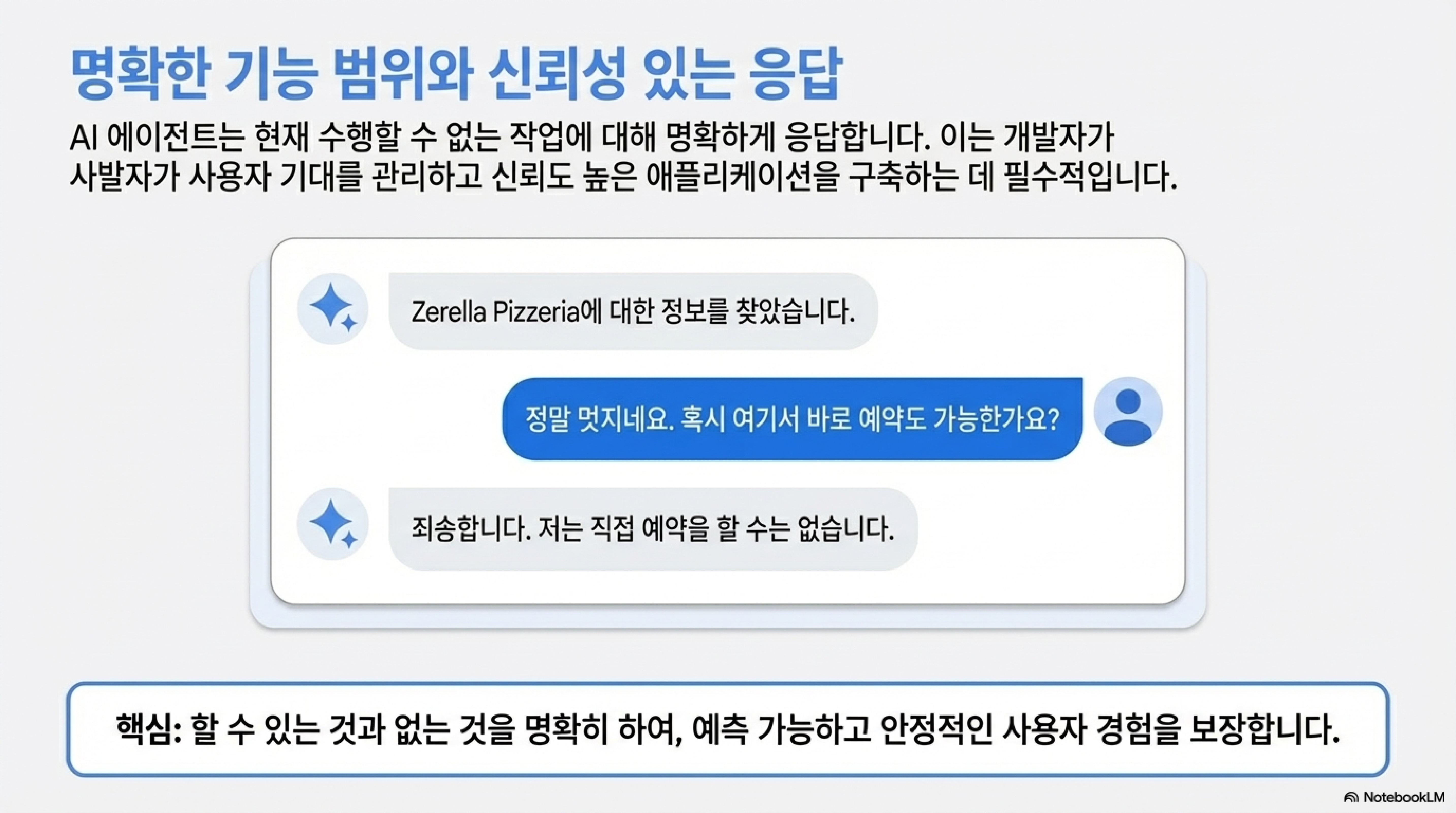 AI가 "죄송하지만, 제가 직접 예약할 수는 없습니다"라고 솔직하게 답변하는 것은 '버그'가 아니라 매우 중요한 '기능'입니다. 이는 사용자에게 불가능한 약속을 하거나 잘못된 정보를 제공하는 것을 막아 브랜드 신뢰도를 지켜줍니다. 할 수 없는 일을 솔직하게 말하는 것은 사용자와의 장기적인 신뢰 관계를 구축하는 가장 정직한 방법입니다. 이처럼 AI가 자신의 능력을 투명하게 밝히는 것은, 결국 사용자가 신뢰할 수 있는 애플리케이션을 구축하는 데 있어 핵심적인 요소가 됩니다.