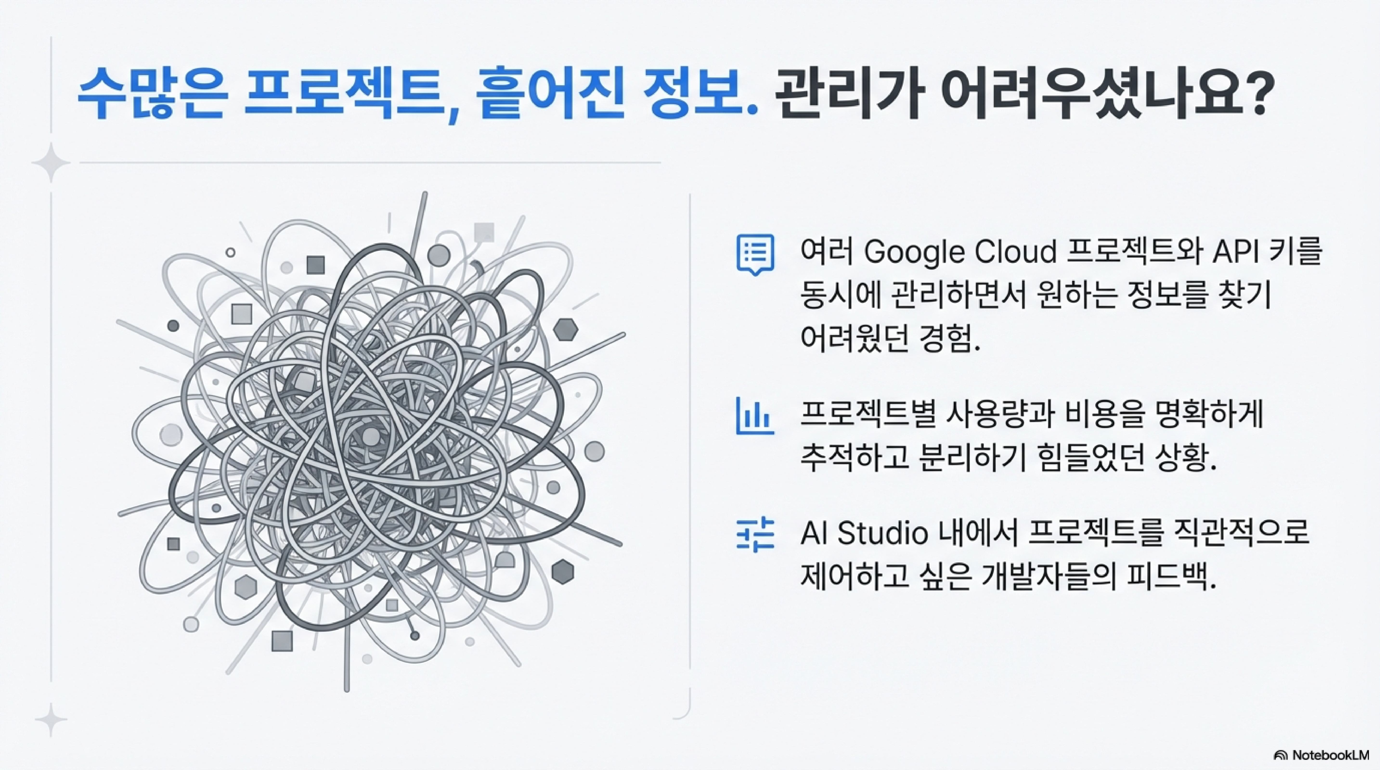 혹시 수많은 Google Cloud 프로젝트 속에서 길을 잃거나, 이름만으로는 용도를 알 수 없는 API 키 목록을 보며 혼란스러웠던 적 없으신가요? 바로 여러분과 같은 개발자들을 위해, Google AI Studio가 오랜 골칫거리였던 프로젝트와 API 키 관리를 획기적으로 개선하는 업데이트를 선보입니다.