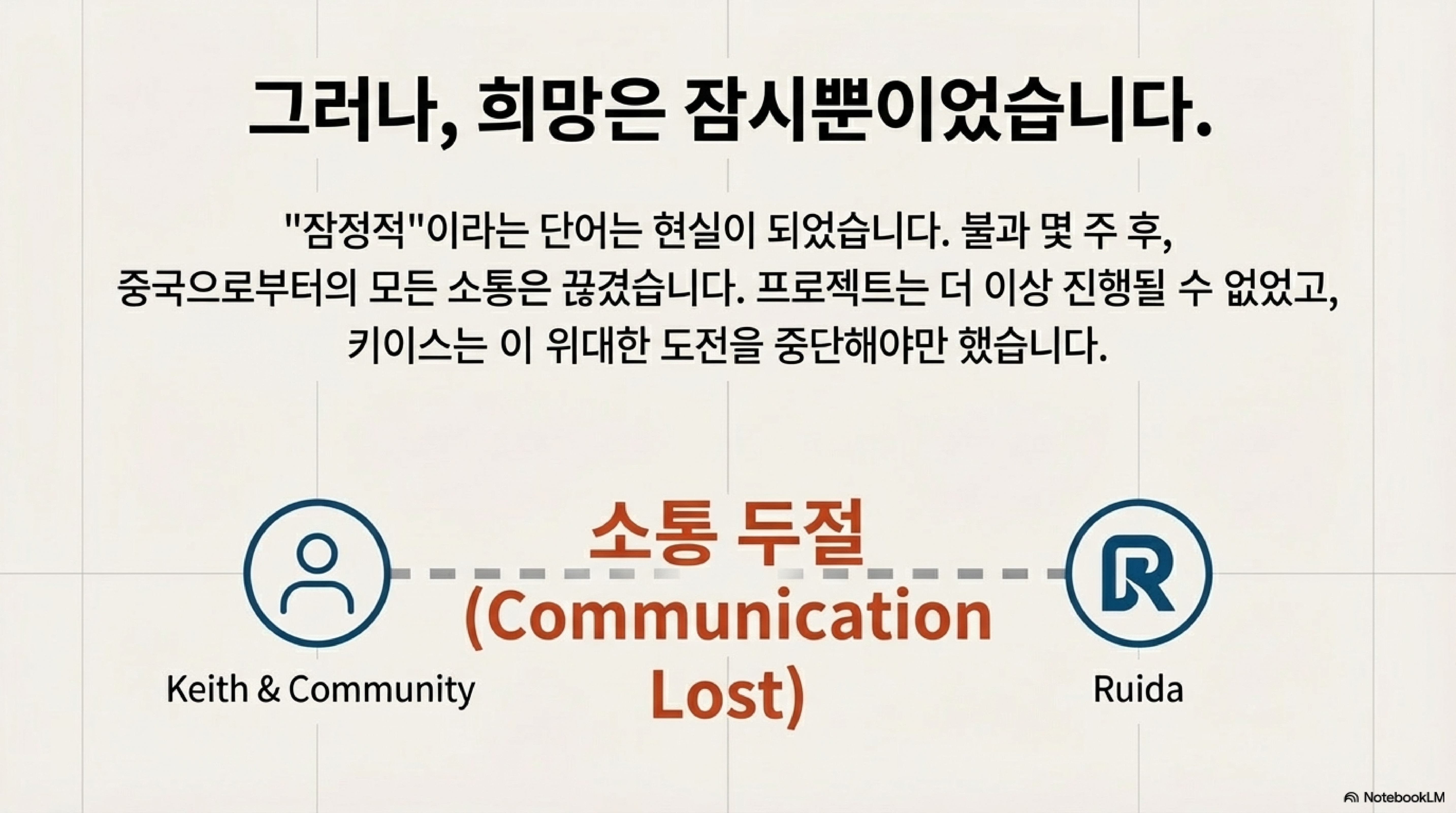 프로젝트의 시작은 희망적이었습니다. 키스는 소프트웨어 개발사인 Ruida에 직접 연락했고, 회사 측은 "잠정적으로 그를 돕기로 동의"했습니다. 그러나 그 희망은 오래가지 못했습니다. 불과 몇 주 만에 중국 본사로부터의 모든 소통이 끊겼고, 키스는 안타깝게도 이 프로젝트를 포기해야만 했습니다.