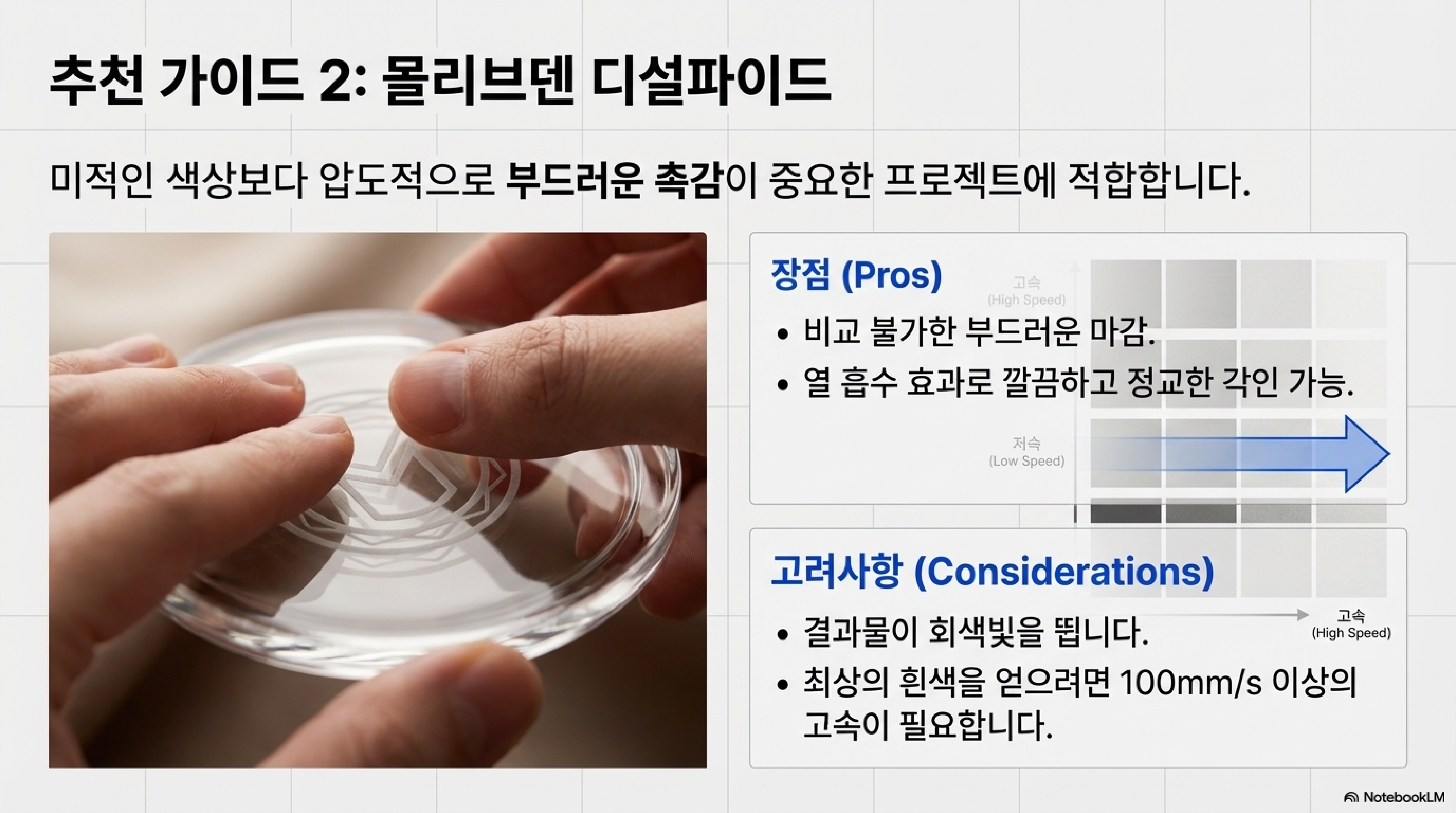 저의 가설은 이황화 몰리브덴 코팅이 레이저의 과도한 열에너지를 일부 흡수하여, 유리가 급격한 팽창으로 인해 깨지거나 부서지는 현상을 막아준다는 것입니다. 그 덕분에 훨씬 더 부드럽고 균일한 표면이 만들어지는 것으로 보입니다. 실제로 만져봤을 때의 질감은 모든 샘플 중 단연 "최고(superb)"였습니다. 하지만 전체적인 색감이 약간 회색빛을 띠고 있어, 순백의 느낌을 원한다면 "예쁘지는 않다"는 아쉬움이 있었습니다.