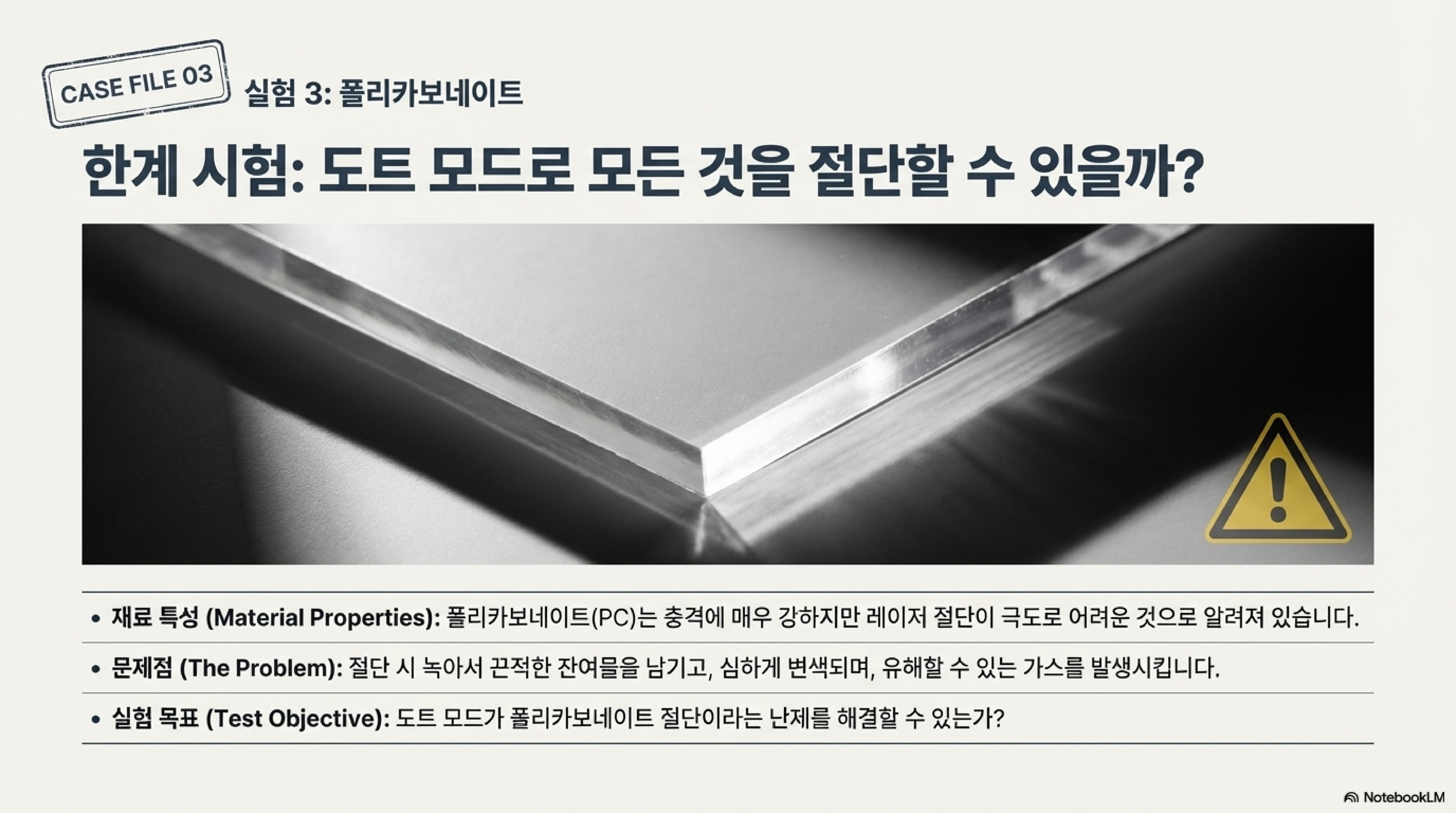 지금까지 도트 모드의 장점들을 살펴봤지만, 이 기능이 모든 문제에 대한 만능 해결책은 아니라는 점을 명심해야 합니다. 특히 절대 사용해서는 안 될 재료도 있습니다. 바로 폴리카보네이트입니다.