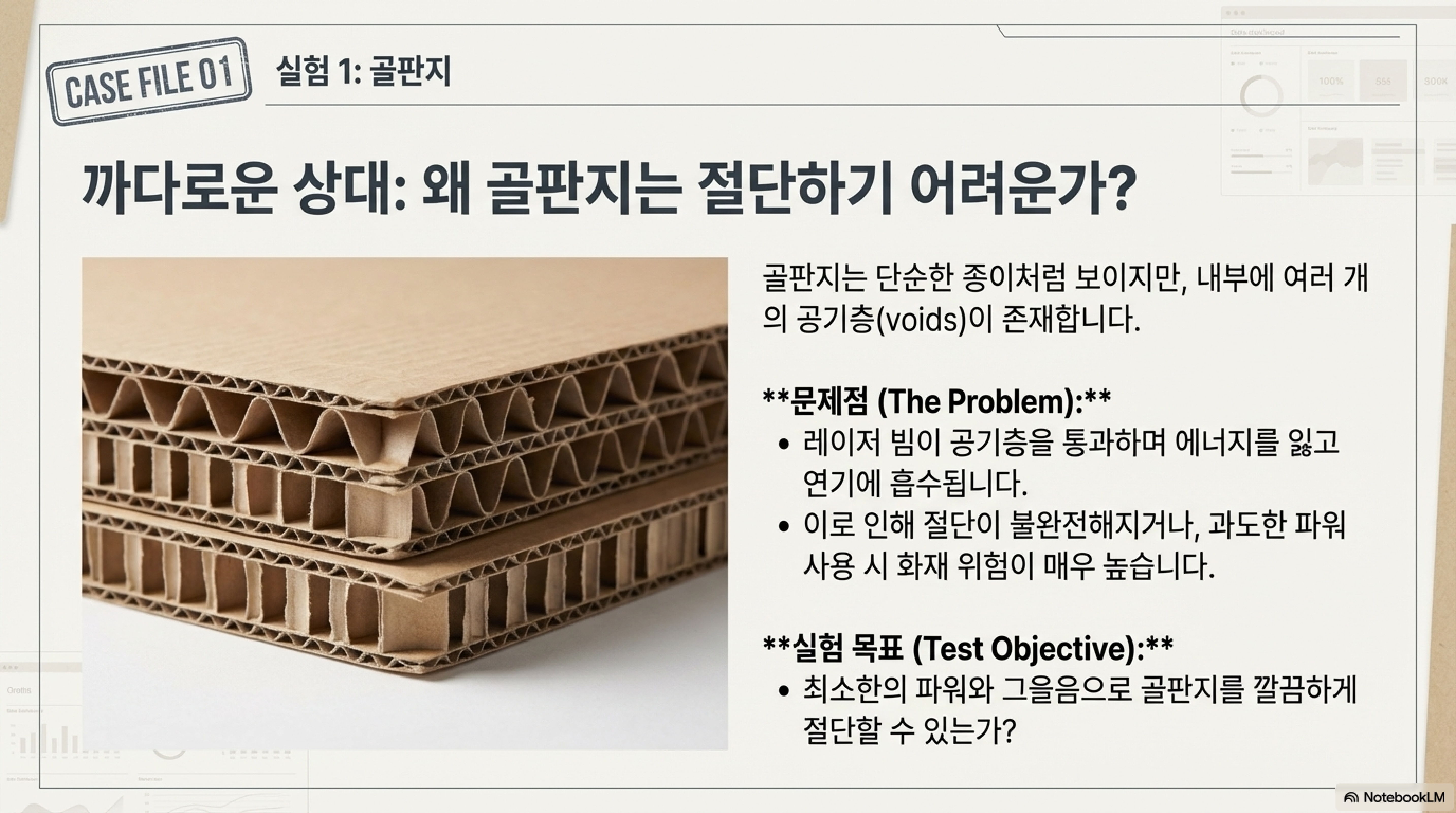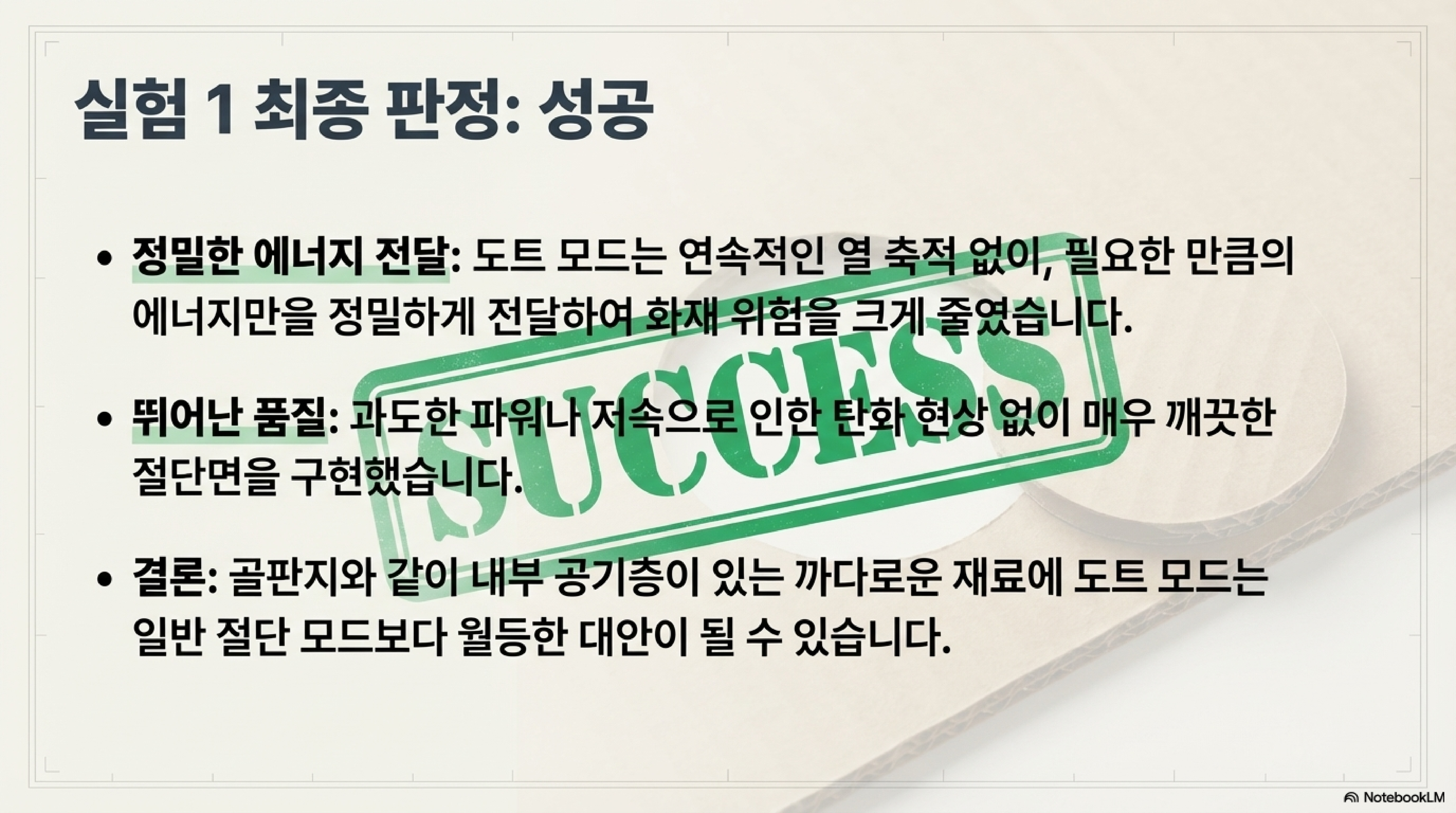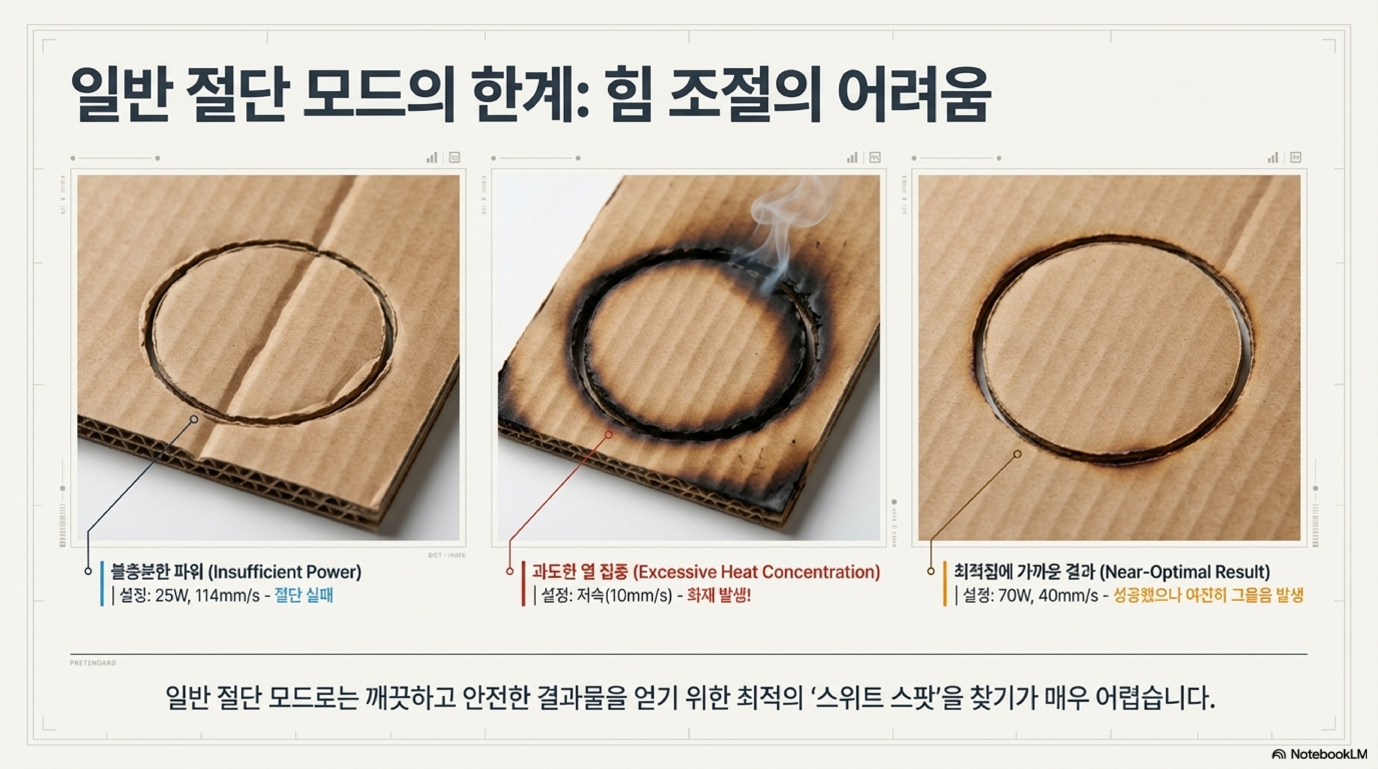 강한 출력은 해결책이 아니라 화재의 원인이 될 뿐입니다. 이처럼 골판지는 섬세한 제어가 필요한, 생각보다 훨씬 까다로운 재료입니다.