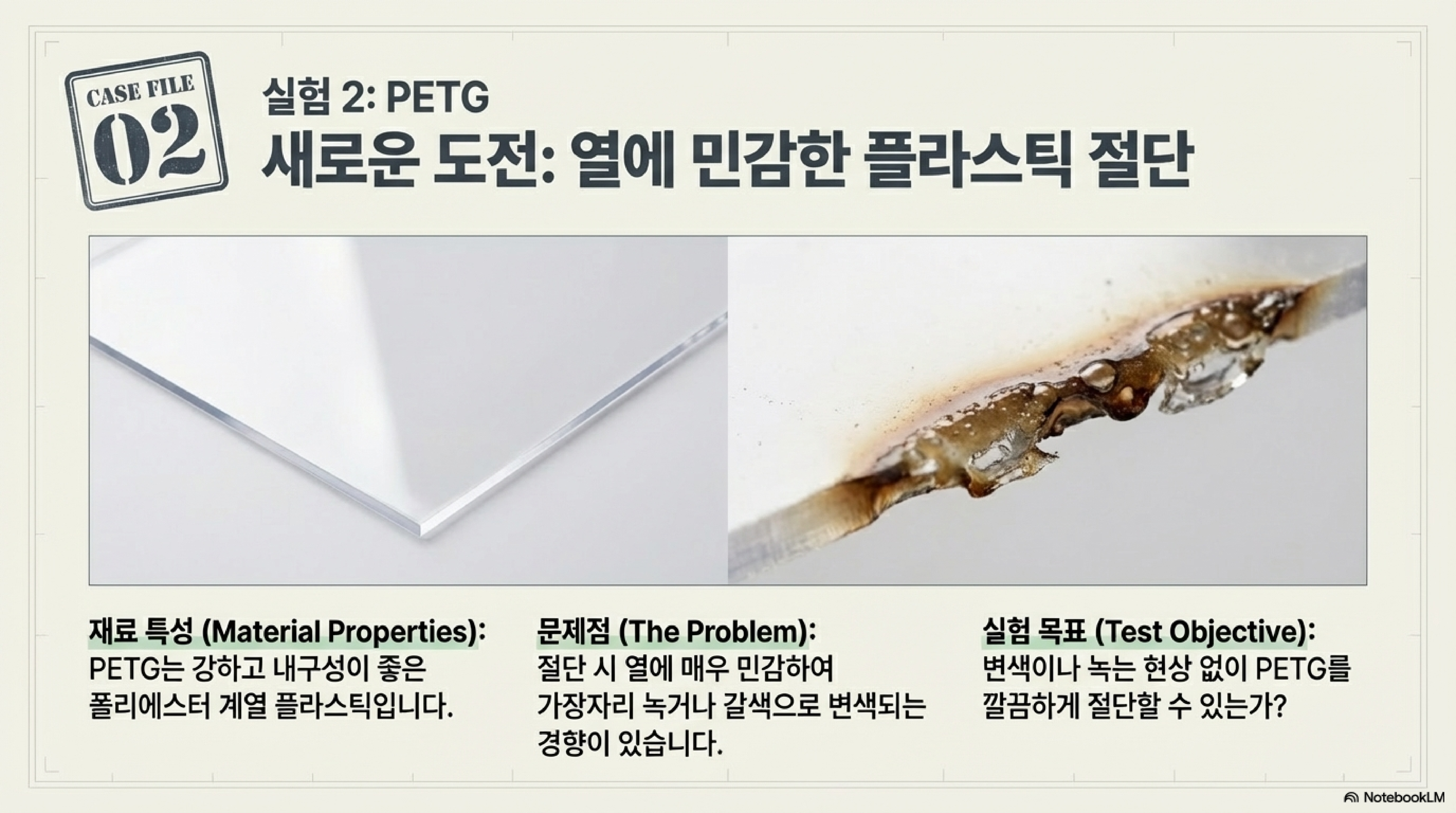 도트 모드의 능력은 골판지에만 국한되지 않습니다. 또 다른 까다로운 재료인 PETG(코폴리에스터)에서도 그 진가를 발휘합니다. PETG는 일반적으로 레이저 커팅 시 절단면이 타면서 갈색으로 변하는 경향이 있습니다.