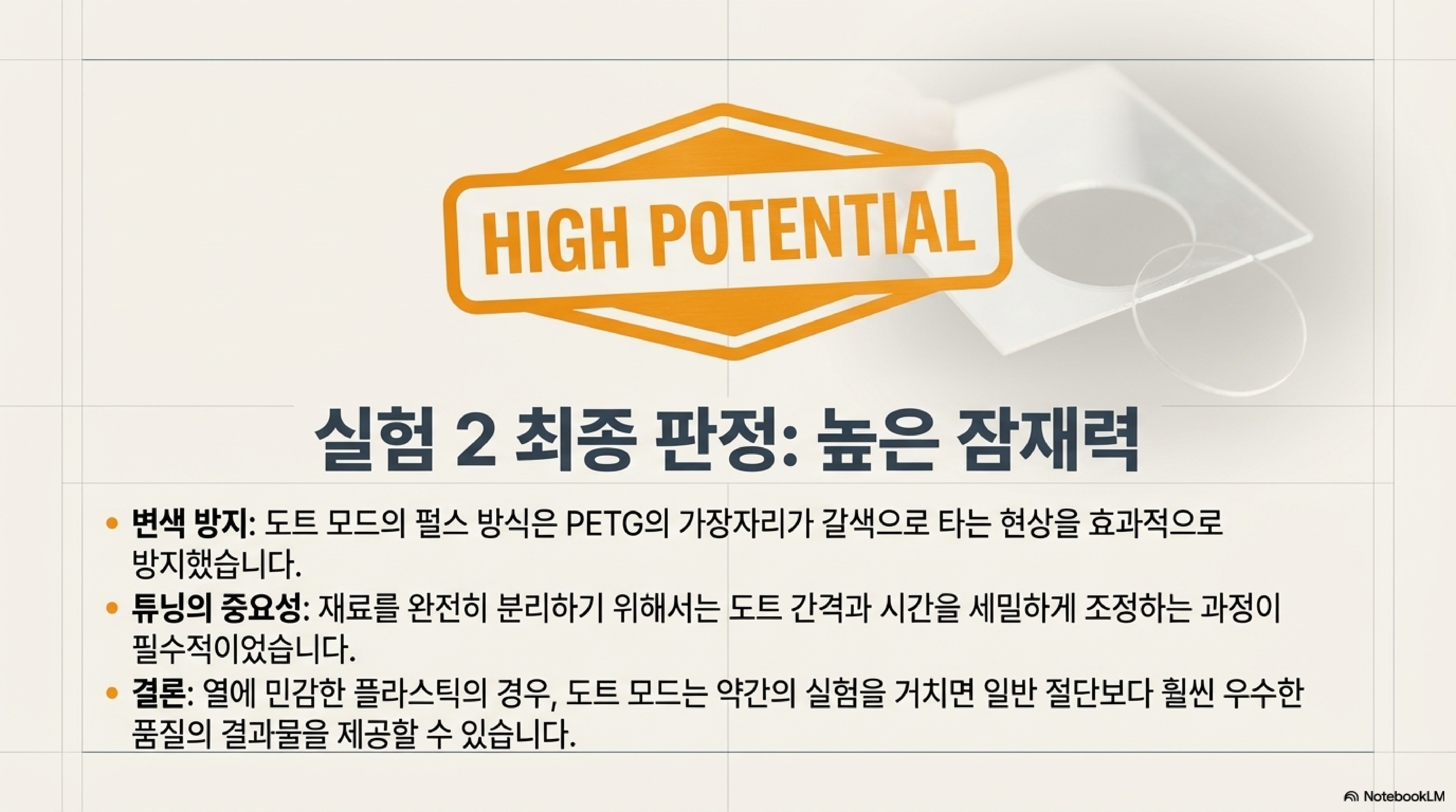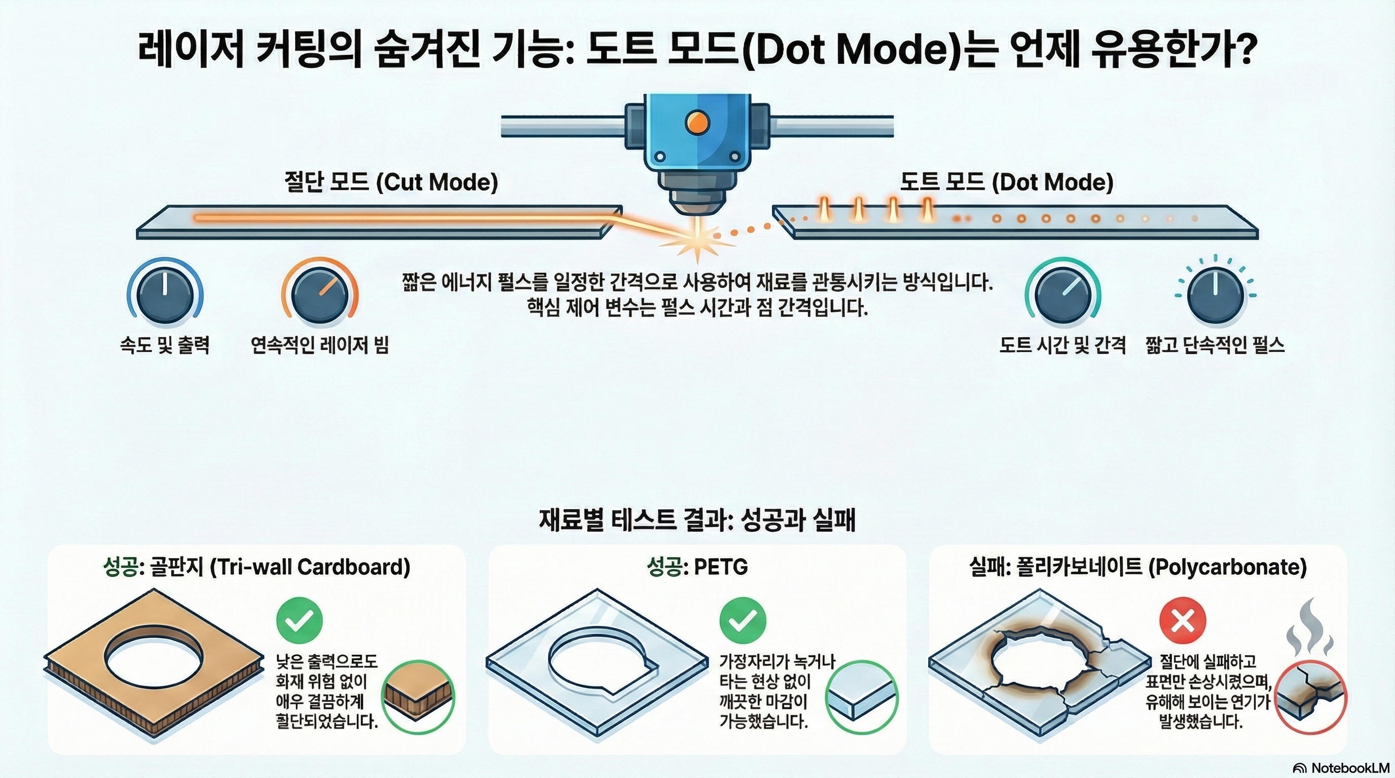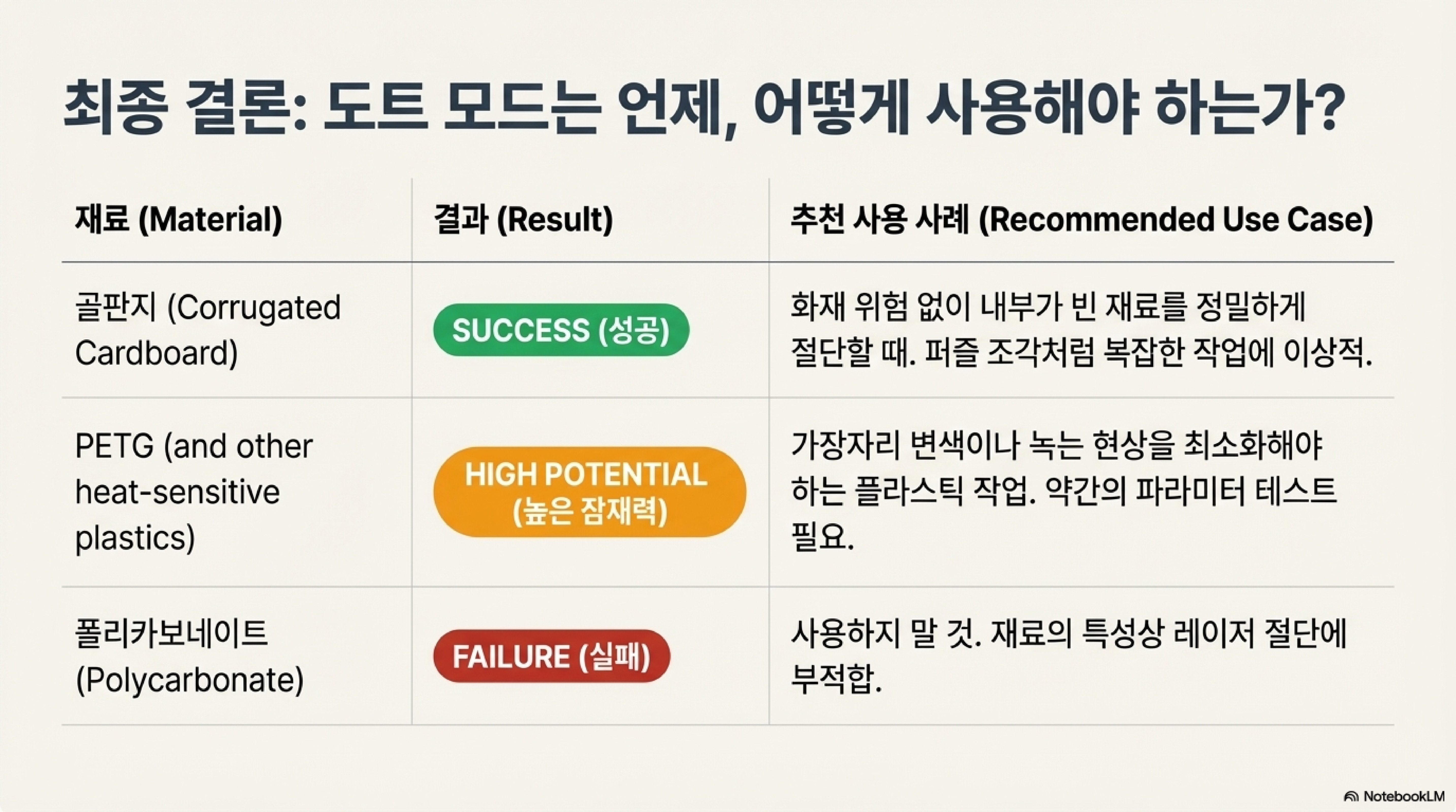 이처럼 도트 모드는 특정 상황에서 매우 강력한 도구이지만, 모든 재료에 통하는 마법 지팡이는 아닙니다. 재료에 대한 올바른 지식과 안전 수칙 준수는 그 무엇보다 중요합니다.