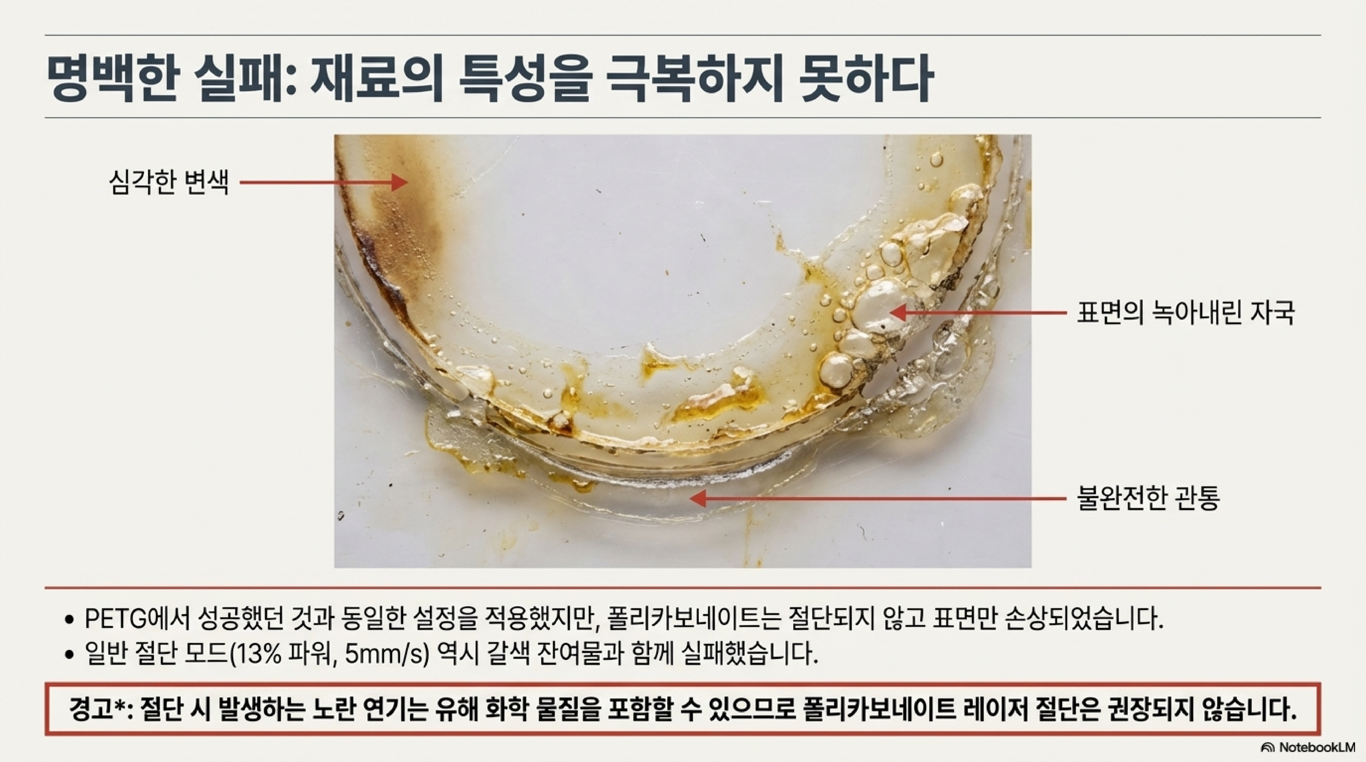 폴리카보네이트에 도트 모드를 적용한 결과는 "표면에 끔찍한 흔적"만 남긴 채 거의 잘리지 않는 완전한 실패였습니다. 더 심각한 것은 안전 문제입니다. 이 재료를 절단하자 "역한 냄새가 나는 연기"와 함께 "노란색 연기"가 피어올랐는데, 이는 황과 같은 유해 화학물질이 포함되어 있을 수 있다는 위험 신호입니다.