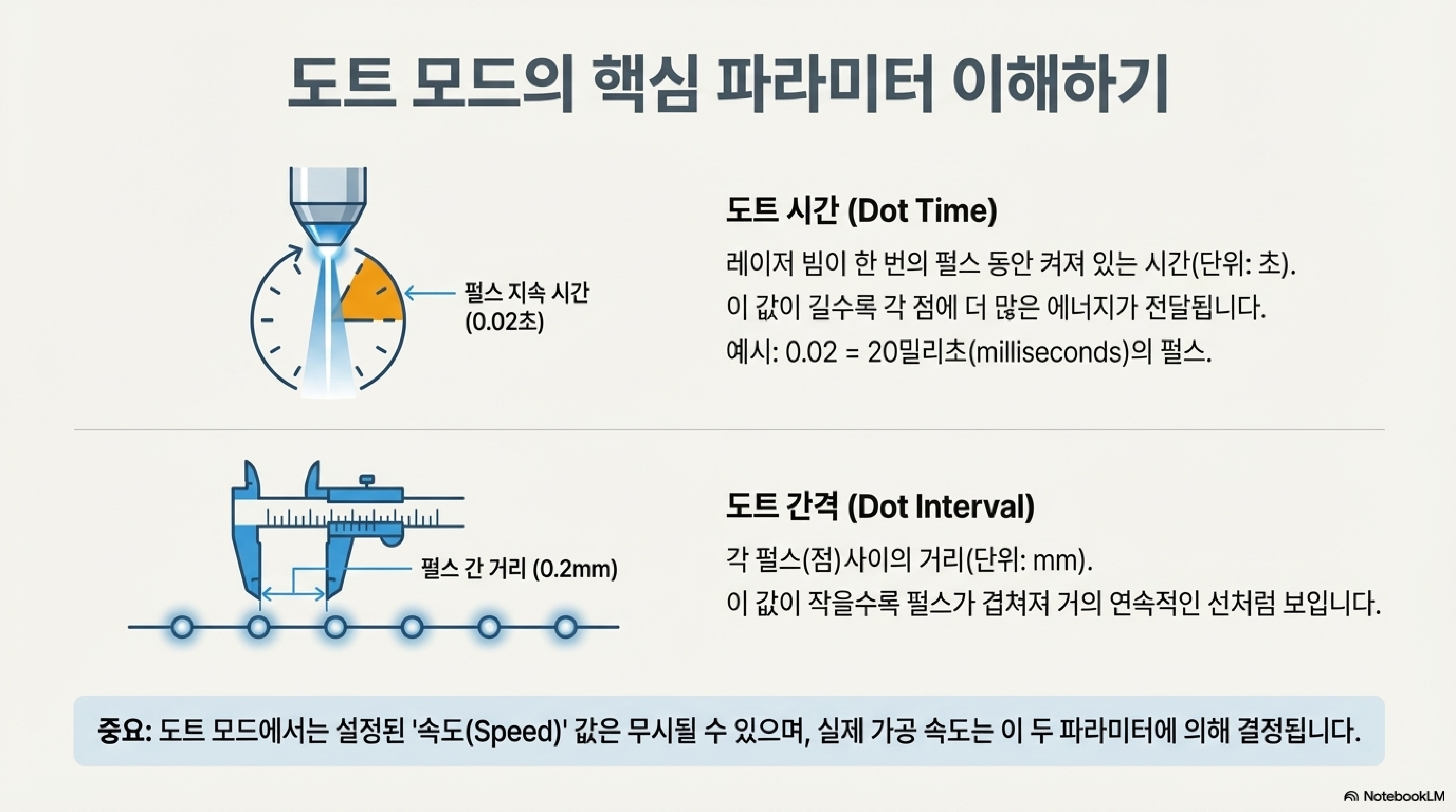 도트 모드의 속도를 실제로 제어하는 것은 '도트 시간(Dot time)'과 '도트 간격(Dot interval)'입니다. '도트 시간'은 레이저 펄스가 한 번 발사될 때 켜져 있는 시간을, '도트 간격'은 각 펄스 사이의 거리를 의미합니다. 본질적으로 '도트 간격' 설정이 레이저 펄스 사이의 물리적인 이동 거리를 결정하며, 이것이 바로 사용자 인터페이스의 주 '속도' 설정과 무관하게 실제 작업 속도를 정의하는 셈입니다.
