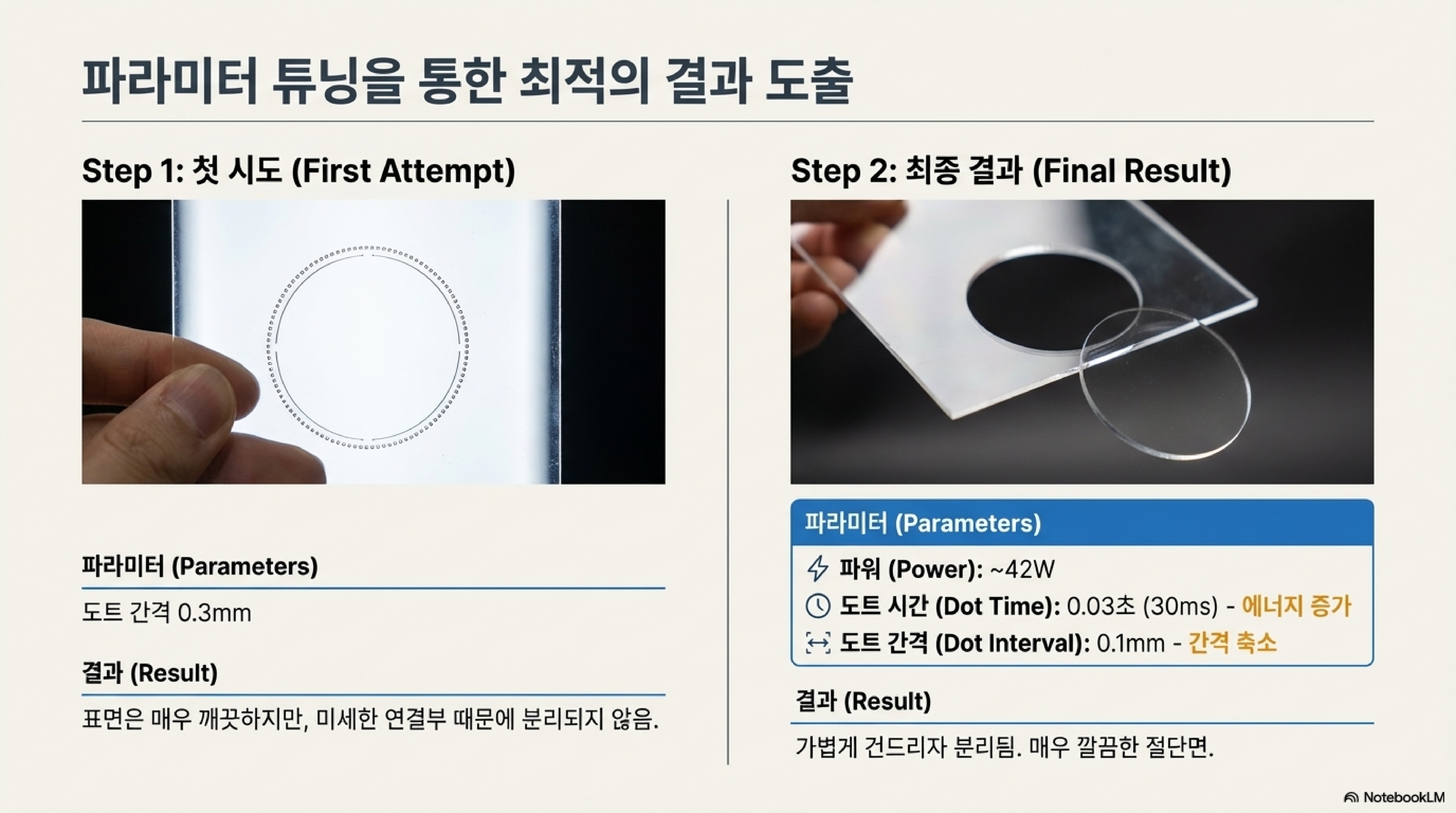 하지만 도트 모드를 사용하자 이런 문제 없이 "매우 훌륭한 마감"을 얻을 수 있었습니다. 물론 처음 시도에서는 절취선처럼 미세한 부분이 연결되어 조각이 바로 떨어지지는 않았습니다. 하지만 도트 간격을 0.1mm로 줄이고, 펄스 시간을 30밀리초로 늘리며, 출력을 약 42와트(W)까지 올리는 미세 조정을 통해 결국 깔끔하게 분리되는 결과물을 얻을 수 있었습니다. 이는 재료에 맞춰 최적의 값을 찾아가는 과정의 중요성을 보여줍니다.