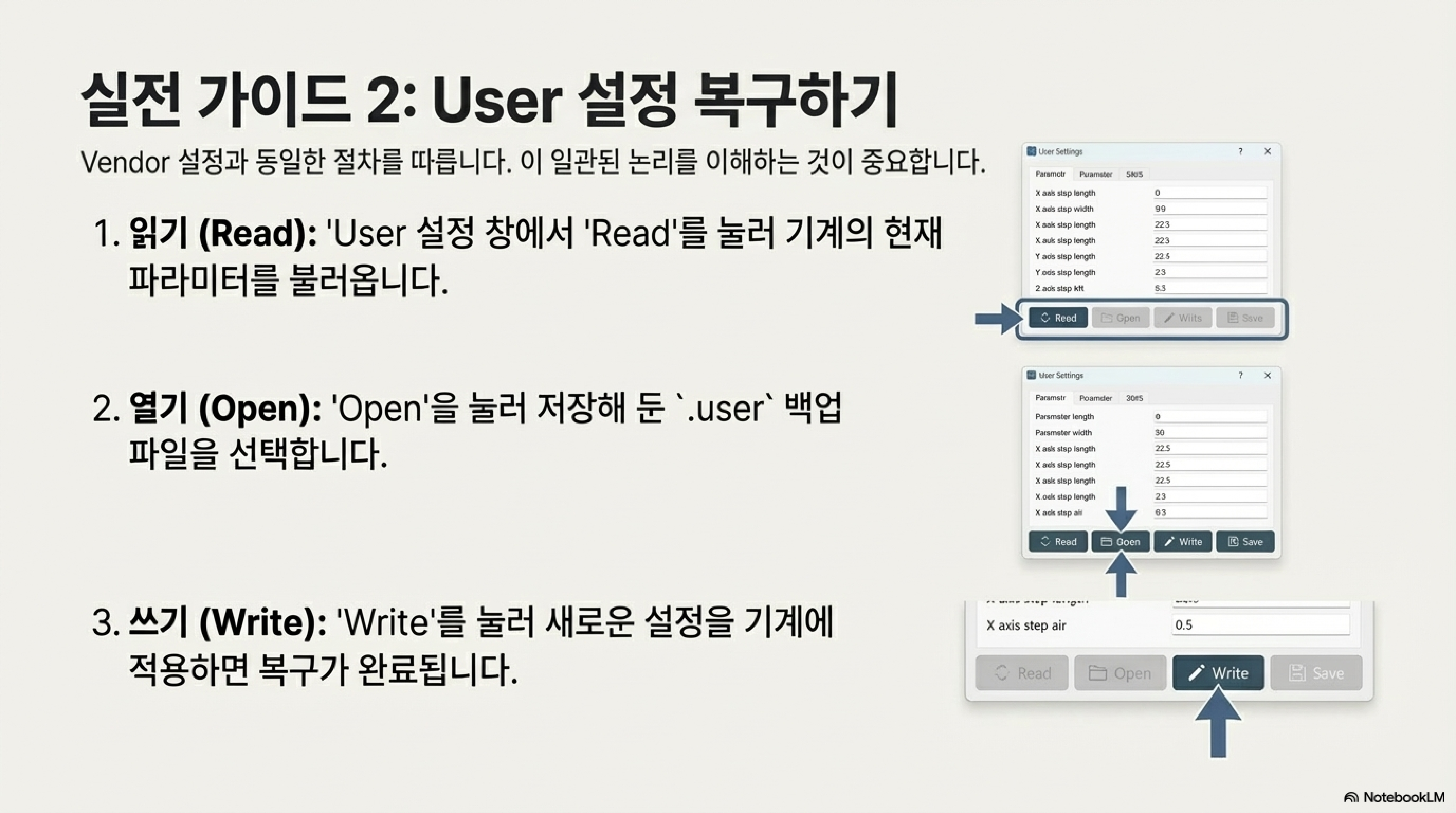 이것은 "매우 이상하고 복잡한 절차(a very strange and complicated procedure)"입니다. 가장 중요한 것은 '읽기(Read)' 버튼을 먼저 눌러야만 '열기(Open)'와 '쓰기(Write)' 버튼이 활성화된다는 점입니다. 먼저 '읽기(Read)'를 눌러 기계의 현재 (손상된) 설정 상태를 소프트웨어 메모리로 불러와야 합니다. 이 단계를 거쳐야만 소프트웨어가 덮어 쓸 준비를 마치고 '열기'와 '쓰기' 버튼을 활성화시킵니다. 이 순서를 기억하지 못하면, 소중한 백업 파일이 있어도 기계를 복구할 수 없습니다.