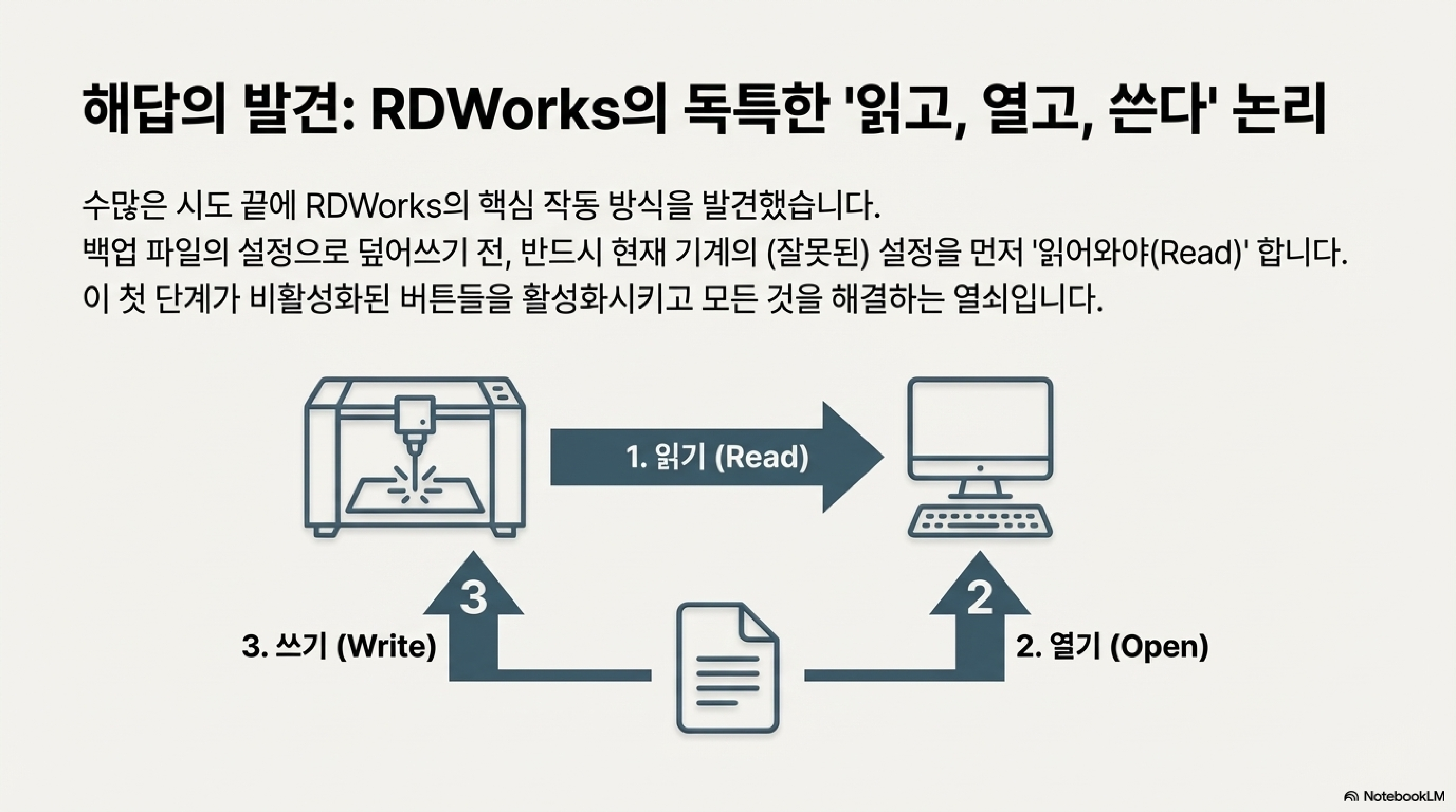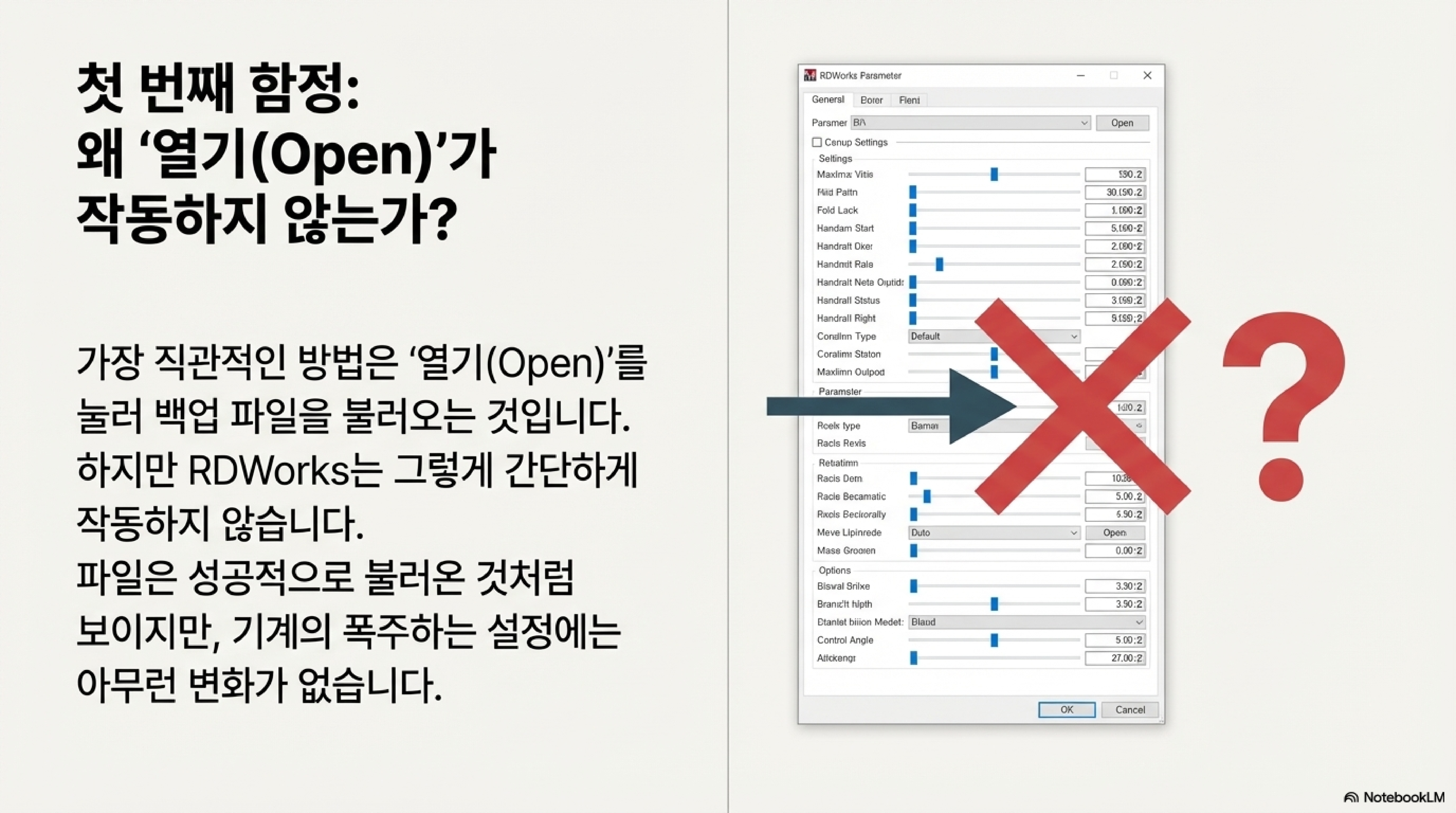 백업 파일이 있어도 안심하기는 이릅니다. RDWorks의 복원 과정은 매우 직관적이지 않아 또 다른 함정에 빠지기 쉽습니다. 대부분의 사용자는 백업 파일을 불러오기 위해 자연스럽게 '열기(Open)' 버튼을 먼저 누르려고 할 것입니다. 하지만 이는 잘못된 순서입니다.