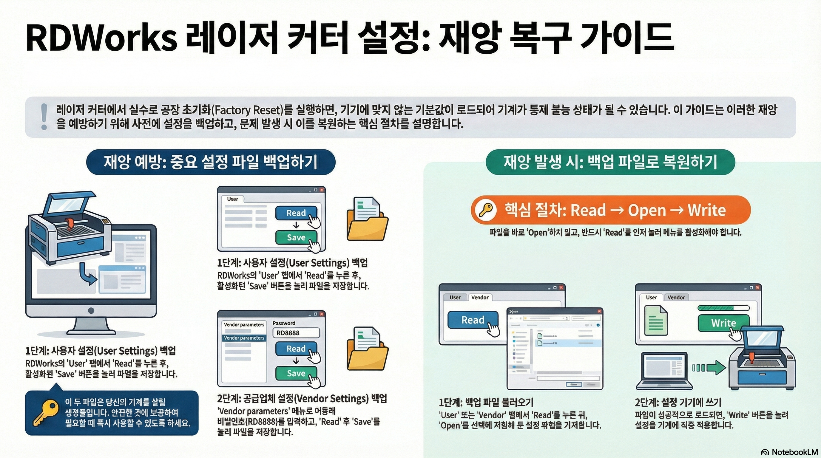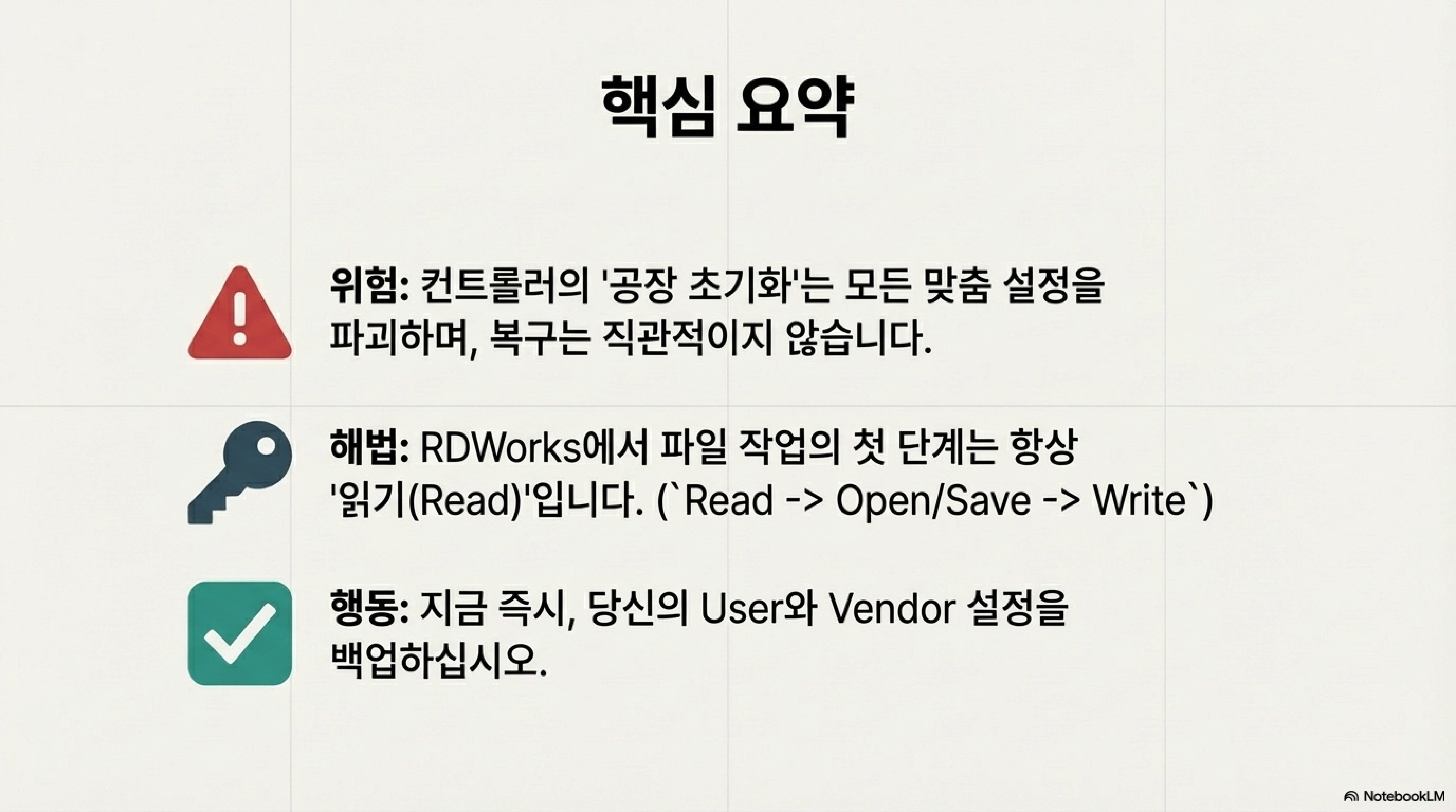 이 경험을 통해 얻은 가장 중요한 교훈은, 예기치 않은 시스템 오류나 치명적인 실수에 대비하는 유일하고 확실한 해결책은 바로 '사전 백업'이라는 것입니다. 제조사도, 기계의 펌웨어도 당신을 지켜주지 않습니다. 오직 당신이 직접 만들어 둔 백업 파일만이 유일한 보험입니다.