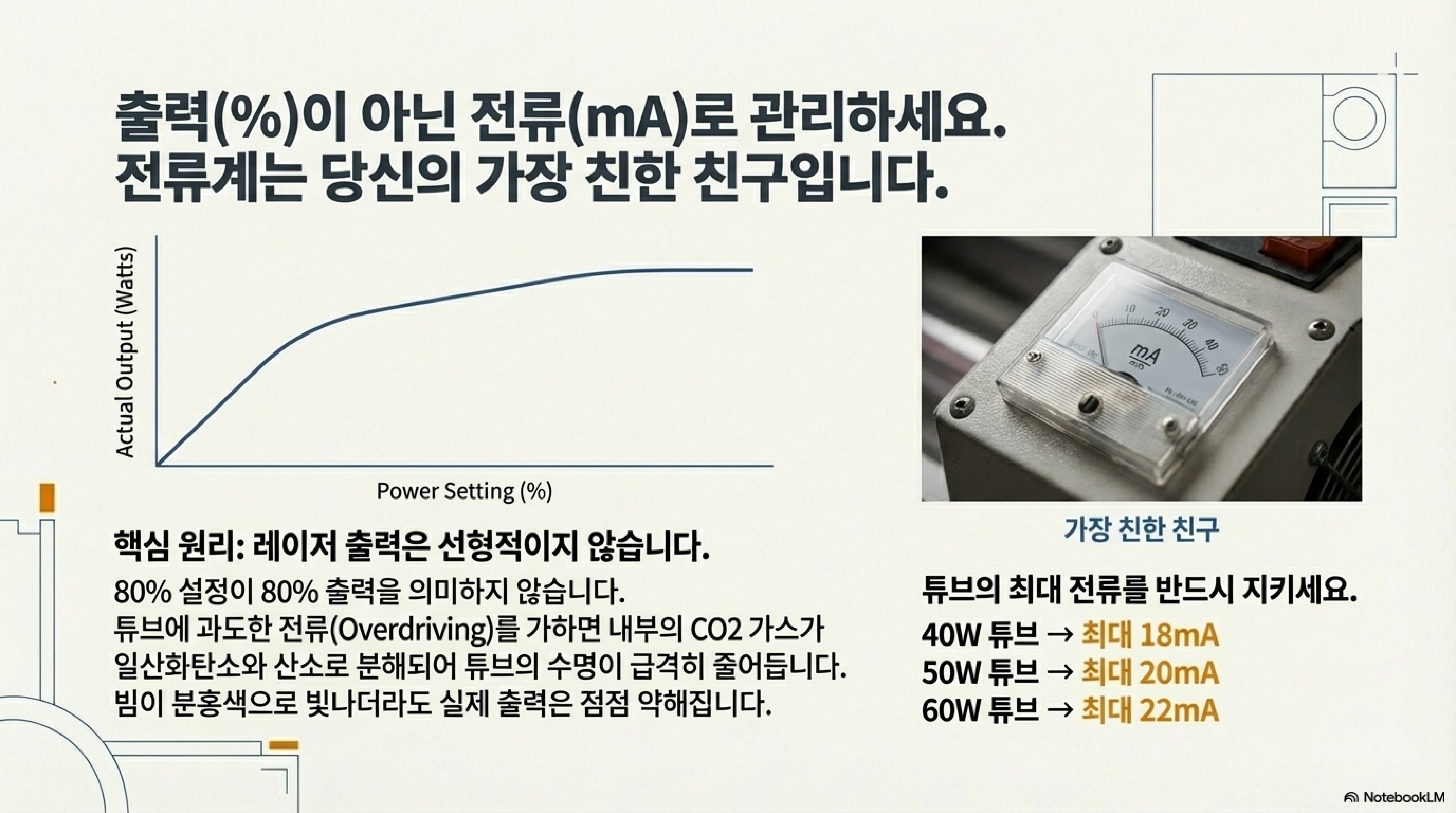 과학적으로, 과도한 전류는 튜브 내의 이산화탄소(CO2) 가스를 일산화탄소와 산소로 분해합니다. 이때 튜브는 질소 가스가 이온화되면서 여전히 분홍빛을 내지만, 정작 레이저를 생성하는 이산화탄소는 파괴되어 실제 레이저 출력은 점점 약해집니다. 분홍빛이 나온다고 해서 출력이 정상이라고 착각하기 쉬운, 매우 직관에 반하는 현상입니다.